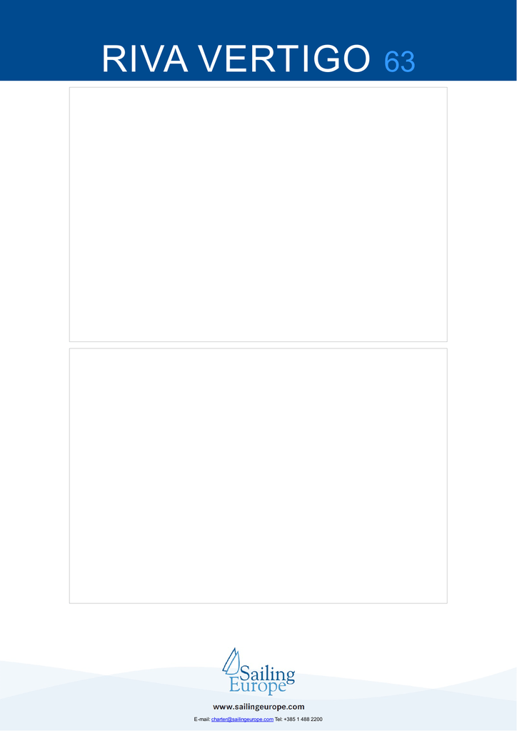 RIVA VERTIGO E-mail: [email protected] Tel: +385 1 488 2200 63 RIVA VERTIGO E-mail: [email protected] Tel: +385 1 488 2200 63 RIVA VERTIGO 63 Tehnical data Tutaj znajdziesz podstawowe informacje na temat naszych łodzi typu Riva Vertigo 63. Inne specyficzne parametry łodzi, jak typ ŻĄGLI i wyposażenie są zmienne w zależności od typu łodzi. Z tego powodu radzimy szukać konkretnej łodzi Riva Vertigo 63 w naszym katalogu, zgodnie z waszymi upodobaniami oraz miejscami, które planujecie odwiedzić. kabin Składane łóżko dodatkowe Długość Szerokość pokładu Zanurzenie Pojemność wodna Pojemność silnika Silnik Toalety 3+1 6 19,57 m 4,80 m 1,60 m 660,00 l 3200,00 l 2 x 1360 HP 3+1 Szczegóły wyglądu zewnętrznego łodzi, jej wyposażenia wewnątrz i układu kabin mogą w niektórych przypadkach różnić się od szczegółów przedstawionych na fotografiach. E-mail: [email protected] Tel: +385 1 488 2200