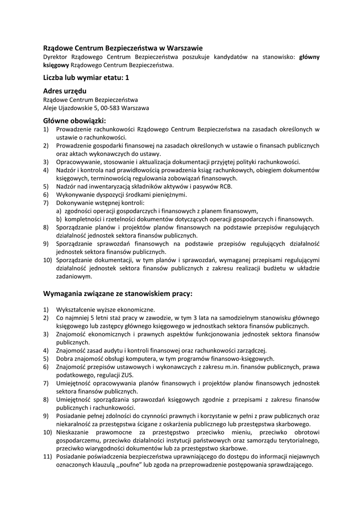 Rządowe Centrum Bezpieczeństwa w Warszawie Dyrektor Rządowego Centrum Bezpieczeństwa poszukuje kandydatów na stanowisko: główny księgowy Rządowego Centrum Bezpieczeństwa. Liczba lub wymiar etatu: 1 Adres urzędu Rządowe Centrum Bezpieczeństwa Aleje Ujazdowskie 5, 00-583 Warszawa Główne obowiązki: 1) Prowadzenie rachunkowości Rządowego Centrum Bezpieczeństwa na zasadach określonych w ustawie o rachunkowości. 2) Prowadzenie gospodarki finansowej na zasadach określonych w ustawie o finansach publicznych oraz aktach wykonawczych do ustawy. 3) Opracowywanie, stosowanie i aktualizacja dokumentacji przyjętej polityki rachunkowości. 4) Nadzór i kontrola nad prawidłowością prowadzenia ksiąg rachunkowych, obiegiem dokumentów księgowych, terminowością regulowania zobowiązań finansowych. 5) Nadzór nad inwentaryzacją składników aktywów i pasywów RCB. 6) Wykonywanie dyspozycji środkami pieniężnymi. 7) Dokonywanie wstępnej kontroli: a) zgodności operacji gospodarczych i finansowych z planem finansowym, b) kompletności i rzetelności dokumentów dotyczących operacji gospodarczych i finansowych. 8) Sporządzanie planów i projektów planów finansowych na podstawie przepisów regulujących działalność jednostek sektora finansów publicznych. 9) Sporządzanie sprawozdań finansowych na podstawie przepisów regulujących działalność jednostek sektora finansów publicznych. 10) Sporządzanie dokumentacji, w tym planów i sprawozdań, wymaganej przepisami regulującymi działalność jednostek sektora finansów publicznych z zakresu realizacji budżetu w układzie zadaniowym. Wymagania związane ze stanowiskiem pracy: 1) 2) Wykształcenie wyższe ekonomiczne. Co najmniej 5 letni staż pracy w zawodzie, w tym 3 lata na samodzielnym stanowisku głównego księgowego lub zastępcy głównego księgowego w jednostkach sektora finansów publicznych. 3) Znajomość ekonomicznych i prawnych aspektów funkcjonowania jednostek sektora finansów publicznych. 4) Znajomość zasad audytu i kontroli finansowej oraz rachunkowości zarządczej. 5) Dobra znajomość obsługi komputera, w tym programów finansowo-księgowych. 6) Znajomość przepisów ustawowych i wykonawczych z zakresu m.in. finansów publicznych, prawa podatkowego, regulacji ZUS. 7) Umiejętność opracowywania planów finansowych i projektów planów finansowych jednostek sektora finansów publicznych. 8) Umiejętność sporządzania sprawozdań księgowych zgodnie z przepisami z zakresu finansów publicznych i rachunkowości. 9) Posiadanie pełnej zdolności do czynności prawnych i korzystanie w pełni z praw publicznych oraz niekaralność za przestępstwa ścigane z oskarżenia publicznego lub przestępstwa skarbowego. 10) Nieskazanie prawomocne za przestępstwo przeciwko mieniu, przeciwko obrotowi gospodarczemu, przeciwko działalności instytucji państwowych oraz samorządu terytorialnego, przeciwko wiarygodności dokumentów lub za przestępstwo skarbowe. 11) Posiadanie poświadczenia bezpieczeństwa uprawniającego do dostępu do informacji niejawnych oznaczonych klauzulą ,,poufne” lub zgoda na przeprowadzenie postępowania sprawdzającego. Wymagane dokumenty i oświadczenia: życiorys i list motywacyjny, kopia dowodu osobistego lub oświadczenie o posiadaniu obywatelstwa polskiego, oświadczenia kandydata o korzystaniu z pełni praw publicznych oraz o niekaralności za przestępstwo popełnione umyślnie, oświadczenie kandydata o nieskazaniu za przestępstwo przeciwko mieniu, przeciwko obrotowi gospodarczemu, przeciwko działalności instytucji państwowych oraz samorządu terytorialnego, przeciwko wiarygodności dokumentów lub za przestępstwo skarbowe, życiorys zawodowy i list motywacyjny, z oświadczeniem kandydata o wyrażeniu zgody na przetwarzanie danych osobowych do celów rekrutacji, kopie dokumentów potwierdzających wykształcenie i inne kwalifikacje, kopia poświadczenia bezpieczeństwa uprawniającego do dostępu do informacji niejawnych oznaczonych klauzulą „poufne” lub oświadczenie o wyrażeniu zgody na przeprowadzenie postępowania sprawdzającego zgodnie z ustawą z dnia 5 sierpnia 2010 r. o ochronie informacji niejawnych, kopie świadectw pracy (służby). Warunki pracy Warunki dotyczące charakteru pracy na stanowisku i sposobu wykonywania zadań: stanowisko pracy zlokalizowane w pokojach biurowych, podstawowe wyposażenie na stanowisku to zestaw komputerowy z oprogramowaniem, większość czynności jest wykonywana w pozycji siedzącej, obsługa komputera powyżej 4 godzin na dobę, czas pracy podstawowy wymiar czasu pracy (8 godz.). Miejsce i otoczenie organizacyjno-techniczne stanowiska pracy Stanowisko pracy zlokalizowane jest w pokoju biurowym. Podstawowe wyposażenie stanowiska to: zestaw komputerowy, meble biurowe oraz elektryczne urządzenia biurowe. Siedziba RCB znajduje się w Al. Ujazdowskich 5 i jest budynkiem wielokondygnacyjnym, niewyposażonym w windy. Nie posiada podjazdów dla osób niepełnosprawnych. Szerokość głównych drzwi wejściowych do gmachu oraz ciągów komunikacyjnych jest dostosowana do potrzeb osób niepełnosprawnych. Centrum nie posiada transporterów przyschodowych. W budynku nie ma toalet przystosowanych dla osób niepełnosprawnych. RCB nie posiada miejsca parkingowego dla pracownika będącego osobą niepełnosprawną. Dokumenty należy składać w terminie do: 28 listopada 2014 r. pod adresem: Rządowe Centrum Bezpieczeństwa Kancelaria ogólna Al. Ujazdowskie 5, 00-583 Warszawa z dopiskiem: rekrutacja Główny księgowy Inne informacje: Oferty otrzymane po terminie (decyduje data wpływu) oraz oferty rozpatrzone negatywnie zostaną komisyjnie zniszczone. Kandydaci zakwalifikowani zostaną powiadomieni telefonicznie lub e-mailem o terminie kolejnego etapu postępowania rekrutacyjnego. Dodatkowe informacje można uzyskać pod nr. tel.: (0-22) 236 58 18.