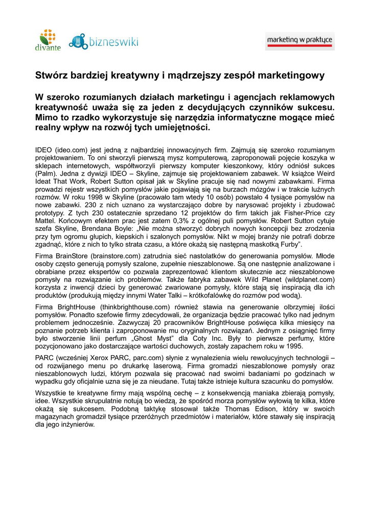 Stwórz bardziej kreatywny i mądrzejszy zespół marketingowy W szeroko rozumianych działach marketingu i agencjach reklamowych kreatywność uwaŜa się za jeden z decydujących czynników sukcesu. Mimo to rzadko wykorzystuje się narzędzia informatyczne mogące mieć realny wpływ na rozwój tych umiejętności. IDEO (ideo.com) jest jedną z najbardziej innowacyjnych firm. Zajmują się szeroko rozumianym projektowaniem. To oni stworzyli pierwszą mysz komputerową, zaproponowali pojęcie koszyka w sklepach internetowych, współtworzyli pierwszy komputer kieszonkowy, który odniósł sukces (Palm). Jedna z dywizji IDEO – Skyline, zajmuje się projektowaniem zabawek. W ksiąŜce Weird Ideat That Work, Robert Sutton opisał jak w Skyline pracuje się nad nowymi zabawkami. Firma prowadzi rejestr wszystkich pomysłów jakie pojawiają się na burzach mózgów i w trakcie luźnych rozmów. W roku 1998 w Skyline (pracowało tam wtedy 10 osób) powstało 4 tysiące pomysłów na nowe zabawki. 230 z nich uznano za wystarczająco dobre by narysować projekty i zbudować prototypy. Z tych 230 ostatecznie sprzedano 12 projektów do firm takich jak Fisher-Price czy Mattel. Końcowym efektem prac jest zatem 0,3% z ogólnej puli pomysłów. Robert Sutton cytuje szefa Skyline, Brendana Boyle: „Nie moŜna stworzyć dobrych nowych koncepcji bez zrodzenia przy tym ogromu głupich, kiepskich i szalonych pomysłów. Nikt w mojej branŜy nie potrafi dobrze zgadnąć, które z nich to tylko strata czasu, a które okaŜą się następną maskotką Furby”. Firma BrainStore (brainstore.com) zatrudnia sieć nastolatków do generowania pomysłów. Młode osoby często generują pomysły szalone, zupełnie nieszablonowe. Są one następnie analizowane i obrabiane przez ekspertów co pozwala zaprezentować klientom skutecznie acz nieszablonowe pomysły na rozwiązanie ich problemów. TakŜe fabryka zabawek Wild Planet (wildplanet.com) korzysta z inwencji dzieci by generować zwariowane pomysły, które stają się inspiracją dla ich produktów (produkują między innymi Water Talki – krótkofalówkę do rozmów pod wodą). Firma BrightHouse (thinkbrighthouse.com) równieŜ stawia na generowanie olbrzymiej ilości pomysłów. Ponadto szefowie firmy zdecydowali, Ŝe organizacja będzie pracować tylko nad jednym problemem jednocześnie. Zazwyczaj 20 pracowników BrightHouse poświęca kilka miesięcy na poznanie potrzeb klienta i zaproponowanie mu oryginalnych rozwiązań. Jednym z osiągnięć firmy było stworzenie linii perfum „Ghost Myst” dla Coty Inc. Były to pierwsze perfumy, które pozycjonowano jako dostarczające wartości duchowych, zostały zapachem roku w 1995. PARC (wcześniej Xerox PARC, parc.com) słynie z wynalezienia wielu rewolucyjnych technologii – od rozwijanego menu po drukarkę laserową. Firma gromadzi nieszablonowe pomysły oraz nieszablonowych ludzi, którym pozwala się pracować nad swoimi badaniami po godzinach w wypadku gdy oficjalnie uzna się je za nieudane. Tutaj takŜe istnieje kultura szacunku do pomysłów. Wszystkie te kreatywne firmy mają wspólną cechę – z konsekwencją maniaka zbierają pomysły, idee. Wszystkie skrupulatnie notują bo wiedzą, Ŝe spośród morza pomysłów wyłowią te kilka, które okaŜą się sukcesem. Podobną taktykę stosował takŜe Thomas Edison, który w swoich magazynach gromadził tysiące przeróŜnych przedmiotów i materiałów, które stawały się inspiracją dla jego inŜynierów. Zgromadzenie pomysłów swoich pracowników jest niewątpliwym kapitałem firmy. Kapitał ten moŜna jeszcze lepiej wykorzystać gdy wszyscy pracownicy mają do wiedzy ten dostęp. Umiejętność sięgania do wiedzy jest podstawą wielu sukcesów. Inna nowatorska firma - Edge Innovations (edgefx.com) zasłynęła z hiperrealistycznych mechanicznych stworów na potrzeby przemysłu filmowego. Stworzyli między innymi orkę o wymiarach 1:1 na potrzeby filmu Uwolnić orkę. Model był tak realistyczny, Ŝe nikt nie był w stanie rozpoznać kiedy na ekranie pojawia się prawdziwa orka a kiedy jej mechaniczny sobowtór. Edge byli w stanie stworzyć nową jakość w filmowych efektach specjalnych dzięki najnowocześniejszej technologii z którą załoŜyciele Edge spotkali się pracują w IDEO. Edge pełniło zatem rolę brokera informacji pomiędzy przemysłem filmowy a twórcami najnowocześniejszych technologii. Przedstawione tu obserwacje moŜna traktować jako kierunek dla wszystkich, którzy tworzą zespoły opierające duŜą część swojej pracy na kreatywności. Pracując w agencji reklamowej, firmie informatycznej i agencji interaktywnej wielokrotnie spotykałem się z koniecznością wygenerowania nowatorskich rozwiązań. Bardzo rzadko budowaliśmy jednak coś więcej niŜ tylko jednorazowe rozwiązanie problemu klienta. Większość pomysłów jakie się pojawiały przepadała wraz z upływem czasu, zmianami kadrowymi. By zapobiegać temu procesowi zainteresowałem się zarządzaniem wiedzą. Dziedzina ta została wynaleziona przez firmy konsultingowe dla których wiedza jest produktem. Firmy te jako pierwsze zaczęły teŜ wspomagać zarządzanie wiedzą systemami informatycznymi, tworząc procesy zarządzania wiedzą i bazy wiedzy. W kolejnych latach zarządzanie wiedzą rozrosło się do rangi odrębnej dziedziny wiedzy. Tworzono kompleksowe systemy – od poziomu zarządzania i motywacji po poziom techniczny, które miały słuŜyć polepszeniu wymiany wiedzy w firmie. Systemy takie wdroŜono między innymi w Banku Światowym, AT&T, GlaxoSmithKline, Hewlett Packard, IBM, Skandia, Ford, Motorola, Lockheed Martin, Siemens, Nokia, British Telecom, Vodafone. Nie zawsze jednak droga jaką obierają korporacje jest najlepsza. Tworzenie zbyt rozbudowanych systemów utrudnia korzystanie z nich i w efekcie zniechęca do dzielenia się wiedzą. Pracując w Janmedia, zajmowałem się usability przez cztery lata. Wiem jak niewiele potrzeba b