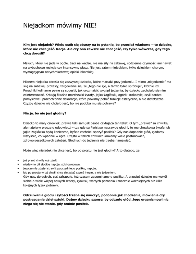 Niejadkom mówimy NIE! Kim jest niejadek? Wielu osób się oburzy na to pytanie, bo przecież wiadomo – to dziecko, które nie chce jeść. Racja. Ale czy ono zawsze nie chce jeść, czy tylko wówczas, gdy tego chcą dorośli? Maluch, który nie jada w ogóle, traci na wadze, nie ma siły na zabawę, codzienne czynności ani nawet na wybuchowe reakcje czy intensywny płacz. Nie jest zatem niejadkiem, tylko dzieckiem chorym, wymagającym natychmiastowej opieki lekarskiej. Mianem niejadka określa się zazwyczaj dziecko, które marudzi przy jedzeniu. I mimo „niejedzenia” ma siłę na zabawę, protesty, targowanie się, że „tego nie zje, a tamto tylko spróbuje”, kłótnie itd. Poradniki kulinarne pełne są sugestii, jak urozmaicić wygląd jedzenia, by dziecko zechciało się nim zainteresować. Królują fikuśne marchewki-żyrafy, jajka-żaglówki, ogórki-krokodyle, czyli bardzo pomysłowe i pracochłonne dekoracje, które powinny pełnić funkcje estetyczne, a nie dietetyczne. Czyżby dziecko nie chciało jeść, bo nie podoba mu się potrawa? Nie je, bo nie jest głodny? Dziecko to mały człowiek, prawie taki sam jak osoba czytająca ten tekst. O tym „prawie” za chwilkę, ale najpierw proszę o odpowiedź – czy gdy są Państwo naprawdę głodni, to marchewkowa żyrafa lub jajko-żaglówka będą konieczne, byście zechcieli spożyć posiłek? Gdy nas dopadnie głód, zjadamy wszystko, co wpadnie w ręce. Często w takich chwilach łamiemy wiele postanowień, zdroworozsądkowych założeń. Głodnych do jedzenia nie trzeba namawiać. Może więc niejadek nie chce jeść, bo po prostu nie jest głodny? A to dlatego, że: już przed chwilą coś zjadł, niedawno pił słodkie napoje, soki owocowe, jeszcze nie zdążył strawić poprzedniego posiłku, napoju, lub po prostu w tej chwili chce się zająć czymś innym, a nie jedzeniem. Gdy nas, dorosłych, coś zafrapuje, też czasem zapominamy o posiłku. A przecież dziecko ma wokół siebie o wiele więcej nowych rzeczy, zjawisk, wartych poznania i znacznie ważniejszych niż kilka kolejnych łyżek potrawy. Odczuwania głodu i sytości trzeba się nauczyć, podobnie jak chodzenia, mówienia czy postrzegania dzieł sztuki. Dajmy dziecku szansę, by odczuło głód. Jego organizmowi nic złego się nie stanie, gdy ominie posiłek. A może przekarmiony? Mały człowiek, prawie taki jak dorosły, powinien zjadać posiłki prawie takie jak opiekunowie, tylko mniejsze. Przekarmiany, nie ma ochoty na więcej. Normalne – prawda? Łatwo się pogubić w ilości podawanego pokarmu, zwłaszcza gdy nad posiłkami czuwa zamiennie kilka osób. Dlatego warto np. zapisywać, co dziecko zjadło, by zbilansować jego całodzienny jadłospis. Można to też fotografować, uwzględniając wszystko łącznie z napojami – każdy kęs, cukierek, ciasteczko, łyżeczkę serka, kilka łyków soku itd. Zwróćmy przy okazji na częstotliwość jedzenia. Czas trawienia posiłku zajmuje około 3 godzin. Może on się wydłużyć w zależności od składu potrawy, np. składniki tłuste trawimy dłużej. Dlatego nie należy dokarmiać dziecka co godzinę czy dwie, tylko pozwolić, by jego organizm poradził sobie z poprzednią porcją jedzenia, nim dostarczymy mu kolejną. Nawet pół jabłuszka, kilka winogron czy porcja soku owocowego to już coś, z czym żołądek musi się zmagać! Bystry manipulant Mały człowiek uczy się, naśladując dorosłych. Nawet gdy nie rozumie znaczenia poszczególnych słów czy zdań, to już odbiera emocje otaczających osób. Gdy rodzice są spokojni, lubią jeść i przy stole panuje spokojna atmosfera, udzieli się to dziecku. Jeśli jednak ktoś demonstruje np. niechęć do jakiejś potrawy, maluch zacznie go naśladować, nawet nie rozumiejąc, po co to robi. Co gorsza, może rozszerzyć to zachowanie ogólnie na czynność jedzenia. Rozważmy też następujące sytuacje: gdy dziecko odmawia jedzenia, natychmiast ktoś się nim zajmuje, nakłania, czyli poświęca mu czas, gdy dziecko grzecznie wszystko „sprzątnie” z talerza, dorośli odchodzą do swoich zajęć, a mały człowiek musi sam się bawić. Które zachowanie wybrać, by zapewnić sobie uwagę opiekunów? No właśnie – lepiej nie jeść! Wybredny i powolny Grzebiący godzinami w talerzu niejadek, wybierający produkty, na które ma chęć, a których stanowczo odmawia, to też zmartwienie wielu rodziców. Długie „nasiadówki” przy posiłkach są nie do pomyślenia w sytuacjach, gdy o żywność trzeba walczyć, porcje są małe, a chętnych wielu. I wcale nie chodzi tu o cierpiące głód afrykańskie dzieci czy wychowanków strasznych przytułków. Tak dzieje się i u nas, np. podczas dzielenia na dziecięcej imprezie czekolady, tortu, lodów, frytek itp. Zamiast zmuszania siłą do jedzenia, lepiej wybrednemu, powolnemu niejadkowi ograniczyć czas spożywania posiłku, oczywiście uprzednio informując go o tym. Przydatnym urządzeniem, ładnie obrazującym upływ czasu, jest mechaniczny kuchenny minutnik. Dajemy dziecku np. pół godziny na zjedzenie porcji. Dorośli się nim w tym czasie nie zajmują, niech maluch robi co chce. Gdy minutnik zadzwoni, sprzątamy talerze niezależnie od ilości zjedzonego dania. Pomagamy niejadkowi – strategia działania Dorośli domownicy opracowują wspólną strategię, której wszyscy bezwzględnie przestrzegają: Ustalamy godziny posiłków i pilnujemy ich. Pomiędzy posiłkami można się napić wody. Po kilkunastu dniach organizm dziecka zacznie reagować uczuciem głodu o określonych godzinach. Ustalamy miejsce spożywania posiłków. Wszyscy domownicy jedzą tylko tam, nie zajmując się przy tym innymi czynnościami. Pozwalamy dziecku zjeść tyle, na ile ma ochotę. Jeśli zje za mało, nadrobi braki podczas kolejnego posiłku. Odejście od stołu uważamy zawsze za sygnał zakończenia jedzenia i zabieramy niedokończone danie. Jeśli to konieczne, ustalamy czas trwania posił
