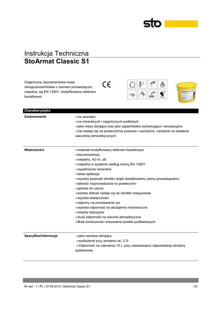 Instrukcja Techniczna StoArmat Classic S1 Organiczna, bezcementowa masa zbrojąca/szachlówka z ziarnem prowadzącym, niepalna, wg EN 13501, modyfikowana włóknem bazaltowym Charakterystyka Zastosowanie • na zewnątrz • na mineralnych i organicznych podłożach • jako masa zbrojąca oraz jako szpachlówka wyrównująca i renowacyjna • nie nadaje się na powierzchnie poziome i nachylone, narażone na działanie warunków atmosferycznych Właściwości • materiał modyfikowany włóknem bazaltowym • bezcementowy • niepalny, A2-s1, d0 • niepalna w systemie według normy EN 13501 • wypełniacze mineralne • łatwa aplikacja • wysoka pewność obróbki dzięki dodatkowemu ziarnu prowadzącemu • łatwość rozprowadzania na powierzchni • gotowa do użycia • bardzo dobrze nadaje się do obróbki maszynowej • wysoka elastyczność • odporny na powstawanie rys • wysoka odporność na obciążenia mechaniczne • otwarty dyfuzyjnie • duża odporność na warunki atmosferyczne • Brak konieczności stosowania powłok podkładowych Specyfika/informacje • jako warstwa zbrojąca • wydłużenie przy zerwaniu ok. 2 % • Odpornosć na uderzenia 15 J przy zastosowaniu odpowiedniej struktury systemowej Nr wer.: 1 / PL / 27.05.2015 / StoArmat Classic S1 1/5 Instrukcja Techniczna StoArmat Classic S1 Dane techniczne Kryterium Gęstość Równoważna dyfuzyjnie grubość warstwy powietrza Współczynnik przepuszczalności wody w Współczynnik. oporu dyfuzyjnego pary wodnej µ Reakcja na ogień (klasa) Norma/ przepis Wartość/ kontrolny Jednostka PN-EN ISO 2811 Informacje 1,65 - 1,75 g/cm³ V2 średni EN ISO 7783-2 EN 1062 -3 0,3 - 0,5 m < 0,05 kg/(m²*h0,5) W3 mała EN ISO 7783-2 200 - 300 V2 średni EN 13501-1 A2-s1, d0 niepalny Podane parametry są wartościami średnimi albo przybliżonymi. Z uwagi na zastosowanie w naszych produktach naturalnych surowców, rzeczywiste wartości w poszczególnych dostawach mogą nieznacznie odbiegać od podanych, co jednak nie ma wpływu na przydatność produktu. Podłoże Wymagania Podłoże musi być solidne, równe, suche, wytrzymałe oraz wolne od tłuszczu i pyłu. Jeżeli to konieczne przydatność sposobu mocowania powinna być jeszcze raz sprawdzona na budowie. Wilgotne lub niecałkowicie związane podłoże może prowadzić do uszkodzeń kolejnych powłok, powodując powstawanie pęcherzy i zarysowań. Przygotowania Sprawdzić poprawność naniesienia i nośność poprzednich powłok. Usunąć powłoki o niedostatecznej nośności. Jeśli to konieczne, należy oczyścić podłoże. Aplikacja Temperatura aplikacji najniższa temperatura podłoża i powietrza: +5 °C Najwyższa temperatura podłoża i powietrza: +30 °C Nr wer.: 1 / PL / 27.05.2015 / StoArmat Classic S1 2/5 Instrukcja Techniczna StoArmat Classic S1 Przygotowanie materiału Gotowa do obróbki, w razie potrzeby po pierwszym wymieszaniu można rozcieńczyć niewielką ilością wody w celu uzyskania konsystencji odpowiedniej do obróbki. Zużycie Rodzaj zastosowania Zużycie ok. zbrojenie płyt styropianowych 3,50 - 4,50 kg/mX zbrojenie na płytach z wełny mineralnej 4,50 - 6,50 kg/mX Wyrównanie (spachlówką drobnoziarnistą) 1,50 - 2,00 kg/mX Zużycie materiału uzależnione jest między innymi od obróbki, podłoża oraz konsystencji. Podane wartości dotyczące zużycia służą jedynie orientacji. Dokładne wartości dotyczące zużycia należy ustalić na miejscu, dla danego obiektu. Aplikacja ręcznie, maszynowo Zbrojenie na płytach izolacyjnych z wełny mineralnej W pierwszym cyklu roboczym za pomocą gładkiej pacy ze stali nierdzewnej lub maszynowo nanieść cienką warstwę produktu, wgnieść w płytę izolacyjną, a następnie mocno wetrzeć. Po wyschnięciu pierwszej warstwy nanieść tynk podkładowy na płytę izolacyjną opcjonalnie ręcznie lub maszynowo. Siatkę w górnej warstwie zbrojenia całkowicie osadzić w wilgotnej jeszcze masie zbrojącej. Pasy siatki powinny nachodzić na siebie na 10 cm. Zbrojenie na płytach styropianowych EPS Produkt nanosić ręcznie pacą gładką ze stali nierdzewnej lub maszynowo. Siatkę w górnej warstwie zbrojenia całkowicie osadzić w wilgotnej jeszcze masie zbrojącej. Pasy siatki powinny nachodzić na siebie na 10 cm. Zalecenie: W narożnikach otworów okiennych, drzwiowych itp. układać siatkę ukośnie. Schnięcie, twardnienie, czas oczekiwania do ponownej obróbki Czas schnięcia uzależniony jest od temperatury, wiatru i względnej wilgotności powietrza. W przypadku niekorzystnych warunków pogodowych należy względem świeżo naniesionych powierzchni przedsięwziąć odpowiednie środki ochronne (np. ochrona przed deszczem). Przy temperaturze powietrza i podłoża +20 °C i wilgotno ści względnej 65 % Nr wer.: 1 / PL / 27.05.2015 / StoArmat Classic S1 3/5 Instrukcja Techniczna StoArmat Classic S1 następną warstwę nanosić najwcześniej po 24 godzinach. Czyszczenie narzędzi Wyczyścić wodą natychmiast po użyciu. Informacje, zalecenia, szczególne informacje, pozostałe W celu uzyskania dodatkowych informacji dotyczących aplikacji należy zapoznać się z wytycznymi dla danego systemu. W przypadku nanoszenia zbrojenia w zimnych i wilgotnych porach roku zaleca się stosowanie produktów w wersji QS. Dostawa Odcień biały, barwiony w ograniczonym zakresie systemu StoColor Opakowanie Wiadro Składowanie Warunki magazynowania Przechowywać w szczelnie zamkniętym opakowaniu i chronić przed mrozem. Chronić przed wysoką temperaturą i bezpośrednim promieniowaniem słonecznym. Okres magazynowania Najwyższa jakość produktu przechowywanego w oryginalnym opakowaniu gwarantowana jest do końca okresu ważności. Data ważności jest zawarta w numerze serii na opakowaniu. Objaśnienie numeru serii: cyfra 1 = ostatnia cyfra roku, cyfry 2 i 3 = numer tygodnia. Przykład: 9450013223 – produkt ważny do końca 45 kalendarzowego tygodnia 2019 roku Ekspertyzy/aprobaty ETA-12/0030 StoTherm 