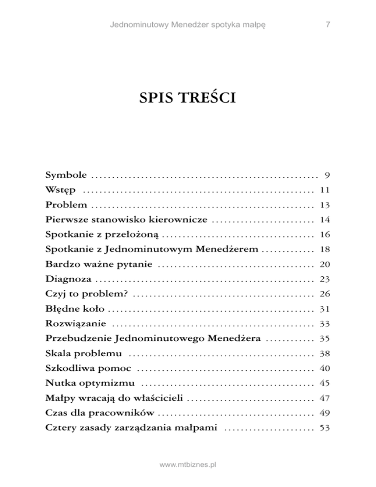 Jednominutowy Menedżer spotyka małpę 7 Spis treści Symbole .. . . . . . . . . . . . . . . . . . . . . . . . . . . . . . . . . . . . . . . . . . . . . . . . . . . . . . . 9 Wstęp . . . . . . . . . . . . . . . . . . . . . . . . . . . . . . . . . . . . . . . . . . . . . . . . . . . . . . . . . 11 Problem . . . . . . . . . . . . . . . . . . . . . . . . . . . . . . . . . . . . . . . . . . . . . . . . . . . . . . 13 Pierwsze stanowisko kierownicze .. . . . . . . . . . . . . . . . . . . . . . . . . 14 Spotkanie z przełożoną . . . . . . . . . . . . . . . . . . . . . . . . . . . . . . . . . . . . . 16 Spotkanie z Jednominutowym Menedżerem . . . . . . . . . . . . . 18 Bardzo ważne pytanie .. . . . . . . . . . . . . . . . . . . . . . . . . . . . . . . . . . . . . . 20 Diagnoza . . . . . . . . . . . . . . . . . . . . . . . . . . . . . . . . . . . . . . . . . . . . . . . . . . . . . 23 Czyj to problem? .. . . . . . . . . . . . . . . . . . . . . . . . . . . . . . . . . . . . . . . . . . . . 26 Błędne koło . . . . . . . . . . . . . . . . . . . . . . . . . . . . . . . . . . . . . . . . . . . . . . . . . . 31 Rozwiązanie .. . . . . . . . . . . . . . . . . . . . . . . . . . . . . . . . . . . . . . . . . . . . . . . . . 33 Przebudzenie Jednominutowego Menedżera .. . . . . . . . . . . . 35 Skala problemu .. . . . . . . . . . . . . . . . . . . . . . . . . . . . . . . . . . . . . . . . . . . . . 38 Szkodliwa pomoc .. . . . . . . . . . . . . . . . . . . . . . . . . . . . . . . . . . . . . . . . . . . 40 Nutka optymizmu .. . . . . . . . . . . . . . . . . . . . . . . . . . . . . . . . . . . . . . . . . . 45 Małpy wracają do właścicieli . . . . . . . . . . . . . . . . . . . . . . . . . . . . . . . 47 Czas dla pracowników . . . . . . . . . . . . . . . . . . . . . . . . . . . . . . . . . . . . . . 49 Cztery zasady zarządzania małpami .. . . . . . . . . . . . . . . . . . . . . . 53 www.mtbiznes.pl 8 Jednominutowy Menedżer spotyka małpę Zasada 1. Opis .. . . . . . . . . . . . . . . . . . . . . . . . . . . . . . . . . . . . . . . . . . . . . . 56 Zasada 2. Właściciel .. . . . . . . . . . . . . . . . . . . . . . . . . . . . . . . . . . . . . . . . 61 Zasada 3. Polisa ubezpieczeniowa .. . . . . . . . . . . . . . . . . . . . . . . . 70 Zasada 4. Karmienie i kontrola .. . . . . . . . . . . . . . . . . . . . . . . . . . . 78 Delegowanie uprawnień .. . . . . . . . . . . . . . . . . . . . . . . . . . . . . . . . . . . 84 Szkolenie pracowników .. . . . . . . . . . . . . . . . . . . . . . . . . . . . . . . . . . . . 88 Trzy rodzaje czasu w organizacji .. . . . . . . . . . . . . . . . . . . . . . . . . . 96 Czas przełożonego .. . . . . . . . . . . . . . . . . . . . . . . . . . . . . . . . . . . . . . . . . . 98 Czas systemowy .. . . . . . . . . . . . . . . . . . . . . . . . . . . . . . . . . . . . . . . . . . . . 102 Własny czas . . . . . . . . . . . . . . . . . . . . . . . . . . . . . . . . . . . . . . . . . . . . . . . . . 105 Czas dyskrecjonalny .. . . . . . . . . . . . . . . . . . . . . . . . . . . . . . . . . . . . . . . 106 Zarządzanie małpami kluczem do sukcesu .. . . . . . . . . . . . . 109 Generowanie czasu dyskrecjonalnego .. . . . . . . . . . . . . . . . . . . 110 Sztuka zarządzania . . . . . . . . . . . . . . . . . . . . . . . . . . . . . . . . . . . . . . . . . 113 Wielka przemiana . . . . . . . . . . . . . . . . . . . . . . . . . . . . . . . . . . . . . . . . . . 115 Podziękowania .. . . . . . . . . . . . . . . . . . . . . . . . . . . . . . . . . . . . . . . . . . . . . 118 O autorach . . . . . . . . . . . . . . . . . . . . . . . . . . . . . . . . . . . . . . . . . . . . . . . . . . 120 Dostępne usługi . . . . . . . . . . . . . . . . . . . . . . . . . . . . . . . . . . . . . . . . . . . . 123 www.mtbiznes.pl Jednominutowy Menedżer spotyka małpę 9 Symbole Symbol Jednominutowego Menedżera – cyfry wyrażające jedną minutę na wyświetlaczu nowoczesnego zegara cyfrowego – ma przypominać każdemu z nas, abyśmy codziennie poświęcili minutę, by przyjrzeć się twarzom ludzi, którymi kierujemy. I abyśmy uświadomili sobie, że to oni są naszymi najcenniejszymi zasobami. Symbol Małpiego Menedżera – wyczerpany menedżer, otoczony przez stado małp – ma nam przypominać, że powinniśmy się skupiać wyłącznie na najważniejszych aspektach zarządzania, zamiast „jak najefektywniej realizować zadania, które w ogóle nie powinny być realizowane”. www.mtbiznes.pl Jednominutowy Menedżer spotyka małpę 11 Wstęp Ponad trzydzieści lat temu poznałem naprawdę niezwykłego człowieka. Nazywał się Bill Oncken. Wszystko zaczęło się od artykułu Managing Management Time – Who’s Got The Monkey?, który Bill (wraz z Donaldem Wassem) opublikował w „Harvard Business Review”. Pracowałem wówczas jako wykładowca na Uniwersytecie Massachusetts. Zgodnie z teorią Billa byłem więc typowym, przepełnionym altruizmem intelektualistą, wierzącym, że jego powołaniem jest pomaganie wszystkim naokoło. Mój przyjaciel miał na to nawet specjalny termin – „kolekcjoner małp”. Kilka lat później wziąłem udział w jednym z prowadzonych przez Billa wykładów z cyklu „Zarządzanie czasem dla menedżerów”. Kiedy opisywał kolejne problemy napotykane w pracy na tym stanowisku, słuchacze co chwila wybuchali śmiechem. Nic innego nam nie pozostało, ponieważ mężczyznom nie wypada publicznie płakać. Skąd taka emocjonalna reakcja? Otóż Bill, jak nikt inny, potrafił wychwycić i celnie podsumować realia amerykańskiego świata biznesu. Bill nauczył mnie, że aby komuś pomóc, należy dać mu wędkę, a nie rybę. Wyręczanie ludzi w rozwiązywaniu problemów uczy ich bezradności i na dłuższą metę może tylko zaszkodzić. Kiedy więc Hal Burrows (długoletni wspólnik i kierownik firmy William Oncken Company oraz współtwórca cyklu „Zarząwww.mtbiznes.pl 12 Jednominutowy Menedżer spotyka małpę dzanie czasem dla menedżerów”) z