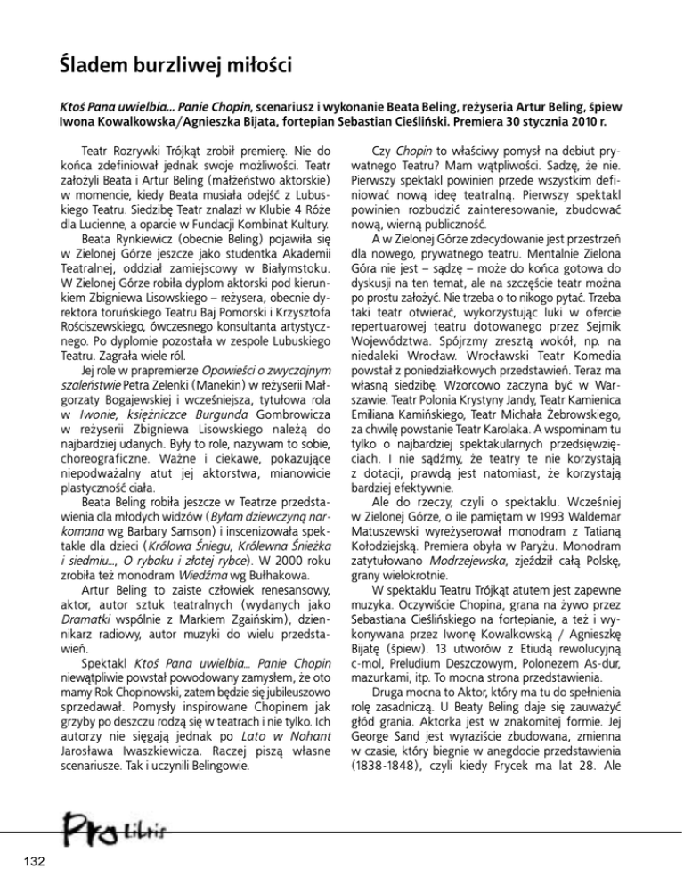 Śladem burzliwej miłości Ktoś Pana uwielbia… Panie Chopin, scenariusz i wykonanie Beata Beling, reżyseria Artur Beling, śpiew Iwona Kowalkowska/Agnieszka Bijata, fortepian Sebastian Cieśliński. Premiera 30 stycznia 2010 r. Teatr Rozrywki Trójkąt zrobił premierę. Nie do końca zdefiniował jednak swoje możliwości. Teatr założyli Beata i Artur Beling (małżeństwo aktorskie) w momencie, kiedy Beata musiała odejść z Lubuskiego Teatru. Siedzibę Teatr znalazł w Klubie 4 Róże dla Lucienne, a oparcie w Fundacji Kombinat Kultury. Beata Rynkiewicz (obecnie Beling) pojawiła się w Zielonej Górze jeszcze jako studentka Akademii Teatralnej, oddział zamiejscowy w Białymstoku. W Zielonej Górze robiła dyplom aktorski pod kierunkiem Zbigniewa Lisowskiego – reżysera, obecnie dyrektora toruńskiego Teatru Baj Pomorski i Krzysztofa Rościszewskiego, ówczesnego konsultanta artystycznego. Po dyplomie pozostała w zespole Lubuskiego Teatru. Zagrała wiele ról. Jej role w prapremierze Opowieści o zwyczajnym szaleństwie Petra Zelenki (Manekin) w reżyserii Małgorzaty Bogajewskiej i wcześniejsza, tytułowa rola w Iwonie, księżniczce Burgunda Gombrowicza w reżyserii Zbigniewa Lisowskiego należą do najbardziej udanych. Były to role, nazywam to sobie, choreograficzne. Ważne i ciekawe, pokazujące niepodważalny atut jej aktorstwa, mianowicie plastyczność ciała. Beata Beling robiła jeszcze w Teatrze przedstawienia dla młodych widzów (Byłam dziewczyną narkomana wg Barbary Samson) i inscenizowała spektakle dla dzieci (Królowa Śniegu, Królewna Śnieżka i siedmiu…, O rybaku i złotej rybce). W 2000 roku zrobiła też monodram Wiedźma wg Bułhakowa. Artur Beling to zaiste człowiek renesansowy, aktor, autor sztuk teatralnych (wydanych jako Dramatki wspólnie z Markiem Zgaińskim), dziennikarz radiowy, autor muzyki do wielu przedstawień. Spektakl Ktoś Pana uwielbia… Panie Chopin niewątpliwie powstał powodowany zamysłem, że oto mamy Rok Chopinowski, zatem będzie się jubileuszowo sprzedawał. Pomysły inspirowane Chopinem jak grzyby po deszczu rodzą się w teatrach i nie tylko. Ich autorzy nie sięgają jednak po Lato w Nohant Jarosława Iwaszkiewicza. Raczej piszą własne scenariusze. Tak i uczynili Belingowie. 132 Czy Chopin to właściwy pomysł na debiut prywatnego Teatru? Mam wątpliwości. Sadzę, że nie. Pierwszy spektakl powinien przede wszystkim definiować nową ideę teatralną. Pierwszy spektakl powinien rozbudzić zainteresowanie, zbudować nową, wierną publiczność. A w Zielonej Górze zdecydowanie jest przestrzeń dla nowego, prywatnego teatru. Mentalnie Zielona Góra nie jest – sądzę – może do końca gotowa do dyskusji na ten temat, ale na szczęście teatr można po prostu założyć. Nie trzeba o to nikogo pytać. Trzeba taki teatr otwierać, wykorzystując luki w ofercie repertuarowej teatru dotowanego przez Sejmik Województwa. Spójrzmy zresztą wokół, np. na niedaleki Wrocław. Wrocławski Teatr Komedia powstał z poniedziałkowych przedstawień. Teraz ma własną siedzibę. Wzorcowo zaczyna być w Warszawie. Teatr Polonia Krystyny Jandy, Teatr Kamienica Emiliana Kamińskiego, Teatr Michała Żebrowskiego, za chwilę powstanie Teatr Karolaka. A wspominam tu tylko o najbardziej spektakularnych przedsięwzięciach. I nie sądźmy, że teatry te nie korzystają z dotacji, prawdą jest natomiast, że korzystają bardziej efektywnie. Ale do rzeczy, czyli o spektaklu. Wcześniej w Zielonej Górze, o ile pamiętam w 1993 Waldemar Matuszewski wyreżyserował monodram z Tatianą Kołodziejską. Premiera obyła w Paryżu. Monodram zatytułowano Modrzejewska, zjeździł całą Polskę, grany wielokrotnie. W spektaklu Teatru Trójkąt atutem jest zapewne muzyka. Oczywiście Chopina, grana na żywo przez Sebastiana Cieślińskiego na fortepianie, a też i wykonywana przez Iwonę Kowalkowską / Agnieszkę Bijatę (śpiew). 13 utworów z Etiudą rewolucyjną c-mol, Preludium Deszczowym, Polonezem As-dur, mazurkami, itp. To mocna strona przedstawienia. Druga mocna to Aktor, który ma tu do spełnienia rolę zasadniczą. U Beaty Beling daje się zauważyć głód grania. Aktorka jest w znakomitej formie. Jej George Sand jest wyraziście zbudowana, zmienna w czasie, który biegnie w anegdocie przedstawienia (1838-1848), czyli kiedy Frycek ma lat 28. Ale w kreacji niewątpliwie pomaga jej kostium, cała gama sukien z tzw. epoki, o które zadbali pomysłodawcy. Anegdota w scenariuszu jest klasyczna. Rok 1838, Sand i Chopin wyjeżdżają na Majorkę, gdzie spełnia się ich romans, mieszkają w klasztorze kartuzów w Valldemosie, potem pomieszkiwanie Chopina w Nohant. Wreszcie rok 1845 – początek nieporozumień z Sand i jej synem Maurycym, także konflikt z Solange (córką) w tle. Chopin obecny jest tu tylko w domyśle, w relacji Gorge Sand. Sand wspomina go, opowiada, dialoguje z nim, czyta listy, przegląda prasę i recenzje koncertów Chopina. Jest to przykład klasycznej realizacji monodramu opartego na wątkach biograficznych, bardzo czystej, by nie rzec przejrzystej. Nie ma w tym pomyśle eksperymentu. Jest rzetelna robota aktorki i reżysera. Ale jest też budowanie emocji poetyką światła, o którą zadbali realizatorzy. Struktura przedstawienia to etiuda aktorska i utwór muzyczny. I co istotne, jest tu pointa. Kiedy wydaje się nam, że Sand kończy swoją spowiedź na scenie, już jakby prywatnie pojawia się Beata Beling. Wygłasza apart do widza, pytając, czy taka miłość byłaby dzisiaj możliwa, więcej czy mówienie o pogmatwanym uczuciu Artysty ma sens. Swoją drogą, mówiąc okazjonalnie o Chopinie, mówiąc biograficznie, kręcimy się nieustannie wokół George Sand, Maurycego i Solange. Czyżby biografia pianisty była tak schematyczna? Spoglądając z tej perspektywy, monodram Belingów nie wnosi wiele do naszej wiedzy o Kompozytorze. Andrzej Buck RECENZJE I OMÓWIENIA 133