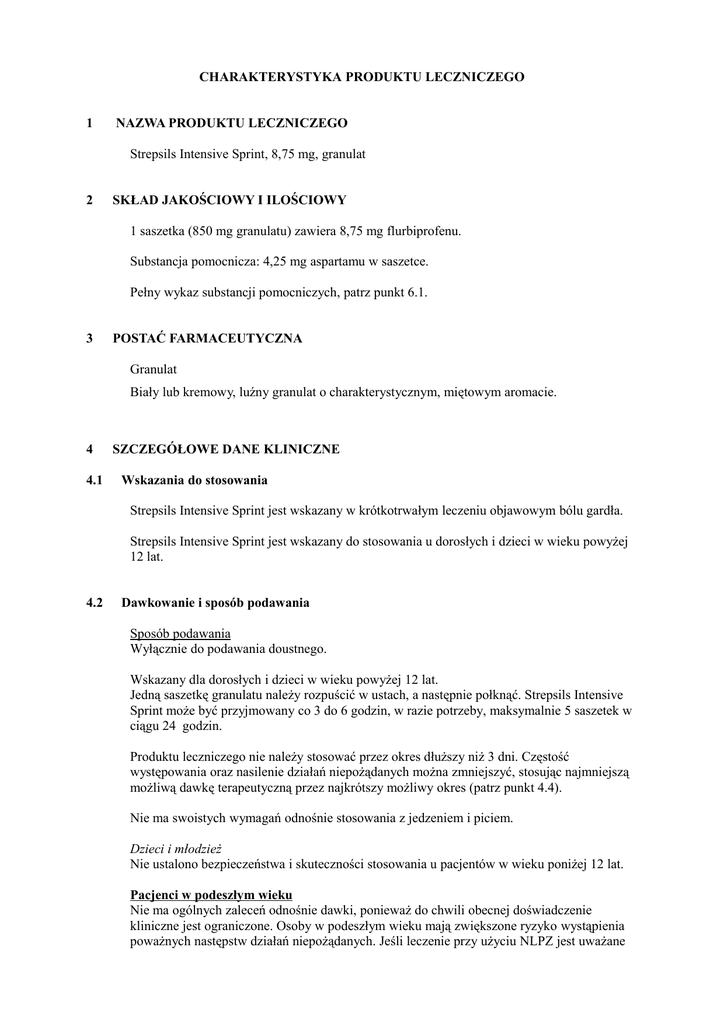 CHARAKTERYSTYKA PRODUKTU LECZNICZEGO 1 NAZWA PRODUKTU LECZNICZEGO Strepsils Intensive Sprint, 8,75 mg, granulat 2 SKŁAD JAKOŚCIOWY I ILOŚCIOWY 1 saszetka (850 mg granulatu) zawiera 8,75 mg flurbiprofenu. Substancja pomocnicza: 4,25 mg aspartamu w saszetce. Pełny wykaz substancji pomocniczych, patrz punkt 6.1. 3 POSTAĆ FARMACEUTYCZNA Granulat Biały lub kremowy, luźny granulat o charakterystycznym, miętowym aromacie. 4 4.1 SZCZEGÓŁOWE DANE KLINICZNE Wskazania do stosowania Strepsils Intensive Sprint jest wskazany w krótkotrwałym leczeniu objawowym bólu gardła. Strepsils Intensive Sprint jest wskazany do stosowania u dorosłych i dzieci w wieku powyżej 12 lat. 4.2 Dawkowanie i sposób podawania Sposób podawania Wyłącznie do podawania doustnego. Wskazany dla dorosłych i dzieci w wieku powyżej 12 lat. Jedną saszetkę granulatu należy rozpuścić w ustach, a następnie połknąć. Strepsils Intensive Sprint może być przyjmowany co 3 do 6 godzin, w razie potrzeby, maksymalnie 5 saszetek w ciągu 24 godzin. Produktu leczniczego nie należy stosować przez okres dłuższy niż 3 dni. Częstość występowania oraz nasilenie działań niepożądanych można zmniejszyć, stosując najmniejszą możliwą dawkę terapeutyczną przez najkrótszy możliwy okres (patrz punkt 4.4). Nie ma swoistych wymagań odnośnie stosowania z jedzeniem i piciem. Dzieci i młodzież Nie ustalono bezpieczeństwa i skuteczności stosowania u pacjentów w wieku poniżej 12 lat. Pacjenci w podeszłym wieku Nie ma ogólnych zaleceń odnośnie dawki, ponieważ do chwili obecnej doświadczenie kliniczne jest ograniczone. Osoby w podeszłym wieku mają zwiększone ryzyko wystąpienia poważnych następstw działań niepożądanych. Jeśli leczenie przy użyciu NLPZ jest uważane za konieczne, należy stosować najmniejszą skuteczną dawkę, przez najkrótszy okres. Podczas stosowania NLPZ pacjent powinien być regularnie kontrolowany przez lekarza pod kątem ryzyka wystąpienia krwawienia z przewodu pokarmowego. 4.3 Przeciwwskazania Nadwrażliwość na flurbiprofen lub na którąkolwiek substancję pomocniczą wymienioną w punkcie 6.1. Pacjenci z występującymi w przeszłości reakcjami nadwrażliwości (np. astma, skurcz oskrzeli, nieżyt nosa, obrzęk naczynioruchowy lub pokrzywka) w odpowiedzi na kwas acetylosalicylowy lub inne NLPZ. Czynna lub nawracająca choroba wrzodowa/ krwotok (dwa lub więcej wyraźne epizody potwierdzonego owrzodzenia) lub owrzodzenie jelit. Krwawienie lub perforacja przewodu pokarmowego w wywiadzie, ciężkie zapalenie jelita grubego, zaburzenia dotyczące utraty lub wytwarzania krwi, związane z wcześniejszym leczeniem NLPZ. Ostatni trymestr ciąży (patrz punkt 4.6). Ciężka niewydolność serca, niewydolność wątroby lub nerek (patrz punkt 4.4). 4.4 Specjalne ostrzeżenia i środki ostrożności dotyczące stosowania Przyjmowanie produktu leczniczego w najmniejszej skutecznej dawce przez najkrótszy okres konieczny do łagodzenia objawów zmniejsza ryzyko działań niepożądanych (patrz punkt 4.2 oraz wpływ na przewód pokarmowy i układ krążenia poniżej). Fenyloketonuria Produkt leczniczy Strepsils Intensive Sprint zawiera aspartam, który stanowi źródło fenyloalaniny i może być szkodliwy dla pacjentów z fenyloketonurią. Pacjenci w podeszłym wieku U osób w podeszłym wieku częściej występują działania niepożądane po podaniu NLPZ, w szczególności krwawienie z przewodu pokarmowego lub jego perforacja, co może prowadzić do zgonu. Układ oddechowy U osób chorujących na astmę albo z astmą lub chorobą alergiczną w wywiadzie może dojść do skurczu oskrzeli, ponieważ istnieją doniesienia o wywoływaniu skurczu oskrzeli przez NLPZ u tych pacjentów. Dlatego też należy zachować ostrożność podczas stosowania produktu leczniczego Strepsils Intensive Sprint w tej grupie pacjentów. Inne NLPZ Należy unikać jednoczesnego stosowania produktu leczniczego Strepsils Intensive Sprint z NLPZ, w tym z selektywnymi inhibitorami cyklooksygenazy-2 (patrz punkt 4.5). Toczeń rumieniowaty układowy (ang. systemic lupus erythematosus – SLE) i mieszana choroba tkanki łącznej U pacjentów z toczniem rumieniowatym układowym oraz mieszaną chorobą tkanki łącznej może występować zwiększone ryzyko rozwoju jałowego zapalenia opon mózgowych (patrz punkt 4.8). Zaburzenia czynności nerek Istnieją doniesienia, że NLPZ mają toksyczny wpływ na nerki, powodując śródmiąższowe zapalenie nerek, zespół nerczycowy i niewydolność nerek. Stosowanie NLPZ może powodować zależne od dawki zmniejszenie wytwarzania prostaglandyn i przyspieszyć rozwój niewydolności nerek. Pacjenci o najwyższym ryzyku wystąpienia takich powikłań to osoby z zaburzeniami czynności nerek, serca, wątroby, pacjenci stosujący diuretyki i osoby w podeszłym wieku. U tych pacjentów należy monitorować czynność nerek (patrz punkt 4.3). Nawykowe stosowanie środków przeciwbólowych może prowadzić do przewlekłego uszkodzenia nerek, z ryzykiem niewydolności nerek, szczególnie w połączeniu z szeregiem innych substancji przeciwbólowych, jednak zazwyczaj nie dotyczy to krótkotrwałego, ograniczonego stosowania produktów leczniczych, takich jak Strepsils Intensive Sprint. Zaburzenia czynności wątroby Flurbiprofen jest hydrolizowany w wątrobie, toteż upośledzenie czynności wątroby może zmniejszać szybkość usuwania produktu leczniczego z organizmu. Uważa się, że podczas krótkotrwałego stosowania małych dawek, produkt leczniczy Strepsils Intensive Sprint nie powoduje istotnego zagrożenia. Wpływ na układ krążenia i naczynia mózgowe Wymagane jest odpowiednie monitorowanie oraz udzielenie wskazówek pacjentom z nadciśnieniem tętniczym w wywiadzie i (lub) łagodną do umiarkowanej zastoinową niewydolnością serca, gdyż w związku z leczeniem NLPZ opisywano zatrzymywanie płynów oraz obrzęki. Z badań klinicznych i danych epidemiolo
