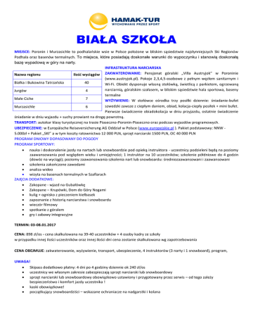 BIAŁA SZKOŁA MIEJSCE: Poronin i Murzasichle to podhalańskie wsie w Polsce położone w bliskim sąsiedztwie najsłynniejszych Ski Regionów Podhala oraz basenów termalnych. To miejsca, które posiadają doskonałe warunki do wypoczynku i stanowią doskonałą bazę wypadową w góry na narty. INFRASTRUKTURA NARCIARSKA Nazwa regionu Ilość wyciągów ZAKWATEROWANIE: Pensjonat góralski „Villa Austryjok” w Poroninie (www.austryjok.pl). Pokoje 2,3,4,5-osobowe z pełnym węzłem sanitarnym i Białka i Bukowina Tatrzańska 40 Wi-Fi. Obiekt dysponuje własną stołówką, świetlicą z parkietem, ogrzewaną narciarnią, góralskim szałasem, w bliskim sąsiedztwie hala sportowa, baseny Jurgów 4 termalne Małe Ciche 7 WYŻYWIENIE: W stołówce ośrodka trzy posiłki dziennie: śniadanie-bufet szwedzki zawsze z ciepłym daniem, obiad, kolacja-ciepły posiłek + mini bufet. Murzasichle 6 Pierwsze świadczenie obiadokolacja w dniu przyjazdu, ostatnie świadczenie śniadanie w dniu wyjazdu + suchy prowiant na drogę powrotną. TRANSPORT: autokar klasy turystycznej na trasie Piaseczno-Poronin-Piaseczno oraz podczas wyjazdów programowych. UBEZPIECZENIE: w Europäische Reiseversicherung AG Oddział w Polsce (www.europejskie.pl ). Pakiet podstawowy: NNW 5.000zł + Pakiet „SKI” a w tym koszty ratownictwa 12 000 PLN, sprzęt narciarski 1500 PLN, OC 40 000 PLN PROGRAM DNIOWY DOPASOWANY DO POGODY PROGRAM SPORTOWY: nauka i doskonalenie jazdy na nartach lub snowboardzie pod opieką instruktora - uczestnicy podzieleni będą na poziomy zaawansowania pod względem wieku i umiejętności; 1 instruktor na 10 uczestników; szkolenie półdniowe do 4 godzin (dowóz na wyciągi); poziomy zaawansowania szkolenia nart lub snowboardu: średniozaawansowani i zaawansowani szkolenia zakończone zawodami analiza wideo wizyta na basenach termalnych w Szaflarach ZAJĘCIA DODATKOWE: Zakopane - wjazd na Gubałówkę Zakopane – Krupówki, Dom do Góry Nogami kulig + ognisko z pieczeniem kiełbasek zapoznanie z historią narciarstwa i snowboardu wieczór filmowy spotkanie z góralem gry i zabawy integracyjne TERMIN: 03-08.01.2017 CENA: 898 zł/os - cena skalkulowana na 39-40 uczestników + 4 osoby kadry ze szkoły w przypadku innej ilości uczestników oraz innej ilości dni cena zostanie skalkulowana wg zapotrzebowania CENA OBEJMUJE: zakwaterowanie, wyżywienie, transport, ubezpieczenie, 4 instruktorów (3 narty i 1 snowboard), program, UWAGA! Skipass dodatkowo płatny: 4 dni po 4 godziny dziennie ok 240 zł/os uczestnicy we własnym zakresie zabezpieczają sprzęt narciarski lub snowboardowy sprzęt narciarski lub snowboardowy obowiązkowo ustawiony i przygotowany przez serwis – od tego zależy bezpieczeństwo i komfort jazdy uczestnika ! kaski obowiązkowe! początkujący snowboardziści – wskazane ochraniacze na nadgarstki i kolana