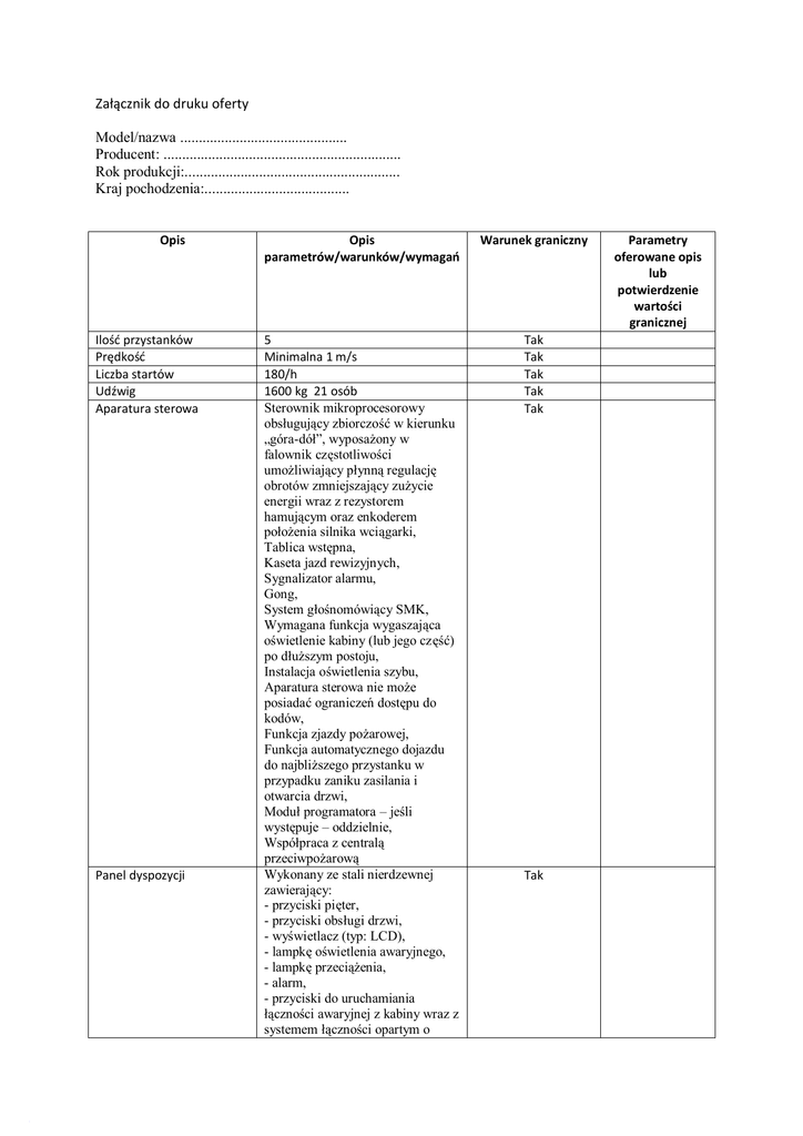 Załącznik do druku oferty Model/nazwa ............................................. Producent: ................................................................ Rok produkcji:.......................................................... Kraj pochodzenia:....................................... Opis Ilość przystanków Prędkość Liczba startów Udźwig Aparatura sterowa Panel dyspozycji Opis parametrów/warunków/wymagań Warunek graniczny 5 Minimalna 1 m/s 180/h 1600 kg 21 osób Sterownik mikroprocesorowy obsługujący zbiorczość w kierunku „góra-dół”, wyposażony w falownik częstotliwości umożliwiający płynną regulację obrotów zmniejszający zużycie energii wraz z rezystorem hamującym oraz enkoderem położenia silnika wciągarki, Tablica wstępna, Kaseta jazd rewizyjnych, Sygnalizator alarmu, Gong, System głośnomówiący SMK, Wymagana funkcja wygaszająca oświetlenie kabiny (lub jego część) po dłuższym postoju, Instalacja oświetlenia szybu, Aparatura sterowa nie może posiadać ograniczeń dostępu do kodów, Funkcja zjazdy pożarowej, Funkcja automatycznego dojazdu do najbliższego przystanku w przypadku zaniku zasilania i otwarcia drzwi, Moduł programatora – jeśli występuje – oddzielnie, Współpraca z centralą przeciwpożarową Wykonany ze stali nierdzewnej zawierający: - przyciski pięter, - przyciski obsługi drzwi, - wyświetlacz (typ: LCD), - lampkę oświetlenia awaryjnego, - lampkę przeciążenia, - alarm, - przyciski do uruchamiania łączności awaryjnej z kabiny wraz z systemem łączności opartym o Tak Tak Tak Tak Tak Tak Parametry oferowane opis lub potwierdzenie wartości granicznej Kasety wezwań podtynkowe Piętro – wskazywacz pietra na każdym przystanku System odwzorowania położenia Kabina z rama wyposażona w chwytacze Zespół napędowy Drzwi kabinowe Drzwi przystankowe Przeciwwaga Inne podzespoły telefonię GSM zgodny z EN81-28 - opis aparatu z zastosowaniem alfabetu Braille’a, - wykonanie wandaloodporne, Wykonanie ze stali nierdzewnej szlifowanej wyposażone w: - przyciski wezwań (góra-dół), - wyświetlacz ze strzałkami kierunku jazdy LED na każdym przystanku Nad drzwiami Elektroniczny kontrolujący przemieszczanie się kabiny w szybie oraz czas ruchu Kabina wykonana ze stali nierdzewnej fakturowanej, system informacji o przeciążeniu, 3 poręcze ze stali nierdzewnej fakturowanej len, listwy odbojowe, narożniki i cokół wykonane ze stali nierdzewnej fakturowanej len, wykładzina trudnościeralna, antypoślizgowa – opcjonalnie gres/kamień, sufit stal nierdzewna szlifowana, oświetlenie kabiny – LED, wyposażenie w wentylator bezreduktorowy Automatyczne (sterownie falownikowe), centralne, panelowe, stal nierdzewna fakturowana len wyposażone w barierę świetlną – kurtynę, próg aluminiowy Teleskopowe, czterosegmentowe centralnie otwierane Automatyczne, centralne, panelowe ze stali nierdzewnej, wyposażone w próg aluminiowy, drzwi na poziomie parteru w klasie odporności ogniowej EI30 Ramowa bez kurtyny Ogranicznik prędkości, liny wraz z mocowaniem, zderzaki pod kabin ę i przeciwwagę, prowadnice, etc. Tak Tak Tak Tak Tak Tak Tak Tak Tak UWAGA! Parametry, których wartość określona jest w rubryce „wartość wymagana” stanowią wymagania, których niespełnienie spowoduje odrzucenie oferty. Do oferty należy dołączyć materiały informacyjne (np. katalog) potwierdzające spełnienie wymagań opisanych w SIWZ. Oferent gwarantuje, że urządzenie jest nowe, kompletne i do jego uruchomienia oraz stosowania zgodnie z przeznaczeniem nie je st konieczny zakup dodatkowych elementów i akcesoriów. Oświadczam, że urządzenie jest zgodne z opisem i posiada wymagane certyfikaty i dopuszczenia do stosowania. ....................................... (miejscowość , data) …………………………………………. (Podpis, pieczęć oferenta )