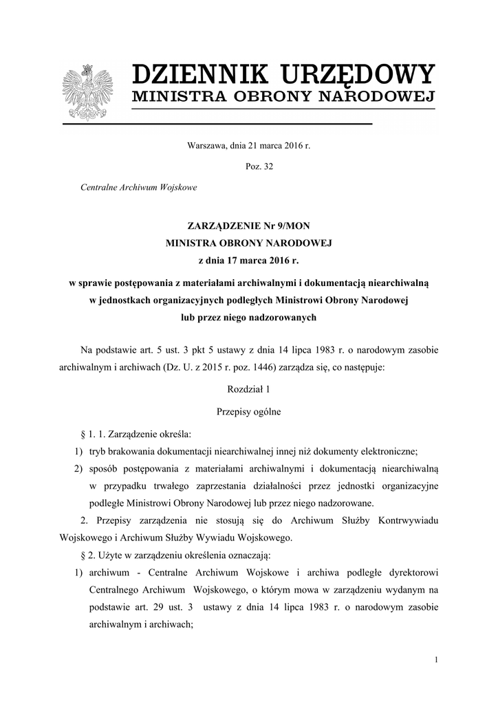 Warszawa, dnia 21 marca 2016 r. Poz. 32 Centralne Archiwum Wojskowe ZARZĄDZENIE Nr 9/MON MINISTRA OBRONY NARODOWEJ z dnia 17 marca 2016 r. w sprawie postępowania z materiałami archiwalnymi i dokumentacją niearchiwalną w jednostkach organizacyjnych podległych Ministrowi Obrony Narodowej lub przez niego nadzorowanych Na podstawie art. 5 ust. 3 pkt 5 ustawy z dnia 14 lipca 1983 r. o narodowym zasobie archiwalnym i archiwach (Dz. U. z 2015 r. poz. 1446) zarządza się, co następuje: Rozdział 1 Przepisy ogólne § 1. 1. Zarządzenie określa: 1) tryb brakowania dokumentacji niearchiwalnej innej niż dokumenty elektroniczne; 2) sposób postępowania z materiałami archiwalnymi i dokumentacją niearchiwalną w przypadku trwałego zaprzestania działalności przez jednostki organizacyjne podległe Ministrowi Obrony Narodowej lub przez niego nadzorowane. 2. Przepisy zarządzenia nie stosują się do Archiwum Służby Kontrwywiadu Wojskowego i Archiwum Służby Wywiadu Wojskowego. § 2. Użyte w zarządzeniu określenia oznaczają: 1) archiwum - Centralne Archiwum Wojskowe i archiwa podległe dyrektorowi Centralnego Archiwum Wojskowego, o którym mowa w zarządzeniu wydanym na podstawie art. 29 ust. 3 ustawy z dnia 14 lipca 1983 r. o narodowym zasobie archiwalnym i archiwach; 1 2) ekspertyza archiwalna – czynności mające na celu ocenę dokumentacji i ustalenie jej ostatecznej kwalifikacji archiwalnej. Ekspertyzę archiwalną przeprowadzają pracownicy archiwum, a jej wyniki dokumentowane są w protokole zatwierdzonym przez dyrektora Centralnego Archiwum Wojskowego; 3) kwalifikacja archiwalna – przyporządkowanie dokumentacji do kategorii archiwalnej i oznaczenie jej odpowiednim symbolem zgodnie z jednolitym rzeczowym wykazem akt jednostki organizacyjnej lub kwalifikatorem dokumentacji; 4) skład chronologiczny – uporządkowany zbiór dokumentacji w postaci nieelektronicznej, w układzie wynikającym z kolejności wprowadzenia do systemu elektronicznego zarządzania dokumentacją, utworzony w jednostce organizacyjnej, w której wprowadzono ten system; 5) ustawa – ustawa z dnia 14 lipca 1983 r. o narodowym zasobie archiwalnym i archiwach. Rozdział 2 Tryb brakowania dokumentacji niearchiwalnej § 3.1. Brakowanie dokumentacji niearchiwalnej prowadzi się po dniu 1 stycznia roku następującego po roku, w którym upływa okres jej przechowywania. 2. Brakowanie dokumentacji niearchiwalnej oznaczonej symbolem „Bc” można prowadzić bezpośrednio po utracie jej znaczenia dla jednostki organizacyjnej. 3. Brakowaniu nie podlega dokumentacja niearchiwalna niezbędna do prac bieżących w jednostce organizacyjnej, zwłaszcza niezbędna do celów kontrolnych i dowodowych. § 4. Brakowanie dokumentacji niearchiwalnej przechowywanej w składzie chronologicznym prowadzi się po wyodrębnieniu z jej składu materiałów archiwalnych i ujęciu jej w odrębnej ewidencji (spisie materiałów archiwalnych wydzielonych ze składu chronologicznego). § 5.1. Czynności brakowania dokumentacji niearchiwalnej obejmują: 1) powołanie komisji brakowania przez kierownika jednostki organizacyjnej lub kierownika komórki organizacyjnej Ministerstwa Obrony Narodowej; 2) wydzielenie dokumentacji niearchiwalnej, dla której upłynął okres przechowywania; 3) przeprowadzenie oceny dokumentacji niearchiwalnej; 4) sporządzenie protokołu brakowania i spisu dokumentacji niearchiwalnej odrębnie dla dokumentacji niearchiwalnej oznaczonej symbolem „B”, „BE” i „Bc”; 2 5) wystąpienie z wnioskiem o wydanie zezwolenia na zniszczenie dokumentacji niearchiwalnej; 6) fizyczne zniszczenie dokumentacji. 2. Protokół brakowania i spis dokumentacji niearchiwalnej sporządza się w dwóch egzemplarzach, według wzoru określonego odpowiednio w załącznikach Nr 1 i Nr 2 do zarządzenia. 3. Czynności brakowania dokumentacji niearchiwalnej oznaczonej symbolem „BE” poprzedza ekspertyza archiwalna. 4. Czynności brakowania dokumentacji niearchiwalnej innej niż określonej w ust. 3 mogą być poprzedzone ekspertyzą archiwalną. § 6. Zgodę na brakowanie dokumentacji niearchiwalnej wyraża Minister Obrony Narodowej, lub dyrektorzy archiwów w przypadku ich upoważnienia. § 7. 1. Zezwolenia na zniszczenie dokumentacji niearchiwalnej, zwanego dalej „zezwoleniem”, udziela dyrektor archiwum, według wzoru określonego w załączniku Nr 3 do zarządzenia, na podstawie zatwierdzonego protokołu brakowania i spisu dokumentacji niearchiwalnej. 2. Zezwolenia na zniszczenie dokumentacji niearchiwalnej w archiwum wyodrębnionym, o którym mowa w zarządzeniu wydanym na podstawie art. 29 ust. 3 ustawy, udziela dyrektor Centralnego Archiwum Wojskowego. § 8. 1. Zezwolenie obejmuje całość lub część dokumentacji wykazanej w protokole brakowania i spisie dokumentacji niearchiwalnej. 2. Zezwolenie sporządza się w dwóch egzemplarzach, z których jeden jest przeznaczony dla jednostki organizacyjnej prowadzącej brakowanie, a drugi dla archiwum. 3. Ewidencję wydanych zezwoleń prowadzi archiwum według wzoru określonego w załączniku Nr 4 do zarządzenia. § 9. 1. Zezwolenie nie zostaje wydane, jeżeli protokół brakowania lub spis dokumentacji niearchiwalnej nie spełniają wymogów formalnych albo informacje w nich podane są niepełne lub błędne. 2. Wyłączeniu z zezwolenia może podlegać dokumentacja, wobec której nastąpiła zmiana kwalifikacji archiwalnej albo której kwalifikacja archiwalna dokumentacji budzi wątpliwości. 3 § 10. Dyrektor archiwum, nie wydając zezwolenia lub wyłączając z zezwolenia część dokumentacji, wskazuje przyczyny odmowy lub wyłączenia oraz wydaje odpowiednie zalecenia. § 11. 1. Fizycznego zniszczenia dokumentacji niearchiwalnej dokonuje się po otrzymaniu zezwolenia, w sposób uniemożliwiający odtworzenie jej treści. 2. Informację o zniszczeniu dokumentacji zamieszcza się w odpowiednich urządzeniach ewidencyjnych. Rozdział 3 Sposób postępowania z mater