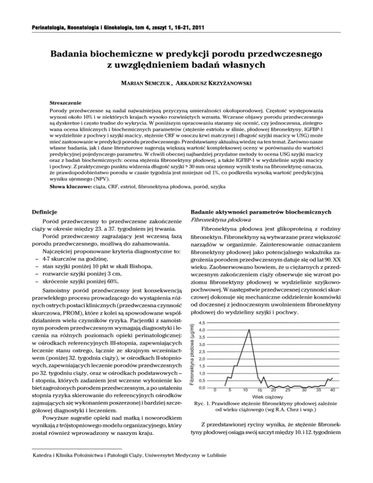 Perinatologia, Neonatologia i Ginekologia, tom 4, zeszyt 1, 16-21, 2011 Badania biochemiczne w predykcji porodu przedwczesnego z uwzględnieniem badań własnych MARIAN SEMCZUK , ARKADIUSZ KRZYŻANOWSKI Streszczenie Porody przedwczesne są nadal najważniejszą przyczyną umieralności okołoporodowej. Częstość występowania wynosi około 10% i w niektórych krajach wysoko rozwiniętych wzrasta. Wczesne objawy porodu przedwczesnego są dyskretne i często trudne do wykrycia. W poniższym opracowaniu staramy się ocenić, czy jednoczesna, zintegrowana ocena klinicznych i biochemicznych parametrów (stężenie estriolu w ślinie, płodowej fibronektyny, IGFBP-1 w wydzielinie z pochwy i szyjki macicy, stężenie CRF w osoczu krwi matczynej i długość szyjki macicy w USG) może mieć zastosowanie w predykcji porodu przedwczesnego. Przedstawiamy aktualną wiedzę na ten temat. Zarówno nasze własne badania, jak i dane literaturowe sugerują większą wartość kompleksowej oceny w porównaniu do wartości predykcyjnej pojedynczego parametru. W chwili obecnej najbardziej przydatne metody to ocena USG szyjki macicy oraz z badań biochemicznych: ocena stężenia fibronektyny płodowej, a także IGFBP-1 w wydzielinie szyjki macicy i pochwy. Z praktycznego punktu widzenia długość szyjki > 30 mm oraz ujemny wynik testu na fibronektynę oznacza, że prawdopodobieństwo porodu w czasie tygodnia jest mniejsze od 1%, co podkreśla wysoką wartość predykcyjną wyniku ujemnego (NPV). Słowa kluczowe: ciąża, CRF, estriol, fibronektyna płodowa, poród, szyjka Definicje Badanie aktywności parametrów biochemicznych Poród przedwczesny to przedwczesne zakończenie ciąży w okresie między 23. a 37. tygodniem jej trwania. Poród przedwczesny zagrażający jest wczesną fazą porodu przedwczesnego, możliwą do zahamowania. Najczęściej proponowane kryteria diagnostyczne to: – 4-7 skurczów na godzinę, – stan szyjki poniżej 10 pkt w skali Bishopa, – rozwarcie szyjki poniżej 3 cm, – skrócenie szyjki poniżej 60%. Fibronektyna płodowa Fibronektyna płodowa (:g/ml) Samoistny poród przedwczesny jest konsekwencją przewlekłego procesu prowadzącego do wystąpienia różnych ostrych postaci klinicznych (przedwczesna czynność skurczowa, PROM), które z kolei są spowodowane współdziałaniem wielu czynników ryzyka. Pacjentki z samoistnym porodem przedwczesnym wymagają diagnostyki i leczenia na różnych poziomach opieki perinatologicznej: w ośrodkach referencyjnych III-stopnia, zapewniających leczenie stanu ostrego, łącznie ze skrajnym wcześniactwem (poniżej 32. tygodnia ciąży), w ośrodkach II-stopniowych, zapewniających leczenie porodów przedwczesnych po 32. tygodniu ciąży, oraz w ośrodkach podstawowych – I stopnia, których zadaniem jest wczesne wyłonienie kobiet zagrożonych porodem przedwczesnym, a po ustaleniu stopnia ryzyka skierowanie do referencyjnych ośrodków zajmujących się wykonaniem poszerzonej i bardziej szczegółowej diagnostyki i leczeniem. Powyższe sugestie opieki nad matką i noworodkiem wynikają z trójstopniowego modelu organizacyjnego, który został również wprowadzony w naszym kraju. Fibronektyna płodowa jest glikoproteiną z rodziny fibronektyn. Fibronektyny są wytwarzane przez większość narządów w organizmie. Zainteresowanie oznaczaniem fibronektyny płodowej jako potencjalnego wskaźnika zagrożenia porodem przedwczesnym datuje się od lat 90. XX wieku. Zaobserwowano bowiem, że u ciężarnych z przedwczesnym zakończeniem ciąży obserwuje się wzrost poziomu fibronektyny płodowej w wydzielinie szyjkowopochwowej. W następstwie przedwczesnej czynności skurczowej dokonuje się mechaniczne oddzielenie kosmówki od doczesnej z jednoczesnym uwolnieniem fibronektyny płodowej do wydzieliny szyjki i pochwy. 4,5 4,0 3,5 3,0 2,5 2,0 1,5 1,0 0,5 0,0 0 5 10 15 20 25 30 35 40 Wiek ciążowy Ryc. 1. Prawidłowe stężenie fibronektyny płodowej zależnie od wieku ciążowego (wg R.A. Chez i wsp.) Z przedstawionej ryciny wynika, że stężenie fibronektyny płodowej osiąga swój szczyt między 10. i 12. tygodniem Katedra i Klinika Położnictwa i Patologii Ciąży, Uniwersytet Medyczny w Lublinie 17 Badania biochemiczne w predykcji porodu przedwczesnego z uwzględnieniem badań własnych ciąży, około 18. tygodnia ciąży spada < 0,050 μg/ml i nie powinno wzrastać do 36-37 tygodnia ciąży (ryc. 1). Stężenie fibronektyny płodowej > 0,050 μg/ml w wydzielinie szyjkowej między 24. a 34. tygodniem ciąży wiąże się ze wzrostem częstości porodów przedwczesnych. Przeprowadzenie samego testu i pobranie materiału do badania jest bardzo proste. Jedynym ograniczeniem w chwili obecnej jest zbyt długie oczekiwanie na wynik oznaczenia. Wynik negatywny świadczy o tym, że w 96,8% poród przedwczesny nie wystąpi w ciągu najbliższych 7 dni (tab. 1). Tabela 1. Charakterystyka fibronektyny płodowej (fFN) jako testu przesiewowego w kierunku zagrożenia porodem przedwczesnym. Oznaczenia wykonano przy użyciu testu imuenzymatycznego – wartość progowa 0,05 μg/ml). Źródło: Luzzi V. i wsp. (2003) Dni do porodu >7 >14 >21 Wartość predyktywna wyniku 96,8% ujemnego 93,7% 93,7% Wartość predyktywna wyniku 10,5% dodatniego 15,8% 23,7% Swoistość 73% 73,6% 75,4% Czułość 57% 50% 60% Ryzyko porodu w ciągu 4 tygodni u kobiet z wynikiem pozytywnym FFN w okresie 22-24. tygodnia ciąży jest prawie 60 razy wyższe w porównaniu z ciężarnymi z wynikiem ujemnym. Dostępność i łatwość uzyskania materiału badawczego do oznaczenia fibronektyny płodowej, wysoka wartość predykcyjna wyniku ujemnego oraz wysoka swoistość testu sprawiają, że fibronektyna płodowa jest wartościowym wskaźnikiem w identyfikacji zagrożenia porodem przedwczesnym. 67,4% jest wyraźnie wyższa, co dodatkowo podkreśla wartość predykcyjną również i tego wskaźnika (tab. 2). W populacji ciężarnych z objawami porodu przedwczesnego, obecność