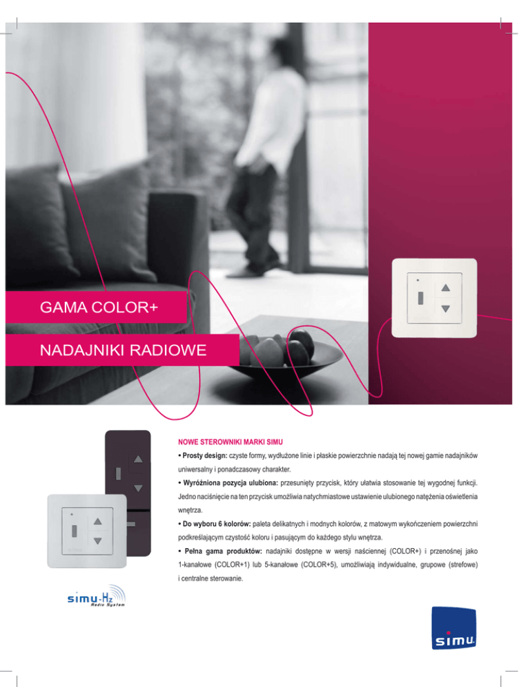 GAMA COLOR+ NADAJNIKI RADIOWE NOWE STEROWNIKI MARKI SIMU • Prosty design: czyste formy, wydłużone linie i płaskie powierzchnie nadają tej nowej gamie nadajników uniwersalny i ponadczasowy charakter. • Wyróżniona pozycja ulubiona: przesunięty przycisk, który ułatwia stosowanie tej wygodnej funkcji. Jedno naciśnięcie na ten przycisk umożliwia natychmiastowe ustawienie ulubionego natężenia oświetlenia wnętrza. • Do wyboru 6 kolorów: paleta delikatnych i modnych kolorów, z matowym wykończeniem powierzchni podkreślającym czystość koloru i pasującym do każdego stylu wnętrza. • Pełna gama produktów: nadajniki dostępne w wersji naściennej (COLOR+) i przenośnej jako 1-kanałowe (COLOR+1) lub 5-kanałowe (COLOR+5), umożliwiają indywidualne, grupowe (strefowe) i centralne sterowanie. NADAJNIKI NAŚCIENNE COLOR+ Biały Metaliczny szary Antracyt Mokka Czarna porzeczka Niebieski KOMBINACJE KOLORÓW: Kolory maskownic nadajników i ramek można modyfikować zamawiając same ramki w celu tworzenia spersonalizowanych nadajników, stosownie do potrzeb klienta. CHARAKTERYSTYKA TECHNICZNA Dioda LED sygnalizująca wysłanie polecenia Przycisk otwieranie (góra) Przycisk: pozycja ulubiona* / stop Przycisk zamykanie (dół) * Jeżeli napęd obsługuje tę funkcję 50 mm 80 mm KLASA PRODUKTU ZASILANIE BATERIA LITOWA TEMPERATURA DZIAŁANIA STOPIEŃ OCHRONY ZASIĘG 10 mm 80 mm CZĘSTOTLIWOŚĆ RADIOWA ZGODNOŚĆ 50 mm klasa III 3 V - typu CR2430 od -0°C do +60°C IP 30 ~ 200 m w otwartym terenie ~ 20 m przez dwie ściany żelbetonowe (zależny od warunków środowiska i zakłóceń radiowych). 433,42 MHz napędy Hz i odbiorniki Hz MONTAŻ ➊ ➊ ZAMONTOWAĆ PŁYTKĘ MONTAŻOWĄ NA ŚCIANIE ➋ ➋ NAŁOŻYĆ RAMKĘ NA PŁYTKĘ MONTAŻOWĄ ➌* ➌ * ZAMONTOWAĆ MODUŁ RADIOWY W RAMCE * Moduł pasuje do niektórych ramek innych producentów osprzętu elektrycznego. Prosimy o kontakt z naszą firmą. NADAJNIKI PRZENOŚNE COLOR+ 1 I COLOR+ 5 Biały Metaliczny szary Antracyt Mokka Czarna porzeczka Niebieski CHARAKTERYSTYKA TECHNICZNA COLOR+ 1 - (1-kanałowy) COLOR+ 5 - (5-kanałowy) Przycisk otwieranie (góra) Przycisk: pozycja ulubiona* / stop Przycisk otwieranie (góra) Przycisk: pozycja ulubiona* / stop Przycisk zamykanie (dół) Dioda LED sygnalizująca wysłanie polecenia + wyświetlanie używanego kanału Dioda LED sygnalizująca wysłanie polecenia * Przycisk zamykanie (dół) Przycisk wyboru kanału Jeżeli napęd obsługuje tę funkcję 42 125 16 KLASA PRODUKTU ZASILANIE BATERIA LITOWA TEMPERATURA DZIAŁANIA STOPIEŃ OCHRONY ZASIĘG klasa III 3 V - typu CR2430 od -0°C do +60°C IP 30 ~ 200 m w otwartym terenie ~ 20 m przez dwie ściany żelbetonowe (zależny od warunków środowiska i zakłóceń radiowych). CZĘSTOTLIWOŚĆ RADIOWA 433,42 MHz ZGODNOŚĆ napędy Hz i odbiorniki Hz NADAJNIK NAŚCIENNY KOMPLETNY KOLOR NUMER REFERENCYJNY JEDNOSTKA OPAKOWANIA Biały 2008194 x1 Biały 2008195 x 10 Metaliczny szary 2008197 x1 Antracyt 2008198 x1 Mokka 2008199 x1 Czarna porzeczka 2008200 x1 Niebieski 2008201 x1 KOLOR NUMER REFERENCYJNY JEDNOSTKA OPAKOWANIA Biały 9017805 x1 Metaliczny szary 9017806 x1 Antracyt 9017807 x1 Mokka 9017808 x1 Czarna porzeczka 9017809 x1 Niebieski 9017810 x1 KOLOR NUMER REFERENCYJNY JEDNOSTKA OPAKOWANIA Biały 2008202 x1 Metaliczny szary 2008203 x1 Antracyt 2008204 x1 Mokka 2008205 x1 Czarna porzeczka 2008206 x1 COLOR+ 1 Niebieski 2008207 x1 NADAJNIK PRZENOŚNY 5-KANAŁOWY KOLOR NUMER REFERENCYJNY JEDNOSTKA OPAKOWANIA Biały 2008208 x1 Metaliczny szary 2008209 x1 Antracyt 2008210 x1 Mokka 2008211 x1 Czarna porzeczka 2008212 x1 Niebieski 2008213 x1 COLOR+ RAMKA NADAJNIK PRZENOŚNY 1-KANAŁOWY COLOR+ 5 Każdy nadajnik jest dostarczany z baterią i uchwytem naściennym (bez śrub). Réalisation SIMU - Dossier 12-009CO/PAO - 10/12 — Document non contractuel. Nous nous réservons le droit à tout moment, dans un souci constant d’évolution et d’amélioration de notre offre, de lui apporter toutes modifications utiles. La responsabilité de SIMU ne saurait être engagée en cas d’utilisation par un non-professionnel. NUMERY REFERENCYJNE