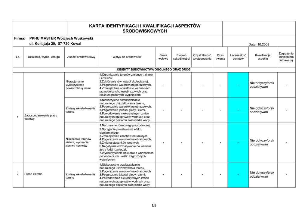 KARTA IDENTYFIKACJI I KWALIFIKACJI ASPEKTÓW ŚRODOWISKOWYCH Firma: Lp. PPHU MASTER Wojciech Wujkowski ul. Kołłątaja 20, 87-720 Kowal Działanie, wyrób, usługa Aspekt środowiskowy Data: 10.2009 Skala wpływu Wpływ na środowisko Stopień szkodliwości Częstotliwość występowania Czas trwania Łączna ilość punktów Kwalifikacja aspektu ZagroŜenie incydentem lub awarią OBIEKTY BUDOWNICTWA OGÓLNEGO ORAZ DROGI 1. 2. Nieracjonalne wykorzystanie powierzchnią ziemi 1.Ograniczanie terenów zielonych, drzew i krzewów 2.Zakłócanie równowagi ekologicznej, 3.Pogorszenie walorów krajobrazowych, 4.Zmniejszanie obiektów o wartościach przyrodniczych, krajobrazowych oraz roślin zagroŜonych wyginięciem - - - - - Nie dotyczy/brak oddziaływań - Zmiany ukształtowania terenu 1.Niekorzystne przekształcanie naturalnego ukształtowania terenu, 2.Pogorszenie walorów krajobrazowych, 3.Pogorszenie jakości gleby i ziemi, 4.Powodowanie niekorzystnych zmian naturalnych przepływów wodnych oraz naturalnego poziomu zwierciadła wody - - - - - Nie dotyczy/brak oddziaływań - Niszczenie terenów zieleni, wycinanie drzew i krzewów 1.Naruszanie równowagi przyrodniczej, 2.Sprzyjanie powstawanie efektu cieplarnianego, 3.Zmniejszanie zasobów naturalnych, 4.Pogorszenie walorów krajobrazowych, 5.Zmiana stosunków wodnych, 6.Negatywne oddziaływanie na warunki Ŝycia ludzi i zwierząt, 7.Wyczerpywanie obiektów o wartościach przyrodniczych i roślin zagroŜonych wyginięciem - - - - - Nie dotyczy/brak oddziaływań - Zmiany ukształtowania terenu 1.Niekorzystne przekształcanie naturalnego ukształtowania terenu, 2.Pogorszenie walorów krajobrazowych 3.Pogarszanie jakości gleby i ziemi, 4.Powodowanie niekorzystnych zmian naturalnych przepływów wodnych oraz naturalnego poziomu zwierciadła wody - - - - - Nie dotyczy/brak oddziaływań - Zagospodarowanie placu budowy Prace ziemne 1/9 Niszczenie terenów zieleni, drzew i krzewów 2. 1.Naruszanie równowagi przyrodniczej, 2.Sprzyjanie powstawaniu efektu cieplarnianego, 3.Zmniejszanie zasobów naturalnych, 4.Pogorszenie walorów krajobrazowych, 5.Wyczerpywanie obiektów o wartościach przyrodniczych i roślin zagroŜonych wyginięciem 6.Negatywne oddziaływanie na warunki Ŝycia ludzi i zwierząt, - - - Emisja do powietrza spalin środków transportu oraz maszyn i urządzeń o napędzie spalinowym 1.Zanieczyszczenie powietrza substancjami niebezpiecznymi dla środowiska, 2.Negatywne oddziaływanie na zdrowie ludzi i zwierząt, 3.Wyczerpanie surowców, 4.Sprzyjanie powstawaniu efektu cieplarnianego i kwaśnych deszczów, Wycieki oleju do ziemi i gleby 1.Zanieczyszczenie ziemi i gleby substancjami niebezpiecznymi dla środowiska, 2.Uszczuplenie surowców naturalnych, 3.Pogorszenie walorów estetycznych środowiska 2 3 1 Wydobywanie i przemieszczanie gleby, ziemi i kamieni 1.Zanieczyszczenie gleby i ziemi odpadami niebezpiecznymi dla środowiska, 2.Naruszanie równowagi przyrodniczej, 3.Pogorszenie walorów krajobrazowych, 4.Powodowanie niekorzystnych zmian naturalnych przepływów wodnych oraz naturalnego poziomu zwierciadła wody - - Wykonanie wykopów obiektów drogowych 1.Powodowanie niekorzystnych zmian naturalnych przepływów wodnych oraz naturalnego poziomu zwierciadła wody, 2.Pogorszenie jakości gleby, 3.Zanieczyszczenia ziemi i gleby, 4.Pogorszenie walorów krajobrazowych - 2 Prace ziemne, c.d. 3 Hałas i drgania spowodowane pracą środków transportu, urządzeń i sprzętu 1.Negatywne oddziaływanie na zdrowie i warunki Ŝycia ludzi i zwierząt Mycie sprzętu, urządzeń i środków transportu 1.Zanieczyszczenie ziemi, gleby i wody substancjami szkodliwymi dla środowiska (oleje, środki myjące), 2.Zakwaszanie gleby, 3.Nadmierna eksploatacja zasobów wodnych, 4.Pogarszanie walorów estetycznych środowiska, 2/9 - - Nie dotyczy/brak oddziaływań - 13 Aspekt znaczący dla środowiska Odpady niebezpieczne dla środowiska Tak 2 8 Aspekt mało znaczący dla środowiska Odpady niebezpieczne dla środowiska Tak - - - - - - - 3 3 2 10 4 3 3 Nie dotyczy/brak oddziaływań Nie dotyczy/brak oddziaływań Aspekt znaczący dla środowiska - - Tak Nie dotyczy/brak oddziaływań - - - - - - 3. Rozbiórka obiektów budowlanych po zakończeniu działalności 4. Odpady betonu, gruzu 1.Uszczuplanie zasobów naturalnych, 2.Zanieczyszczenie ziemi, gleby i wody, 3.Pogorszenie walorów estetycznych środowiska, 4.Pogorszenie jakości gleby i ziemi, 2 2 3 2 - - - - 9 Emisja pyłów cementowowapiennych 1.Zanieczyszczenie powietrza pyłem cementowym i wapiennym, 2.Pogorszenie jakości ziemi i gleby, 3.Wyczerpywanie zasobów naturalnych, 4.Negatywne oddziaływanie na zdrowie i warunki Ŝycia ludzi, zwierząt i roślin, Wykorzystywanie kruszyw, wapna i cementu w procesie budowy obiektów 1.Uszczuplenie zasobów naturalnych, 2.Zanieczyszczanie powietrza, gleby i ziemi oraz efekt cieplarniany i kwaśne deszcze związane z procesem produkcji cementu i wapna, 3.Pogorszenie warunków krajobrazowych oraz równowagi przyrodniczej w rejonie wydobycia kruszyw, 4.Powodowanie niekorzystnych zmian naturalnych przepływów wody i naturalnego zwierciadła wody w związku z wydobywaniem kruszyw, 5.Zanieczyszczenie gleby, ziemi i wody odpadami, 6.Zanieczyszczenie powietrza substancjami niebezpiecznymi , efekt cieplarniany i kwaśne deszcze związanymi z transportem odpadów - - - - - 1.Uszczuplenie zasobów naturalnych, 2.Zanieczyszczanie powietrza, gleby i ziemi oraz efekt cieplarniany i kwaśne deszcze związane z procesem produkcji cementu i wapna, 3.Zanieczyszczenie powietrza substancjami niebezpiecznymi, powstawanie efektu cieplarnianego oraz kwaśne deszcze związane z transportem odpadów, 4.Pogorszenie warunków krajobrazowych oraz równowagi przyrodniczej związane z procesem wydobycia kruszyw, 5.Powodowanie niekorzystnych zmian naturalnych przepływów wody i naturalnego zwierciadła wody w procesie wydobywania kruszyw, 6.Zanieczyszczenie ziemi, gleby i wody odpa