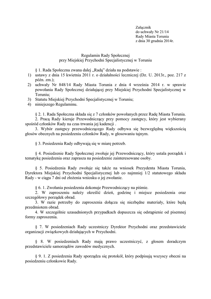 Załącznik do uchwały Nr 21/14 Rady Miasta Torunia z dnia 30 grudnia 2014r. Regulamin Rady Społecznej przy Miejskiej Przychodni Specjalistycznej w Toruniu § 1. Rada Społeczna zwana dalej „Radą” działa na podstawie : 1) ustawy z dnia 15 kwietnia 2011 r. o działalności leczniczej (Dz. U. 2013r., poz. 217 z późn. zm.); 2) uchwały Nr 848/14 Rady Miasta Torunia z dnia 4 września 2014 r. w sprawie powołania Rady Społecznej działającej przy Miejskiej Przychodni Specjalistycznej w Toruniu; 3) Statutu Miejskiej Przychodni Specjalistycznej w Toruniu; 4) niniejszego Regulaminu. § 2. 1. Rada Społeczna składa się z 7 członków powołanych przez Radę Miasta Torunia. 2. Pracą Rady kieruje Przewodniczący przy pomocy zastępcy, który jest wybierany spośród członków Rady na czas trwania jej kadencji . 3. Wybór zastępcy przewodniczącego Rady odbywa się bezwzględną większością głosów obecnych na posiedzeniu członków Rady, w głosowaniu tajnym. § 3. Posiedzenia Rady odbywają się w miarę potrzeb. § 4. Posiedzenie Rady Społecznej zwołuje jej Przewodniczący, który ustala porządek i tematykę posiedzenia oraz zaprasza na posiedzenie zainteresowane osoby. § 5. Posiedzenia Rady zwołuje się także na wniosek Prezydenta Miasta Torunia, Dyrektora Miejskiej Przychodni Specjalistycznej lub co najmniej 1/2 statutowego składu Rady - w ciągu 7 dni od złożenia wniosku o jej zwołanie. § 6. 1. Zwołania posiedzenia dokonuje Przewodniczący na piśmie. 2. W zaproszeniu należy określić dzień, godzinę i miejsce posiedzenia oraz szczegółowy porządek obrad. 3. W razie potrzeby do zaproszenia dołącza się niezbędne materiały, które będą przedmiotem obrad. 4. W szczególnie uzasadnionych przypadkach dopuszcza się odstąpienie od pisemnej formy zaproszenia. § 7. W posiedzeniach Rady uczestniczy Dyrektor Przychodni oraz przedstawiciele organizacji związkowych działających w Przychodni. § 8. W posiedzeniach Rady mają prawo uczestniczyć, z głosem doradczym przedstawiciele samorządów zawodów medycznych. § 9. 1. Z posiedzenia Rady sporządza się protokół, który podpisują wszyscy obecni na posiedzeniu członkowie Rady. 2. Protokół, o którym mowa w ust. 1. powinien zawierać kolejny numer protokołu, datę i miejsce posiedzenia, listę obecności, porządek obrad, teksty uchwał, sposób i wyniki głosowania. Do protokołu powinny być dołączone zdania odrębne członków obecnych. § 10. W razie sprzeczności interesów Przychodni z osobistymi interesami członka Rady lub jego współmałżonka członek Rady powinien wstrzymać się od udziału w rozstrzygnięciu sprawy i zażądać zaznaczenia tego w protokole. § 11. Rada podejmuje rozstrzygnięcia w formie uchwał. § 12. 1. Dla ważności uchwał podejmowanych na posiedzeniach Rady wymagane jest zaproszenie wszystkich członków oraz osób uprawnionych do uczestnictwa w posiedzeniach i obecność co najmniej 4 członków Rady. 2. W przypadkach szczególnie uzasadnionych uchwały mogą być podejmowane poza posiedzeniami Rady w głosowaniu drogą mailową. Decyzję o przeprowadzeniu takiego głosowania podejmuje Przewodniczący Rady. 3. Uchwały podejmuje się zwykłą większością głosów. § 13. 1. Głosowania są jawne z zastrzeżeniem ust. 2 i ust. 3. 2. Głosowania tajne przeprowadza się w sprawach: 1) personalnych, 2) opinii o odwołaniu Dyrektora Przychodni. 3. Głosowanie tajne przeprowadza się również na wniosek członka Rady w trybie przewidzianym dla podejmowania uchwał. § 14. W przypadku czasowej niemożności pełnienia funkcji przez Przewodniczącego Rady posiedzenia zwołuje i im przewodniczy zastępca Przewodniczącego Rady. § 15. Obsługę kancelaryjną, organizacyjną i techniczną Rady Społecznej zapewnia Przychodnia. § 16. Od uchwał Rady Społecznej Dyrektorowi Przychodni przysługuje odwołanie do Rady Miasta Torunia. § 17. Traci moc Regulamin Rady Społecznej zatwierdzony uchwałą Nr 931/10 Rady Miasta Torunia z dnia 4 listopada 2010 r. w sprawie zatwierdzenia regulaminu działalności Rady Społecznej przy Miejskiej Przychodni Specjalistycznej w Toruniu. § 18. Regulamin niniejszy wchodzi w życie po zatwierdzeniu przez Radę Miasta Torunia.