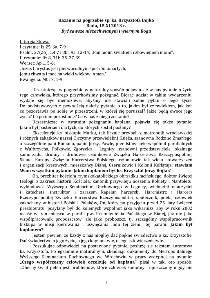 Kazanie na pogrzebie śp. ks. Krzysztofa Bojko Biała, 15 XI 2013 r. Być zawsze niezachwianym i wiernym Bogu Liturgia Słowa: I czytanie: Iz 25, 6a. 7-‐9 Psalm: 27(26), 1.4.7 i 8b i 9a. 13-‐14; „Pan moim światłem i zbawieniem moim”. II czytanie: Rz 8, 31b-‐35. 37-‐39 Werset: Ap 1, 5-‐6; „Jezus Chrystus jest pierworodnym spośród umarłych, Jemu chwała i moc na wieki wieków. Amen.” Ewangelia: Mt 17, 1-‐9 Uczestnicząc w pogrzebie w naturalny sposób pojawia się w nas pytanie o życie tego człowieka, którego przychodzimy pożegnać. Biorąc udział w takim wydarzeniu, wydaje się być niemożliwe, abyśmy nie stawiali sobie pytań o jego życie. Do podstawowych z pewnością należy pytanie o to, jakim był człowiekiem, jak żył, co pozostawia po sobie w przestrzeni, w której się poruszał? Jakie będą owoce jego życia? Co po nim pozostanie? Co w nas z niego zostanie? Uczestnicząc w ostatnim pożegnaniu kapłana, pojawia się także pytanie: Jakim był pasterzem dla tych, do których został posłany? Ekscelencjo ks. biskupie Marku, tak licznie przybyli z metropolii wrocławskiej i różnych zakątków naszej Ojczyzny przewielebni Księża, szanowna Rodzino Zmarłego, a szczególnie pani Romano, panie Jerzy, Pawle, przedstawiciele wspólnot parafialnych z Wałbrzycha, Polkowic, Zgorzelca i Legnicy, szanowni przedstawiciele lokalnego samorządu, druhny i druhowie członkowie Związku Harcerstwa Rzeczypospolitej, Skauci Europy, Związku Harcerstwa Polskiego, członkowie tak wielu stowarzyszeń i organizacji kresowych, mieszkańcy Białej, Czernikowic i Kolonii Kołłątaja: stawiam Wam wszystkim pytanie: Jakim kapłanem był ks. Krzysztof Jerzy Bojko? On, prezbiter kościoła rzymskokatolickiego obrządku łacińskiego, doktor świętej teologii z zakresu historii Kościoła, kanonik przywileju noszenia Rokiety i Mantoletu, wykładowca Wyższego Seminarium Duchownego w Legnicy, wieloletni nauczyciel i katecheta, instruktor i zarazem kapelan harcerski, Harcmistrz i Harcerz Rzeczypospolitej Związku Harcerstwa Rzeczypospolitej, społecznik, poeta, człowiek zakochany w historii Polski i Polaków, On, który po przyjęciu przed 25. laty święceń prezbiteratu, posyłany był do kolejnych wspólnot jako wikariusz, aby w roku 2002 osiąść w tym miejscu w parafii pw. Przemienienia Pańskiego w Białej, już nie jako współpracownik proboszczów, ale jako proboszcz, tj. szczególny współpracownik biskupa w misji kierowania i uświęcania ludu tej ziemi, tej parafii: Jakim był kapłanem? Jestem pewien, że każdy z nas mógłby dać piękne świadectwo o ks. Krzysztofie. Dać świadectwo o jego życiu, o jego kapłaństwie, o jego człowieczeństwie. Poszukując odpowiedzi na postawione pytanie, posłużę się tekstem autorstwa ks. Krzysztofa. Po egzaminie maturalnym, składając dokumenty do Metropolitalnego Wyższego Seminarium Duchownego we Wrocławiu w pracy wstępnej na pytanie: „Czego współczesny człowiek oczekuje od kapłana”, pisał w taki oto sposób: „Obecny świat pełen jest problemów, które człowiek samotny i opuszczony nigdy nie 1 rozwiąże. Ludzie, którzy odrzucili Boga i odwrócili się od innych, zatracają poczucie sensu życia. Często śmierć samobójcza, załamanie moralne powodują, że ludzie tacy zatracają się i skazują na wieczne cierpienie. Kapłan, to człowiek niosący Boga do tych wszystkich ludzi, samotnych, opuszczonych, załamanych, to ten, który za sobą pociąga wielu i kieruje ich na właściwą drogę, to Bóg, który kroczy na Ziemi i pokazuje ludziom jak mają żyć, aby byli zbawieni. Współczesny człowiek stawia przed Sługą Bożym wysokie wymagania i krytyczniej ocenia go niż każdego innego człowieka. Szczególna obserwacja, która służy sprawdzeniu czy podlega on wymaganiom które powinien spełniać, aby jego służba była w pełni wartościowa. Najważniejszą sprawą w życiu kapłana jest służba Bogu. Bezgraniczne oddanie Jezusowi, aby kierował nim i aby wysyłał go tam, gdzie będzie potrzebny. Bóg czyni ze swojego sługi pośrednika między nim a ludźmi. To wielkie zadanie do spełnienia, ale i wielka odpowiedzialność. Bo przecież on, kapłan, będzie prowadził ludzi do Zbawiciela. Służba człowiekowi. Niesienie pomocy duchowej załamanemu czy wątpiącemu. Pogłębienie i umocnienie wiary wszystkich wierzących. Niesienie im Boga i ukazywanie jego miłości. Służba w każdej chwili życia. Musi być gotów na każde wezwanie, bo od niego zależy często życie i szczęście ludzi. Służba człowiekowi nakłada wiele obowiązków, czyni z kapłana, jako przedstawiciela Chrystusa, powiernika i wspomożyciela w trudnych sytuacjach życiowych. Kapłan niesie do ludzi Boga i jego słowo. Słowo Życia, które Jezus polecił głosić wszystkim ludom na Ziemi, gdy odchodził do Ojca. Głoszenie Słowa Bożego to niesienie pomocy chrześcijanom, to umożliwienie uzyskania zbawienia przez narody nie znające Boga. Przybliżenie Chrystusa narodom całego świata czyni z przedstawicieli Kościoła – wysłanników Jezusa, posiadających moc Ducha Świętego i wiarę, misjonarzy dzisiejszego świata, głoszących na pustyniach pozbawionych miłości i wiary, a pełnych nienawiści i wojny. Kapłan potrzebny jest każdemu człowiekowi wierzącemu, we wszystkich chwilach życia. On przyjmuje dzieci nowonarodzone do grona Kościoła katolickiego, przez chrzest, udziela Pierwszej Komunii, przybliża do Zbawcy w Sakramencie Pojednania, udziela Sakramentu Małżeństwa. Jest gotów nieść pomoc ludziom potrzebującym i stojącym w obliczu śmierci, Sakrament Namaszczenia Chorych. Ta jego obecność czyni z niego człowieka, gotowego pójść na każde wezwanie, do potrzebującego Boga. Jego postawa ma być przykładem miłości i pokoju. Jego słowa, myśli i czyny mają zawsze służyć Bogu do niesienia wśród ludzi Bożego zbawienia. A to ma przejawiać się w miłości każdeg