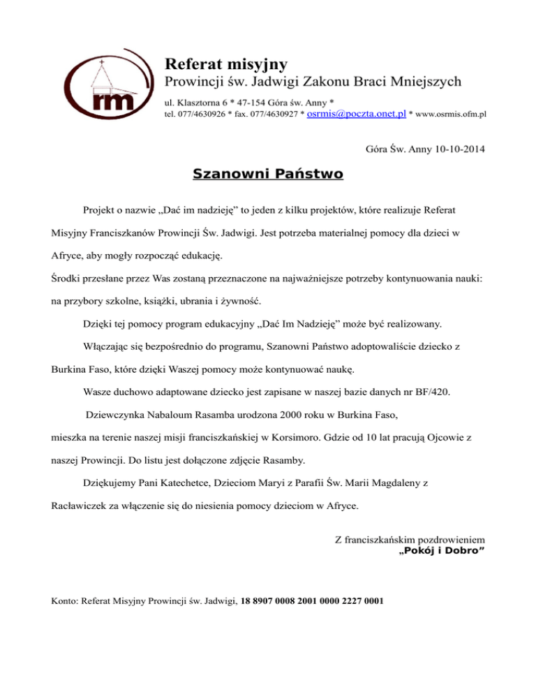 Referat misyjny Prowincji św. Jadwigi Zakonu Braci Mniejszych ul. Klasztorna 6 * 47-154 Góra św. Anny * tel. 077/4630926 * fax. 077/4630927 * [email protected] * www.osrmis.ofm.pl Góra Św. Anny 10-10-2014 Szanowni Państwo Projekt o nazwie „Dać im nadzieję” to jeden z kilku projektów, które realizuje Referat Misyjny Franciszkanów Prowincji Św. Jadwigi. Jest potrzeba materialnej pomocy dla dzieci w Afryce, aby mogły rozpocząć edukację. Środki przesłane przez Was zostaną przeznaczone na najważniejsze potrzeby kontynuowania nauki: na przybory szkolne, książki, ubrania i żywność. Dzięki tej pomocy program edukacyjny „Dać Im Nadzieję” może być realizowany. Włączając się bezpośrednio do programu, Szanowni Państwo adoptowaliście dziecko z Burkina Faso, które dzięki Waszej pomocy może kontynuować naukę. Wasze duchowo adaptowane dziecko jest zapisane w naszej bazie danych nr BF/420. Dziewczynka Nabaloum Rasamba urodzona 2000 roku w Burkina Faso, mieszka na terenie naszej misji franciszkańskiej w Korsimoro. Gdzie od 10 lat pracują Ojcowie z naszej Prowincji. Do listu jest dołączone zdjęcie Rasamby. Dziękujemy Pani Katechetce, Dzieciom Maryi z Parafii Św. Marii Magdaleny z Racławiczek za włączenie się do niesienia pomocy dzieciom w Afryce. Z franciszkańskim pozdrowieniem „Pokój i Dobro” Konto: Referat Misyjny Prowincji św. Jadwigi, 18 8907 0008 2001 0000 2227 0001