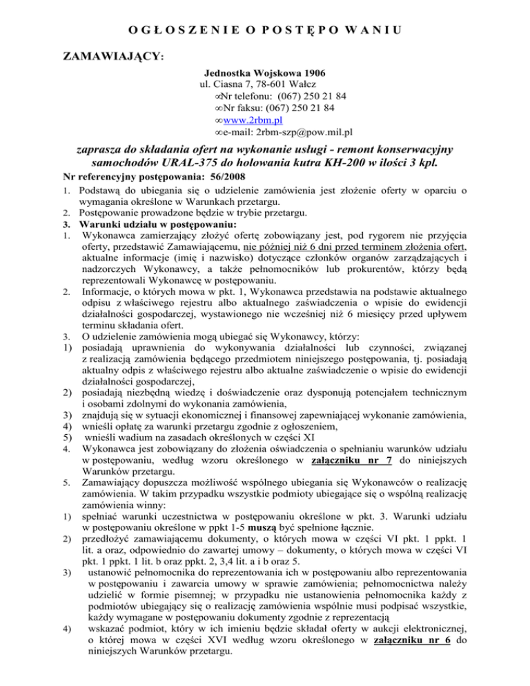 OGŁOSZENIE O POSTĘPO WANIU ZAMAWIAJĄCY: Jednostka Wojskowa 1906 ul. Ciasna 7, 78-601 Wałcz • Nr telefonu: (067) 250 21 84 • Nr faksu: (067) 250 21 84 • www.2rbm.pl • e-mail: [email protected] zaprasza do składania ofert na wykonanie usługi - remont konserwacyjny samochodów URAL-375 do holowania kutra KH-200 w ilości 3 kpl. Nr referencyjny postępowania: 56/2008 1. Podstawą do ubiegania się o udzielenie zamówienia jest złoŜenie oferty w oparciu o wymagania określone w Warunkach przetargu. 2. Postępowanie prowadzone będzie w trybie przetargu. 3. Warunki udziału w postępowaniu: 1. Wykonawca zamierzający złoŜyć ofertę zobowiązany jest, pod rygorem nie przyjęcia oferty, przedstawić Zamawiającemu, nie później niŜ 6 dni przed terminem złoŜenia ofert, aktualne informacje (imię i nazwisko) dotyczące członków organów zarządzających i nadzorczych Wykonawcy, a takŜe pełnomocników lub prokurentów, którzy będą reprezentowali Wykonawcę w postępowaniu. 2. Informacje, o których mowa w pkt. 1, Wykonawca przedstawia na podstawie aktualnego odpisu z właściwego rejestru albo aktualnego zaświadczenia o wpisie do ewidencji działalności gospodarczej, wystawionego nie wcześniej niŜ 6 miesięcy przed upływem terminu składania ofert. 3. O udzielenie zamówienia mogą ubiegać się Wykonawcy, którzy: 1) posiadają uprawnienia do wykonywania działalności lub czynności, związanej z realizacją zamówienia będącego przedmiotem niniejszego postępowania, tj. posiadają aktualny odpis z właściwego rejestru albo aktualne zaświadczenie o wpisie do ewidencji działalności gospodarczej, 2) posiadają niezbędną wiedzę i doświadczenie oraz dysponują potencjałem technicznym i osobami zdolnymi do wykonania zamówienia, 3) znajdują się w sytuacji ekonomicznej i finansowej zapewniającej wykonanie zamówienia, 4) wnieśli opłatę za warunki przetargu zgodnie z ogłoszeniem, 5) wnieśli wadium na zasadach określonych w części XI 4. Wykonawca jest zobowiązany do złoŜenia oświadczenia o spełnianiu warunków udziału w postępowaniu, według wzoru określonego w załączniku nr 7 do niniejszych Warunków przetargu. 5. Zamawiający dopuszcza moŜliwość wspólnego ubiegania się Wykonawców o realizację zamówienia. W takim przypadku wszystkie podmioty ubiegające się o wspólną realizację zamówienia winny: 1) spełniać warunki uczestnictwa w postępowaniu określone w pkt. 3. Warunki udziału w postępowaniu określone w ppkt 1-5 muszą być spełnione łącznie. 2) przedłoŜyć zamawiającemu dokumenty, o których mowa w części VI pkt. 1 ppkt. 1 lit. a oraz, odpowiednio do zawartej umowy – dokumenty, o których mowa w części VI pkt. 1 ppkt. 1 lit. b oraz ppkt. 2, 3,4 lit. a i b oraz 5. 3) ustanowić pełnomocnika do reprezentowania ich w postępowaniu albo reprezentowania w postępowaniu i zawarcia umowy w sprawie zamówienia; pełnomocnictwa naleŜy udzielić w formie pisemnej; w przypadku nie ustanowienia pełnomocnika kaŜdy z podmiotów ubiegający się o realizację zamówienia wspólnie musi podpisać wszystkie, kaŜdy wymagane w postępowaniu dokumenty zgodnie z reprezentacją 4) wskazać podmiot, który w ich imieniu będzie składał oferty w aukcji elektronicznej, o której mowa w części XVI według wzoru określonego w załączniku nr 6 do niniejszych Warunków przetargu. 5) 6) 4. 1. 1) a) b) 2) 3) 2. 1) 2) a) b) 3) 3. 1) dołączyć do oferty poświadczoną za zgodność z oryginałem kopię umowy w sprawie wspólnej realizacji zamówienia (np. umowę konsorcjum) oraz oryginał pełnomocnictwa, jeŜeli takie występuje, złoŜyć wspólne oświadczenie, o którym mowa w pkt. 4. Dokumenty i oświadczenia wymagane w ofercie od Wykonawcy W celu potwierdzenia spełnienia warunków udziału w postępowaniu wykonawca zobowiązany jest przedstawić: w zakresie potwierdzenia, Ŝe Wykonawca posiada uprawnienia do wykonywania działalności lub czynności, związanej z realizacją zamówienia będącego przedmiotem niniejszego postępowania: aktualny odpis z właściwego rejestru albo aktualne zaświadczenie o wpisie do ewidencji działalności gospodarczej, jeŜeli odrębne przepisy wymagają wpisu do rejestru lub zgłoszenia do ewidencji działalności gospodarczej, wystawione nie wcześniej niŜ 6 miesięcy przed upływem terminu składania ofert; koncesję na podjęcie działalności gospodarczej w zakresie objętym zamówieniem i dotyczącym wykazu wyrobów o przeznaczeniu wojskowym ujętym w części WT III (Pojazdy naziemne, w tym ciągniki (z wyłączeniem cywilnych samochodów lub cięŜarówek przeznaczonych do przewozu pieniędzy i kosztowności wyposaŜonych w osłony pancerne) i ich elementy), pkt. 5 ppkt. 2 załącznika nr 2 do Rozporządzenia Rady Ministrów z dnia 3 grudnia 2001r. w sprawie rodzajów broni i amunicji oraz wykazu wyrobów i technologii o przeznaczeniu wojskowym lub policyjnym, na których wytwarzanie lub obrót jest wymagana koncesja (Dz. U. z dnia 18 grudnia 2001r. Nr 145, poz. 1625) w zakresie potwierdzenia, Ŝe Wykonawca posiada niezbędną wiedzę i doświadczenie oraz dysponuje potencjałem technicznym i osobami zdolnymi do wykonania zamówienia - wykaz wykonanych w okresie ostatnich trzech lat co najmniej dwóch usług, a jeŜeli okres prowadzenia działalności jest krótszy – w tym okresie, odpowiadających swoim rodzajem i wartością usługom stanowiącym przedmiot zamówienia (łączna wartość zrealizowanych umów min. 224 600,00 zł.), z podaniem ich wartości, przedmiotu, dat wykonania i odbiorców oraz załączenie dokumentów potwierdzających, Ŝe usługi te zostały wykonane i zostały wykonane naleŜycie. w celu potwierdzenia, Ŝe Wykonawca znajduje się w sytuacji ekonomicznej i finansowej zapewniającej wykonanie zamówienia – polisę lub inny dokument ubezpieczenia potwierdzający, Ŝe wykonawca jest ubezpieczony od odpowiedzialności cywilnej w zakresie prowadzone