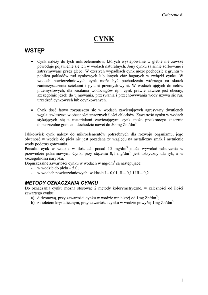 Ćwiczenie 6. CYNK WSTĘP • Cynk należy do tych mikroelementów, których występowanie w glebie nie zawsze powoduje pojawienie się ich w wodach naturalnych. Jony cynku są silnie sorbowane i zatrzymywane przez glebę. W częstych wypadkach cynk może pochodzić z gruntu w pobliżu pokładów rud cynkowych lub innych złóż bogatych w związki cynku. W wodach powierzchniowych cynk może być pochodzenia wtórnego na skutek zanieczyszczenia ściekami i pyłami przemysłowymi. W wodach ujętych do celów przemysłowych, dla zasilania wodociągów itp., cynk prawie zawsze jest obecny, szczególnie jeżeli do ujmowania, przesyłania i przechowywania wody używa się rur, urządzeń cynkowych lub ocynkowanych. • Cynk dość łatwo rozpuszcza się w wodach zawierających agresywny dwutlenek węgla, zwłaszcza w obecności znacznych ilości chlorków. Zawartość cynku w wodach stykających się z materiałami zawierającymi cynk może przekroczyć znacznie dopuszczalne granice i dochodzić nawet do 50 mg Zn /dm3. Jakkolwiek cynk należy do mikroelementów potrzebnych dla rozwoju organizmu, jego obecność w wodzie do picia nie jest pożądana ze względu na metaliczny smak i mętnienie wody podczas gotowania. Ponadto cynk w wodzie w ilościach ponad 15 mg/dm3 może wywołać zaburzenia w przewodzie pokarmowym. Cynk, przy stężeniu 0,1 mg/dm3, jest toksyczny dla ryb, a w szczególności narybku. Dopuszczalne zawartości cynku w wodach w mg/dm3 są następujące: - w wodzie do picia – 5,0; - w wodach powierzchniowych: w klasie I – 0,01, II – 0,1 i III – 0,2. METODY OZNACZANIA CYNKU Do oznaczania cynku można stosować 2 metody kolorymetryczne, w zależności od ilości zawartego cynku: a) ditizonową, przy zawartości cynku w wodzie mniejszej od 1mg Zn/dm3; b) z fioletem krystalicznym, przy zawartości cynku w wodzie powyżej 1mg Zn/dm3. 1