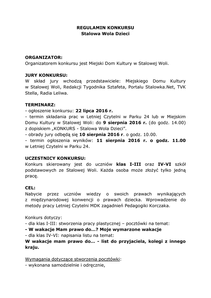REGULAMIN KONKURSU Stalowa Wola Dzieci ORGANIZATOR: Organizatorem konkursu jest Miejski Dom Kultury w Stalowej Woli. JURY KONKURSU: W skład jury wchodzą przedstawiciele: Miejskiego Domu Kultury w Stalowej Woli, Redakcji Tygodnika Sztafeta, Portalu Stalowka.Net, TVK Stella, Radia Leliwa. TERMINARZ: - ogłoszenie konkursu: 22 lipca 2016 r. - termin składania prac w Letniej Czytelni w Parku Domu Kultury w Stalowej Woli: do 9 sierpnia 2016 z dopiskiem „KONKURS - Stalowa Wola Dzieci”. - obrady jury odbędą się 10 sierpnia 2016 r. o godz. - termin ogłoszenia wyników: 11 sierpnia 2016 w Letniej Czytelni w Parku 24. 24 lub w Miejskim r. (do godz. 14.00) 10.00. r. o godz. 11.00 UCZESTNICY KONKURSU: Konkurs skierowany jest do uczniów klas I-III oraz IV-VI szkół podstawowych ze Stalowej Woli. Każda osoba może złożyć tylko jedną pracę. CEL: Nabycie przez uczniów wiedzy o swoich prawach wynikających z międzynarodowej konwencji o prawach dziecka. Wprowadzenie do metody pracy Letniej Czytelni MDK zagadnień Pedagogiki Korczaka. Konkurs dotyczy: - dla klas I-III: stworzenia pracy plastycznej – pocztówki na temat: - W wakacje Mam prawo do…? Moje wymarzone wakacje - dla klas IV-VI: napisania listu na temat: W wakacje mam prawo do… - list do przyjaciela, kolegi z innego kraju. Wymagania dotyczące stworzenia pocztówki: - wykonana samodzielnie i odręcznie, - nie większa niż strona formatu A5, - włożona do podpisanej koperty z dopiskiem: „KONKURS - Stalowa Wola Dzieci”, - wykonana techniką dowolną. Ocenie podlegać będzie: - samodzielność wykonania, - estetyka pracy, - zgodność z tematem, - bogata i ciekawa treść. Wymagania dotyczące napisania listu: - napisany samodzielnie i odręcznie, - nie dłuższy niż strona formatu A4, - włożony do podpisanej koperty z dopiskiem „KONKURS - Stalowa Wola Dzieci”. Ocenie podlegać będzie: - samodzielność pisania, - estetyka pisma, - zgodność z tematem, - bogata i ciekawa treść, - poprawność gramatyczna i językowa, - strona graficzna i formalna listu (należy pamiętać o miejscowości, dacie w prawym górnym rogu kartki, nagłówku ze znakiem interpunkcyjnym, zwrocie grzecznościowym, podpisie, akapitach, pisowni zaimków wielkimi literami: Ty, Twoich, Tobie, Cię, Ciebie, itd.). FORMA SKŁADANIA PRAC: Napisany list czy wykonaną pracę plastyczną, włożone do podpisanej koperty: z dopiskiem: „KONKURS - Stalowa Wola Dzieci”, należy składać w Letniej Czytelni w Parku 24 lub w sekretariacie Miejskiego Domu Kultury w Stalowej Woli w terminie do 9 sierpnia 2016 r. do godz. 14.00. Do wykonanej pracy konkursowej należy dołączyć karteczkę ze swoimi danymi: imię, nazwisko, szkoła, klasa i numer telefonu. NAGRODA: Nagroda główna – za zajęcie I. miejsca oraz wyróżnienia. Zwycięskie prace z obu kategorii zostaną opublikowane w kolejnym wydaniu tygodnika Sztafeta. PRAWA AUTORSKIE: Organizator ma prawo do bezpłatnej prezentacji wszystkich prac. Organizatorowi konkursu przysługuje prawo do bezpłatnego korzystania ze wszystkich otrzymanych prac konkursowych na następujących polach eksploatacji: - zwielokrotniania poprzez fotografowanie, drukowanie, wykonywanie odbitek przy użyciu nośników cyfrowych, technik video, techniką komputerową lub przy pomocy rzutnika, - publicznego udostępniania, odczytywania na ogólnodostępnych imprezach i wydarzeniach kulturalnych dla celów promocyjnych organizatora konkursu oraz w środkach masowego przekazu, a także wprowadzania do pamięci komputera, przesyłania za pomocą sieci multimedialnej, Internetu. Organizator ma obowiązek podczas w/w form prezentacji oraz udostępniania, podpisywać autorów prezentowanych prac. DANE KONTAKTOWE: Pytania związane z konkursem prosimy kierować do animatorów Parku 24 pod numerem telefonu: (15) 842 09 50, wew. 118. Koordynator projektu: Iza Wrzosek, tel: 781121107 REGULAMIN KONKURSU Stalowa Wola Dzieci ORGANIZATOR: Organizatorem konkursu jest Miejski Dom Kultury w Stalowej Woli. JURY KONKURSU: W skład jury wchodzą przedstawiciele: Miejskiego Domu Kultury w Stalowej Woli, Redakcji Tygodnika Sztafeta, Portalu Stalowka.Net, TVK Stella, Radia Leliwa. TERMINARZ: - ogłoszenie konkursu: 22 lipca 2016 r. - termin składania prac w Letniej Czytelni w Parku Domu Kultury w Stalowej Woli: do 9 sierpnia 2016 z dopiskiem „KONKURS - Stalowa Wola Dzieci”. - obrady jury odbędą się 10 sierpnia 2016 r. o godz. - termin ogłoszenia wyników: 11 sierpnia 2016 w Letniej Czytelni w Parku 24. 24 lub w Miejskim r. (do godz. 14.00) 10.00. r. o godz. 11.00 UCZESTNICY KONKURSU: Konkurs skierowany jest do uczniów klas I-III oraz IV-VI szkół podstawowych ze Stalowej Woli. Każda osoba może złożyć tylko jedną pracę. CEL: Nabycie przez uczniów wiedzy o swoich prawach wynikających z międzynarodowej konwencji o prawach dziecka. Wprowadzenie do metody pracy Letniej Czytelni MDK zagadnień Pedagogiki Korczaka. Konkurs dotyczy: - dla klas I-III: stworzenia pracy plastycznej – pocztówki na temat: - W wakacje Mam prawo do…? Moje wymarzone wakacje - dla klas IV-VI: napisania listu na temat: W wakacje mam prawo do… - list do przyjaciela, kolegi z innego kraju. Wymagania dotyczące stworzenia pocztówki: - wykonana samodzielnie i odręcznie, - nie większa niż strona formatu A5, - włożona do podpisanej koperty z dopiskiem: „KONKURS - Stalowa Wola Dzieci”, - wykonana techniką dowolną. Ocenie podlegać będzie: - samodzielność wykonania, - estetyka pracy, - zgodność z tematem, - bogata i ciekawa treść. Wymagania dotyczące napisania listu: - napisany samodzielnie i odręcznie, - nie dłuższy niż strona formatu A4, - włożony do podpisanej koperty z dopiskiem „KONKURS - Stalowa Wola Dzieci”. Ocenie podlegać będzie: - samodzielność pisania, - estetyka pisma, - zgodność z tematem, - bogata i ciekawa treść, - poprawność gramatyczna i językowa, - strona graficzna i formalna listu (należy pamię