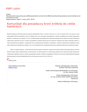KWP Lublin Źródło: http://bip.lublin.kwp.policja.gov.pl/KWL/pozwolenia-na-bron-lice/11685,Komunikat-dla-posiadaczy-broni-krotkiej-do-cel ow-lowieckich.html Wygenerowano: Piątek, 3 marca 2017, 00:25 Komunikat dla posiadaczy broni krótkiej do celów łowieckich. Wydział Postępowań Administracyjnych Komendy Wojewódzkiej Policji w Lublinie informuje, że w dniu 14 grudnia 2011 roku weszło w życie rozporządzenie Ministra Środowiska z dnia 15 listopada 2011 roku zmieniające rozporządzenie w sprawie szczegółowych warunków wykonywania polowania i znakowania tusz. Zgodnie z § 3 ust 1 przedmiotowego rozporządzenia do wykonywania polowania oraz odstrzału zwierząt stanowiących nadzwyczajne zagrożenie dla życia, zdrowia lub gospodarki człowieka dopuszczona jest wyłącznie myśliwska broń długa centralnego zapłonu, o lufach gwintowanych lub gładkich, z wyłączeniem broni czarnoprochowej, pistoletów i rewolwerów, z której po maksymalnym załadowaniu można oddać najwyżej sześć pojedynczych strzałów z tym, że do magazynka broni samopowtarzalnej można załadować jednorazowo najwyżej dwa naboje. Mając na uwadze powyższe, w chwili obecnej brak jest prawnych możliwości używania broni palnej krótkiej centralnego zapłonu oraz broni palnej bocznego zapłonu zarejestrowanej z przeznaczeniem do celów łowieckich, do wykonywania polowania oraz odstrzału zwierząt stanowiących nadzwyczajne zagrożenie dla życia, zdrowia lub gospodarki człowieka. Wszelkich szczegółowych informacji na ten temat udziela Wydział Postępowań Administracyjnych Komendy Wojewódzkiej Policji w Lublinie pod numerem tel. (81) 535 44 74. Metryczka Data publikacji 21.02.2012 Rejestr zmian Podmiot udostępniający informację: Biuletyn Informacji Publicznej Osoba wytwarzająca/odpowiadająca za informację: mł. asp. Andrzej Fijołek Osoba udostępniająca informację: mł. asp. Andrzej Fijołek Zespół Komunikacji Społecznej Osoba modyfikująca informację: