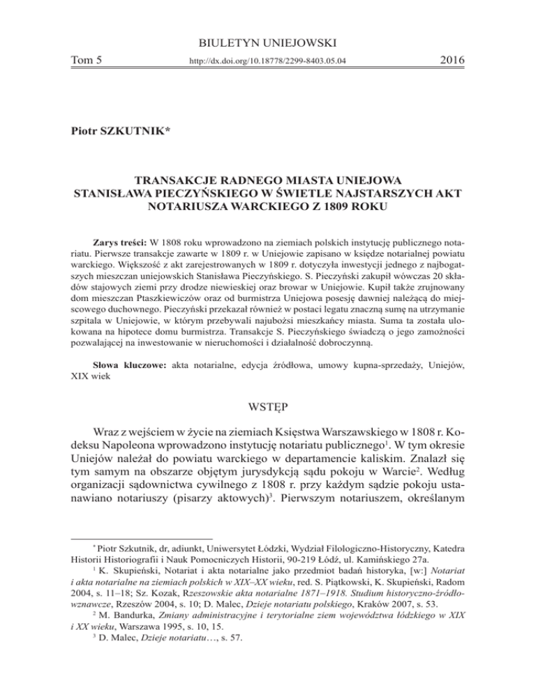 BIULETYN UNIEJOWSKI Tom 5 http://dx.doi.org/10.18778/2299-8403.05.04 2016 Piotr SZKUTNIK* TRANSAKCJE RADNEGO MIASTA UNIEJOWA STANISŁAWA PIECZYŃSKIEGO W ŚWIETLE NAJSTARSZYCH AKT NOTARIUSZA WARCKIEGO Z 1809 ROKU Zarys treści: W 1808 roku wprowadzono na ziemiach polskich instytucję publicznego notariatu. Pierwsze transakcje zawarte w 1809 r. w Uniejowie zapisano w księdze notarialnej powiatu warckiego. Większość z akt zarejestrowanych w 1809 r. dotyczyła inwestycji jednego z najbogatszych mieszczan uniejowskich Stanisława Pieczyńskiego. S. Pieczyński zakupił wówczas 20 składów stajowych ziemi przy drodze niewieskiej oraz browar w Uniejowie. Kupił także zrujnowany dom mieszczan Ptaszkiewiczów oraz od burmistrza Uniejowa posesję dawniej należącą do miejscowego duchownego. Pieczyński przekazał również w postaci legatu znaczną sumę na utrzymanie szpitala w Uniejowie, w którym przebywali najubożsi mieszkańcy miasta. Suma ta została ulokowana na hipotece domu burmistrza. Transakcje S. Pieczyńskiego świadczą o jego zamożności pozwalającej na inwestowanie w nieruchomości i działalność dobroczynną. Słowa kluczowe: akta notarialne, edycja źródłowa, umowy kupna-sprzedaży, Uniejów, XIX wiek WSTĘP Wraz z wejściem w życie na ziemiach Księstwa Warszawskiego w 1808 r. Kodeksu Napoleona wprowadzono instytucję notariatu publicznego1. W tym okresie Uniejów należał do powiatu warckiego w departamencie kaliskim. Znalazł się tym samym na obszarze objętym jurysdykcją sądu pokoju w Warcie2. Według organizacji sądownictwa cywilnego z 1808 r. przy każdym sądzie pokoju ustanawiano notariuszy (pisarzy aktowych)3. Pierwszym notariuszem, określanym Piotr Szkutnik, dr, adiunkt, Uniwersytet Łódzki, Wydział Filologiczno-Historyczny, Katedra Historii Historiografii i Nauk Pomocniczych Historii, 90-219 Łódź, ul. Kamińskiego 27a. 1 K. Skupieński, Notariat i akta notarialne jako przedmiot badań historyka, [w:] Notariat i akta notarialne na ziemiach polskich w XIX–XX wieku, red. S. Piątkowski, K. Skupieński, Radom 2004, s. 11–18; Sz. Kozak, Rzeszowskie akta notarialne 1871–1918. Studium historyczno-źródłowznawcze, Rzeszów 2004, s. 10; D. Malec, Dzieje notariatu polskiego, Kraków 2007, s. 53. 2 M. Bandurka, Zmiany administracyjne i terytorialne ziem województwa łódzkiego w XIX i XX wieku, Warszawa 1995, s. 10, 15. 3 D. Malec, Dzieje notariatu…, s. 57. * 52 Piotr Szkutnik wówczas jako pisarz aktowy4, w Warcie był Jan Strachowski sprawujący swoje obowiązki w latach 1808–18215. Sporządzał on akta notarialne głównie w siedzibie powiatu. W pierwszym roku działalności spisał również kilka akt w Uniejowie. Zapisy te znajdują się w najstarszej księdze notarialnej powiatu warckiego6. Większość tych akt dotyczyła transakcji przeprowadzonych przez radnego miasta Uniejowa Stanisława Pieczyńskiego7. Obok niego w skład rady miasta8 wchodzili w tym czasie Andrzej Dobrowolski oraz Filip Ciesielski, natomiast burmistrzem Uniejowa był w latach 1806–1819 Teodor Jurkiewicz9. T. Jurkiewicz i A. Dobrowolski pozostawali w bliższych relacjach z Pieczyńskim, ponieważ byli świadkami w jego aktach. S. Pieczyński opierał swoją fortunę m.in. na interesach związanych z alkoholami. W wyniku kolejnych inwestycji zgromadził w swoim posiadaniu miejscowy browar, gorzelnie oraz skład wina i octu10. Spisanie zawartych kontraktów kupna sprzedaży w postaci aktów notarialnych świadczy o zapobiegliwości S. Pieczyńskiego, który starał się zabezpieczyć swe tytuły prawne do nabytych nieruchomości nie tylko przez zapisy w księgach miejskich. Łącznie spisano pięć akt notarialnych, w których stroną był S. Pieczyński, w szóstym wystąpił jako świadek. W niniejszej publikacji edytowano akty notarialne S. Pieczyńskiego jako najwcześniejsze pochodzące z Uniejowa dokumenty tego typu. Dokumenty obrazują kumulację nieruchomości miejskich przez jednego z najzamożniejszych mieszkańców tego miasta. KOMENTARZ Zapewne z inicjatywy samego S. Pieczyńskiego sprowadzono w połowie kwietnia 1809 r. J. Strachowskiego na kilka dni do Uniejowa11. Podczas pobytu w tym mieście notariusz sporządził kolejno pięć akt notarialnych do4 A. Włodarczyk, Notariat: przeszłość i możliwości naukowej eksploracji (na przykładzie spuścizny notariuszy wieluńskich w XIX w.), „Rocznik Wieluński”, t. 9, 2009, s. 220. 5 K. Jaroszek, Notariusze działający na terenie Królestwa Polskiego w latach 1808–1915 (wykaz kancelarii notarialnych przechowywanych w archiwach państwowych), [w:] Notariat i akta notarialne na ziemiach polskich…, s. 186. 6 Archiwum Państwowe w Łodzi oddział w Sieradzu (dalej: APŁoS), Akta notariusza J. Strachowskiego w Warcie, sygn. 1. 7 Jeden z przedstawicieli rodu Pieczyńskich – Urban – był opisywany w poprzednim artykule autora. Zob. P. Szkutnik, Spór mieszczan w Uniejowie o fajkę z tytoniem w 1763 r., „Biuletyn Uniejowski”, t. 4, 2015, s. 63–72. 8 Rady miejskie były mianowane przez prefekta z listy kandydatów przedstawionych na wspólnej naradzie właścicieli nieruchomości w mieście. Naradę tę zwoływał prefekt. Kandydaci byli wybierani spośród mieszkańców gminy potrafiących pisać i czytać. Zob. Dziennik praw, t. 1, Warszawa 1810, s. 205. Obowiązki i uprawnienia rady zob. tamże, s. 205–209. 9 Burmistrza mianował w okresie Księstwa Warszawskiego król. Zob. A. Korobowicz, W. Witkowski, Ustrój i prawo na ziemiach polskich od rozbiorów do odzyskania niepodległości, Lublin 1994, s. 59. 10 B. Pełka, Lata zaborów. Wzrost ludności miasta i zmiany w strukturze zawodowej, [w:] Uniejów. Dzieje miasta, red. J. Szymczak, Łódź–Uniejów 1995, s. 172. 11 Za przyjazd pisarza aktowego ponad milę do spisania aktu należało zapłacić lub podstawić powóz i konie. Zob. Dziennik praw, s. 213–217. Transakcje radnego miasta Uniejowa Stanisława Pieczyńskiego… 53 tycz