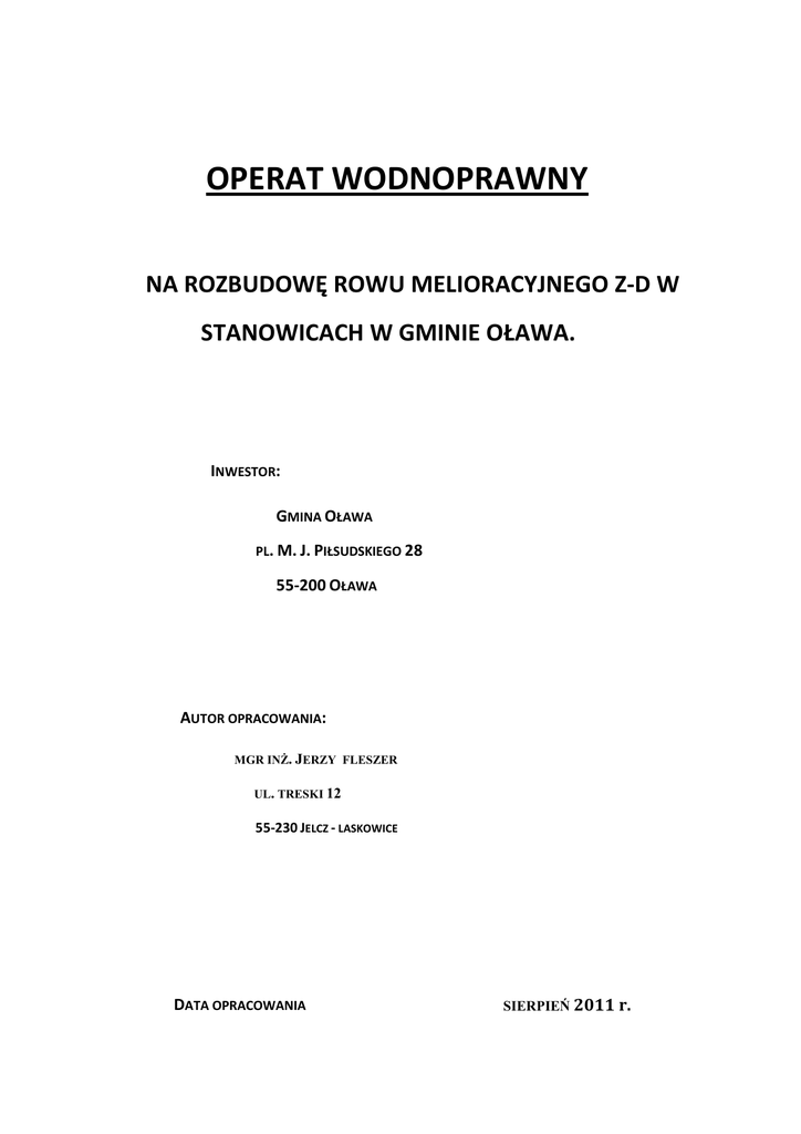 OPERAT WODNOPRAWNY NA ROZBUDOWĘ ROWU MELIORACYJNEGO Z-D W STANOWICACH W GMINIE OŁAWA. INWESTOR: GMINA OŁAWA PL. M. J. PIŁSUDSKIEGO 28 55-200 OŁAWA AUTOR OPRACOWANIA: MGR INŻ. JERZY FLESZER UL. TRESKI 12 55-230 JELCZ - LASKOWICE DATA OPRACOWANIA SIERPIEŃ 2011 r. SPIS TREŚCI 1. WSTĘP ................................................................................................................................................... 3 1.1 CEL I ZAKRES OPRACOWANIA .............................................................................................................. 3 1.2 WYKORZYSTANE MATERIAŁY .............................................................................................................. 4 2. DANE OGÓLNE………………………………………………………………………………………5 2.1 INWESTOR - OSOBA UBIEGAJĄCA SIĘ O POZWOLENIE WODNOPRAWNE................................................ 5 2.2 LOKALIZACJA INWESTYCJI ................................................................................................................... 5 2.3 ISTNIEJĄCE ZAGOSPODAROWANIE TERENU ..........................................................................................5 2.4 CEL I ZAKRES PRZEBUDOWY URZĄDZENIA WODNEGO .........................................................................5 3. STAN PRAWNY NIERUCHOMOŚCI W ZASIĘGU PRZEBUDOWY ROWU Z-D .......................................... 6 4. CHARAKTERYSTYKA URZĄDZENIA WODNEGO ORAZ ANALIZA SYTUACJI HYDROLOGICZNEJ I TOPOGRAFICZNEJ TEREN……………………………………………………………………………7 4.1 CHARAKTERYSTYKA URZĄDZENIA WODNEGO .....................................................................................7 4.2 OBLICZENIA HYDROLOGICZNE ROWU Z-D ...........................................................................................7 4.3 OBLICZENIA HYDRAULICZNE URZĄDZEŃ WODNYCH I OBIEKTÓW INŻYNIERSKICH .......................... ..8 4.4 ANALIZA WYNIKÓW OBLICZEŃ ......................................................................................................... 11 5. WARUNKI ROZBUDOWY ROWU Z-D …………………………………………………………………11 6. OBOWIĄZKI W STOSUNKU DO OSÓB TRZECICH…………………………………………..…………11 8. WARUNKI KORZYSTANIA Z WÓD REGIONU WODNEGO….………………………………………….12 9. WYKAZ STRON ZAINTERESOWANYCH …………………..………………………………………….12 10. WYKAZ ZAŁĄCZNIKÓW………………………………….…………………………………………12 1. WSTĘP Przedmiotem opracowania jest operat wodnoprawny na rozbudowę rowu melioracyjnego Z-D położonego w miejscowości Stanowice w gminie Oława. Zakres przebudowy obejmuje wykonanie nowego odcinka rowu (213,2 mb), który odwadniać będzie teren przylegający do niego i połączy się z istniejącym rowem melioracyjny Z-D. Rozbudowa rowu spowoduje zmianę całkowitej długości urządzenia melioracji wodnych szczegółowych z obecnych 1575 m do 1788,20 m . W ramach budowy nowego odcinka rowu zostanie również wykonanych pięć przepustów drogowych o średnicy Dn 600 i L=6,0 m, jeden przepust drogowy o średnicy Dn 600 i L=8,0 m oraz jeden przepust drogowy Dn 800 i L=12,0 m . Przepusty Dn 600 o długości L= 6,0 m zostaną zlokalizowane na odcinku od km 0,0284 do 0,0344, km 0,067 do 0,073, km 0121 do 0,127, km 0,1438 do 0,1498, km 0,1687 do 0,1747. Przepust Dn 600 o długości L= 8,0 m zlokalizowany będzie na odcinku od km 0,0989 do 0,1069, a przepust Dn 800 w km 0,001 do km 0+0,1069 . Realizacja inwestycji poprawi warunki odpływu wód opadowych w rejonie ulicy Astrów w Stanowicach. Rozbudowa rowu w ulicy Astrów ułatwi przyszłe zagospodarowanie terenów w rejonie przebudowy zgodnie z miejscowym planem zagospodarowania przestrzennego, tj. pod zabudowę mieszkaniową. Rów, czyli sztuczne koryto prowadzące wodę w sposób ciągły lub okresowy o szerokości w dnie nie większej niż 1,5 m, jest urządzeniem wodnym w rozumieniu ustawy z dnia 18 lipca 2001 r. Prawo Wodne (Dz.U. z 2005 r. Nr 239, poz. 2019 z późniejszymi zmianami). Odbudowa, rozbudowa, przebudowa lub rozbiórka tych urządzeń, w tym również zmiana przekroju poprzecznego rowu wskutek budowy przepustu, zgodnie z art. 122 ust. 1 pkt 3 w związku z art. 9 ust. 2 pkt 2 ustawy Prawo wodne, wymaga przed rozpoczęciem robót uzyskania pozwolenia wodnoprawnego na wykonanie urządzeń wodnych. Zgodnie z art. 125 ustawy Prawo Wodne pozwolenie nie może naruszać: • ustaleń warunków korzystania z wód regionu wodnego lub warunków korzystania z wód zlewni, • ustaleń miejscowego planu zagospodarowania przestrzennego, • wymagań ochrony zdrowia ludzi, środowiska oraz dóbr kultury wpisanych do rejestru zabytków, wynikających z odrębnych przepisów. Zgodnie z art. 131 ust. 4 ustawy Prawo wodne pozwolenie wodnoprawne na przebudowę urządzenia wodnego może zostać wydane na podstawie projektu tej przebudowy, jeżeli projekt ten odpowiada wymaganiom operatu wodnoprawnego. 1.1 CEL I ZAKRES OPRACOWANIA Celem niniejszego opracowania jest stworzenie formalnoprawnych oraz technicznych (hydrologicznych i hydraulicznych) podstaw umożliwiających uzyskanie pozwolenia wodnoprawnego na rozbudowę urządzenia wodnego. Niniejsze opracowanie obejmuje wykonanie na działce nr 462 w miejscowości Stanowice w gminie Oława odcinka rowu o długości 213,2 mb wraz z pięcioma przepustami drogowymi o średnicy Dn 600 i L=6,0 m, jednego przepustu drogowego o średnicy Dn 600 i L=8,0 m oraz jednego przepustu drogowego Dn 800 i L=12,0 m. Projektowana rozbudowa rowu Z-D spowoduje zwiększenie całkowitej długości rowu o 213,2 mb. W ramach budowy przepustów przewiduje się również wykonanie przyczółków betonowych oraz umocnień dna i skarp brzegowych rowu na całej jej długości. Zakres