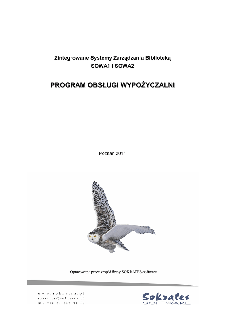 Zintegrowane Systemy Zarządzania Biblioteką SOWA1 i SOWA2 PROGRAM OBSŁUGI WYPOŻYCZALNI Poznań 2011 Spis treści 1. Wstęp......................................................................................................................................3 1.1. Przeznaczenie programu..................................................................................................3 1.2. Przygotowanie do wdrożenia programu..........................................................................4 1.3. Podstawowe okno programu...........................................................................................5 2. Kartoteka czytelników ............................................................................................................6 2.1. Wprowadzanie i modyfikowanie danych czytelnika.......................................................6 2.2. Przygotowanie legitymacji bibliotecznej.........................................................................7 2.3. Usuwanie danych czytelnika...........................................................................................8 2.4. Wyszukiwanie danych czytelnika....................................................................................8 2.5. Konta czytelnika..............................................................................................................9 2.6. Naruszenie regulaminu wypożyczalni...........................................................................10 3. Katalog zbiorów....................................................................................................................11 3.1. Reprezentacja zasobów biblioteki.................................................................................11 3.2. Fazy dostępności egzemplarza......................................................................................11 3.2. Wyszukiwanie danych egzemplarza..............................................................................11 4. Obsługa podstawowych zadań wypożyczalni.......................................................................13 4.1. Udostępnienie egzemplarza...........................................................................................13 4.2. Zarejestrowanie wypożyczenia egzemplarza.................................................................13 4.3. Zarejestrowanie zwrotu egzemplarza............................................................................13 4.4. Zwrot pozycji zamawianej............................................................................................14 4.5. Przedłużenie okresu wypożyczenia...............................................................................14 4.6. Zgłoszenie zagubienia lub zniszczenia..........................................................................15 4.7. Zarezerwowanie egzemplarza.......................................................................................15 4.8. Zamówienie wydania.....................................................................................................15 4.8. Rejestracja wpłat...........................................................................................................16 5. Realizacja wydruków............................................................................................................17 5.1. Drukowanie stanu konta czytelnika, historii wypożyczeń............................................17 5.2. Zestawienia statystyczne...............................................................................................17 1 1. Wstęp 1.1. Przeznaczenie programu Program Obsługi Wypożyczalni umożliwia pełną automatyzację tego działu biblioteki. Program współpracuje z serwerem aplikacji SOWA, z którym komunikuje się protokołem TCP/IP. Dzięki temu program Obsługi Wypożyczalni może być eksploatowany zdalnie, np. przez odległe filie biblioteczne, pracujące na katalogu centralnym zasobów. Obsługę programu znacznie ułatwia czytnik kodów kreskowych, bowiem wszystkie czynności związane z rejestracją wypożyczeń i zwrotów są realizowane przez odczytywanie kodów kreskowych znajdujących się na legitymacjach czytelników i egzemplarzach wypożyczanych pozycji. Z klawiatury komputera korzysta się jedynie w celu potwierdzenia niektórych operacji oraz przy wpisywaniu danych czytelników. Z programu można także korzystać bez czytnika, co jednak spowalnia pracę – wszelkie dane trzeba wpisywać wówczas na klawiaturze. Do podstawowych funkcji programu zaliczyć możemy: – – – – – – – rejestrowanie wypożyczeń i zwrotów, przedłużanie okresu wypożyczenia, zgłaszanie zagubienia lub zniszczenia egzemplarza, rezerwowanie i zamawianie pozycji dla wskazanego czytelnika, informowanie o stanie konta czytelnika, przygotowanie upomnień (monitów), naliczanie opłat za monity i przetrzymywane pozycje, Program Obsługi Wypożyczalni umożliwia tworzenie i utrzymywanie kartoteki danych osobowych czytelników biblioteki. W ramach niej możliwe jest zapisywanie nowych i czytelników, modyfikowanie danych osobowych (np. adresu), przygotowanie legitymacji bibliotecznych z kodami kreskowymi oraz usuwanie danych czytelnika. Program Obsługi Wypożyczalni korzysta z danych inwentarzowych reprezentujacych zasoby biblioteki. Przygotowanie katalogu zbiorów odbywa się poprzez oddzielny program katalogowania. W ramach obsługi wypożyczalni mozna wyszukiwać dane inwentarzowe posługując się wszystkimi indeksami (autorskim, tytułowym, przedmiotowym) udostępnionymi w danym katalogu, ale w praktyce najczęsciej wykorzystuje się odczyt kodu kreskowego z naklejki związanej z wypożyczaną pozycją. Dane o wypożyczeniach i zwrotach przechowywane są narastająco, dzięki czemu możliwe jest uzyskiwanie zestawień statystycznych za dowolny okres czasu. Przygotowano zestawienia czytelników, odwiedzin i wypozyczeń odpowiadające zawartości typowego dziennika wypożyczalni. P