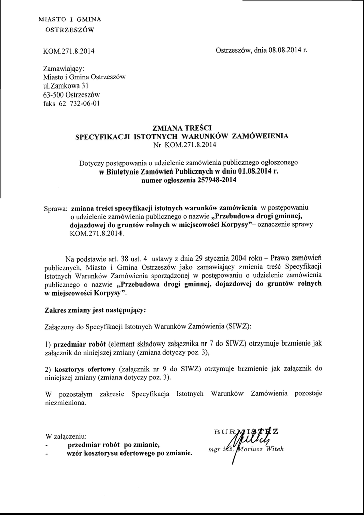 MIASTO I GMINA OSTRZESZ6W r. dnia08.08.2014 Ostrzesz6w, KOM.271.8.2014 Zamawiajqcy: Miasto i Gmina Ostrzesz6w ul.Zamkowa31 Ostrzesz6w 63-500 faks 62 732-06-01 SPECYFIKACJI ZMIANA TRESCI ISTOTNYCH WARUNK6W Nr KOM.271.8.2014 ZAVT6WNTNNTA D otyczy postgpowaniao udzielenie zam6wieniapublic znego ogloszonego w Biuletynie Zamfwieri Publicznych w dniu 01.08,2014t, numer ogloszenia 2579 48'2014 Sprawa: zmiana treSci specyfikacji istotnych warunk6w zam6wienia w postgpowaniu o udzieleniezam6wieniapublicznegoo nazwie,,Przebudowadrogi gminnej, dojazdowej do grunt6w rolnych w miejscowoSciKorpysy"- oznaczeniesprawy KOM.27r.8.2014. Na podstawie art. 38 ust. 4 ustawy z dnia29 stycznia 2004 roku - Prawo zam6wieri publicznych, Miasto i Gmina Ostrzesz6wjako zamawiaj4cy zmienia treS6 Specyfikacji Istotnych Warunk6w Zamowienia sporzqdzonejw postEpowaniu o udzielenie zam6wienia publicznego o nazwie o,Przebudowa drogi gminnej, dojazdowej do grunt6w rolnych w miejscowoSciKorpysy". Zakres zmitny jest nastgpuj4cy: Zatqczonydo SpecyfikacjiIstotnychWarunkow Zamowienia(SIWZ): l) przedmiar rob6t (element skladowy zalqcznikanr 7 do SIWZ) otrzymuje brzmieniejak zalqcznikdo niniejszej zmiany (zmiana dotyczy poz.3), 2) kosztorys ofertowy (zatqcznik nr 9 do SIWZ) otrzymuje brzmienie jak zalqcznik do niniejszej zmiany(zmranadotyczypoz.3). W pozostalym zakresie Specyfikacja Istotnych Warunk6w niezmieniona. W zalqczeniu: przedmiar robrit po zmianieo wz6r kosztorysu ofertowego po zmianie. K3UR, mgr L Zam6wienia pozostaje .8.2014 wz6r- zal.Nr 9 do S.I.WZ.KOM.271 KOSZTORYS OFERTOWY Nazwazam6wienia: Przebudowadrogi gminnej,dojazdowejdo grunt6w rolnych w miejscowo6ciKorpysy Nazwai adreswykonawcy: Nazrvai opisprzedmiaruoraz L.p. Nr Kod pozycji obliczenie iloScijednostek miary dla przedmiaru STWiORB danei nozvcii orzedmiaru l. Robotyw zakresienawierzchnidr6g Robotypomiaroweprry liniowych robotach(drogi),wy maczenie l.t D-01.01.01 pasadrogowego, szerokoSci odtworzenietrasy i punkt6w rnrcnLn(cinwch 2. t.2 drnoi 3. 1.3 4. 1.4 km 0,69 m2 510,00 m2 3 460,00 m2 2 768,00 m2 2768,00 ha 0,015 mb 130,00 Cena WartoS6 jedn. IPI,NI IPLNI w ferenie Wykorytowanie drogi Sr.glgbokoSCdo 23 cm wraz z zaggszczeniemi D-04.01.01 profi lowaniem podlola pod warstwy knnsfnrkcvine Jedn. IIoSdj.m. miary nawierzchni Wykonanie podbudowy z kruszyw a lamanego stabilizowanegomechanicznie D-04.04.04 frakcji 0-63 mm. gruboScil5 cm po i skropienie Mechaniczreoczyszczenie 5. 1.5 6. t.6 D-04.03.0rpodbudowyemulsj4asfaltow4w iloSci 1kplm2 zmasy Ulo2eniewarstwyScieralnej D-05.03.05 mineralno bitumicznejgruboSci5 cm standardII karczowaniezagajnik6w Mechaniczne (od 3l-60 % (krzak6w):Srednich D-01.02.01 powierzchni)wrazz wywiezieniem oalezi do l0 km 1.7 rowu do 20 is0riej4cego Przeglgbienie przekr6j mad otr zy centymetr6w,aby 50 cm, trapezowyo glgbokoSci D-06.04.01 szerokoSci dna30 cm orazwykonaniu skarprowu (stosunekwysoko5cido skarpy| :1, czylipod k4tem szeroko5ci /'l <o\ D-06.03.01 poboczy D-05.01.00Dow6zgruntuna uzupehrienie m3 D - 0 5 . 0 1 . 0 1wraz z wbudowaniem i zaggszczeniem 8. t.8 9. t.9 Regulacjawysoko5cistudni kanalizacvinei 10. l.l0 Resulacia wvsoko5ci zawom wodv szt. 22,40 1,00 1.00 szt. rob6tbezpodatkuVAT (n kosztorysowa WartoSC P o d a t e kV A T . . . . . .. . . % : Razemwarto56kosztorysowarob6t (brutto) Slownie: .. dnia (miejscowoS6) (pieczg6imienna osoby lub os6b uprawnionych do reprezentowaniawykonawcy wymienionych w dokumentach rejestrowych lub we wlaSciwym upowaznieniu) PRZEDMIARROBOT Tabelaprzedmiaru Nazwa i opis pozycji przedmiaru i obliczenie iloSci i ednostekpomiarowych Dzia I Robotv w zakresienawierzchni dr6e L.p. 1 2. 3. Nr S.T. 1.1 1.2 1.3 Roboty pomiarowe przy liniowych robotach (drogi), wyznaczenie szeroko$cipasadrogowego, D - 0 1 . 0 1 . 0odtworzenie 1 trasy i punkt6w wysoko6ciowych drogi w terenie Wykorytowanie drogi Sr.glgbokoS6do23 cmwraz i profilowaniem podloZa pod D -0 4 .0 1 .0 zzageszczeniem 1 warstwv konstrukcvine nawierzchni Wykonanie podbudowy z krusryvva lamanego D-04.04.04stabilizowanegomechanicznie frakcj i 0-63 mm. erubodci 15 cm Do zaggszczeniu podbudowy 4. e oczyszczeniei skropienie r.4 D-04.03.01Mechaniczn emulsiaasfaltowaw iloScilkght' 5. 6. 7. Jedn. Ilo5ij. m. miarv km 510,00 n] m 0,69 2 3 460,00 n] 2768,0 0 1 . 5 D-05.03.05bitumicznei m2 2768,00 t.6 ha 0,015 UloZenie warstwy Scieralnejzmasy mineralno sruboSci5 cm standardII Mechaniczne karczowanie zagajnik6w (krzak6w): (od 31-60 %opowierzchni) wraz z D -0 1 .0 2 .0 Srednich 1 wywiezieniem sahezido 10 kn rowu do 20 istniej4cego PrzeglEbienie centymetr6w,abyotrzymalprzel<r6jtrapezov'ry mb 1 . 7 D-06.04.01o glgbokoSci dna30 cmoraz 50cm,szeroko$ci do wysoko6ci wykonaniu skarprowu(stosunek 130,00 szerokoSciskamv 1:l. czvli pod katem 45o) 8. D-06.03.01 Dow6z gruntu na uzupelnieniepoboczy wrazz wbudowaniem i zagEszczeniem D-05.01.01 1.8 D-05.01.00 9 . r.9 10. 1.10 Reeulacia wysokoScistudnikanalizacyinei ReeulaciawysokoSci zaworu wody m3 22,40 szt. szt. 1 1
