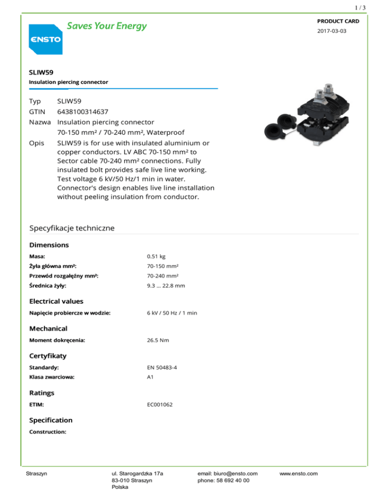 1/3 PRODUCT CARD 2017-03-03 SLIW59 Insulation piercing connector Typ SLIW59 GTIN 6438100314637 Nazwa Insulation piercing connector 70-150 mm² / 70-240 mm², Waterproof Opis SLIW59 is for use with insulated aluminium or copper conductors. LV ABC 70-150 mm² to Sector cable 70-240 mm² connections. Fully insulated bolt provides safe live line working. Test voltage 6 kV/50 Hz/1 min in water. Connector's design enables live line installation without peeling insulation from conductor. Specyfikacje techniczne Dimensions Masa: Żyła główna mm²: Przewód rozgałęźny mm²: Średnica żyły: 0.51 kg 70-150 mm² 70-240 mm² 9.3 … 22.8 mm Electrical values Napięcie probiercze w wodzie: 6 kV / 50 Hz / 1 min Mechanical Moment dokręcenia: 26.5 Nm Certyfikaty Standardy: Klasa zwarciowa: EN 50483-4 A1 Ratings ETIM: EC001062 Specification Construction: Straszyn ul. Starogardzka 17a 83-010 Straszyn Polska email: [email protected] phone: 58 692 40 00 www.ensto.com 2/3 Construction: Component Material Body and Seal Heat and UV resistance two components insert molding of composite polymer and elastomer Body positioner UV resistant polymer Contact plate Tin plated corrosion resistant aluminium alloy Compressing Aluminium alloy plate and frame Tools required: Markings: Bolt Coated stainless steel Hexagonal shear-head Aluminium alloy Washers Coated stainless steel End-cap UV resistant elastomer 13 mm hexagonal socket wrench, fork wrench ST34 Ensto, SLIW59, 70-150, 70-240 ETIM ETIM Surface protection: Tinned Material main conductor: Aluminium/copper Material branch conductor: Aluminium/copper Clamping channel opening main conductor: Both sides open Clamping channel opening branch Both sides open conductor: Type of connection: Insulation piercing connector IPC Opakowanie Opakowanie Unit: Size: PCS 12 Pallet package Unit: Straszyn PCS ul. Starogardzka 17a 83-010 Straszyn Polska email: [email protected] phone: 58 692 40 00 www.ensto.com 3/3 Straszyn ul. Starogardzka 17a 83-010 Straszyn Polska email: [email protected] phone: 58 692 40 00 www.ensto.com