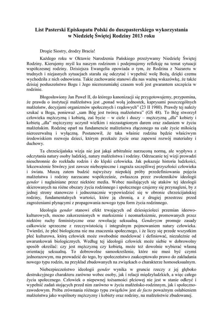List Pasterski Episkopatu Polski do duszpasterskiego wykorzystania w Niedzielę Świętej Rodziny 2013 roku Drogie Siostry, drodzy Bracia! Każdego roku w Oktawie Narodzenia Pańskiego przeżywamy Niedzielę Świętej Rodziny. Kierujemy myśl ku naszym rodzinom i podejmujemy refleksję na temat sytuacji współczesnej rodziny. Dzisiejsza Ewangelia opowiada o tym, że Rodzina z Nazaretu w trudnych i niejasnych sytuacjach starała się odczytać i wypełnić wolę Bożą, dzięki czemu wychodziła z nich odnowiona. Takie zachowanie stanowi dla nas ważną wskazówkę, że także dzisiaj posłuszeństwo Bogu i Jego niezrozumiałej czasem woli jest gwarantem szczęścia w rodzinie. Błogosławiony Jan Paweł II, do którego kanonizacji się przygotowujemy, przypomina, że prawda o instytucji małżeństwa jest „ponad wolą jednostek, kaprysami poszczególnych małżeństw, decyzjami organizmów społecznych i rządowych” (23 II 1980). Prawdy tej należy szukać u Boga, ponieważ „sam Bóg jest twórcą małżeństwa” (GS 48). To Bóg stworzył człowieka mężczyzną i kobietą, zaś bycie – w ciele i duszy – mężczyzną „dla” kobiety i kobietą „dla” mężczyzny uczynił wielkim i niezastąpionym darem oraz zadaniem w życiu małżeńskim. Rodzinę oparł na fundamencie małżeństwa złączonego na całe życie miłością nierozerwalną i wyłączną. Postanowił, że taka właśnie rodzina będzie właściwym środowiskiem rozwoju dzieci, którym przekaże życie oraz zapewni rozwój materialny i duchowy. Ta chrześcijańska wizja nie jest jakąś arbitralnie narzuconą normą, ale wypływa z odczytania natury osoby ludzkiej, natury małżeństwa i rodziny. Odrzucanie tej wizji prowadzi nieuchronnie do rozkładu rodzin i do klęski człowieka. Jak pokazuje historia ludzkości, lekceważenie Stwórcy jest zawsze niebezpieczne i zagraża szczęśliwej przyszłości człowieka i świata. Muszą zatem budzić najwyższy niepokój próby przedefiniowania pojęcia małżeństwa i rodziny narzucane współcześnie, zwłaszcza przez zwolenników ideologii gender i nagłaśniane przez niektóre media. Wobec nasilających się ataków tej ideologii skierowanych na różne obszary życia rodzinnego i społecznego czujemy się przynagleni, by z jednej strony stanowczo i jednoznacznie wypowiedzieć się w obronie chrześcijańskiej rodziny, fundamentalnych wartości, które ją chronią, a z drugiej przestrzec przed zagrożeniami płynącymi z propagowania nowego typu form życia rodzinnego. Ideologia gender stanowi efekt trwających od dziesięcioleci przemian ideowokulturowych, mocno zakorzenionych w marksizmie i neomarksizmie, promowanych przez niektóre ruchy feministyczne oraz rewolucję seksualną. Genderyzm promuje zasady całkowicie sprzeczne z rzeczywistością i integralnym pojmowaniem natury człowieka. Twierdzi, że płeć biologiczna nie ma znaczenia społecznego, i że liczy się przede wszystkim płeć kulturowa, którą człowiek może swobodnie modelować i definiować, niezależnie od uwarunkowań biologicznych. Według tej ideologii człowiek może siebie w dobrowolny sposób określać: czy jest mężczyzną czy kobietą, może też dowolnie wybierać własną orientację seksualną. To dobrowolne samookreślenie, które nie musi być czymś jednorazowym, ma prowadzić do tego, by społeczeństwo zaakceptowało prawo do zakładania nowego typu rodzin, na przykład zbudowanych na związkach o charakterze homoseksualnym. Niebezpieczeństwo ideologii gender wynika w gruncie rzeczy z jej głęboko destrukcyjnego charakteru zarówno wobec osoby, jak i relacji międzyludzkich, a więc całego życia społecznego. Człowiek o niepewnej tożsamości płciowej nie jest w stanie odkryć i wypełnić zadań stojących przed nim zarówno w życiu małżeńsko-rodzinnym, jak i społecznozawodowym. Próba zrównania różnego typu związków jest de facto poważnym osłabieniem małżeństwa jako wspólnoty mężczyzny i kobiety oraz rodziny, na małżeństwie zbudowanej. 2 Spotykamy się z różnymi postawami wobec działań podejmowanych przez zwolenników ideologii gender. Zdecydowana większość nie wie, czym jest ta ideologia, nie wyczuwa więc żadnego niebezpieczeństwa. Wąskie grono osób – zwłaszcza nauczycieli i wychowawców, w tym także katechetów i duszpasterzy – próbuje na własną rękę poszukiwać konstruktywnych sposobów przeciwdziałania jej. Są wreszcie i tacy, którzy widząc absurdalność tej ideologii uważają, że Polacy sami odrzucą proponowane im utopijne wizje. Tymczasem ideologia gender bez wiedzy społeczeństwa i zgody Polaków od wielu miesięcy wprowadzana jest w różne struktury życia społecznego: edukację, służbę zdrowia, działalność placówek kulturalno-oświatowych i organizacji pozarządowych. W przekazach części mediów jest ukazywana pozytywnie: jako przeciwdziałanie przemocy oraz dążenie do równouprawnienia. Wspólnota Kościoła w sposób integralny patrzy na człowieka i jego płeć, dostrzegając w niej wymiar cielesno-biologiczny, psychiczno-kulturowy oraz duchowy. Nie jest czymś niewłaściwym prowadzenie badań nad wpływem kultury na płeć. Groźne jest natomiast ideologiczne twierdzenie, że płeć biologiczna nie ma żadnego istotnego znaczenia dla życia społecznego. Kościół jednoznacznie opowiada się przeciw dyskryminacji ze względu na płeć, ale równocześnie dostrzega niebezpieczeństwo niwelowania wartości płci. To nie fakt istnienia dwóch płci jest źródłem dyskryminacji, ale brak duchowego odniesienia, ludzki egoizm i pycha, które trzeba stale przezwyciężać. Kościół w żaden sposób nie zgadza się na poniżanie osób o skłonnościach homoseksualnych, ale równocześnie z naciskiem podkreśla, że aktywność homoseksualna jest głęboko nieuporządkowana oraz że nie można społecznie zrównywać małżeństwa będącego wspólnotą mężczyzny i kobiety ze związ