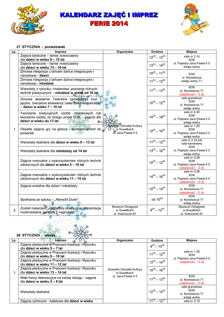 K KA AL LE EN ND DA AR RZ ZZ ZA AJ JĘ ĘĆ Ć II IIM MP PR RE EZ Z F FE ER RIIE E2 20 01 14 4 27 STYCZNIA - poniedziałek Lp. Impreza Organizator Zajęcia taneczne – taniec nowoczesny dla dzieci w wieku 9 – 12 lat Zajęcia taneczne – taniec nowoczesny dla dzieci w wieku 13 – 16 lat Zimowa integracja z tańcem (tańce integracyjne i narodowe) - dzieci Zimowa integracja z tańcem (tańce integracyjne i narodowe) - młodzież 1. Godzina 00 00 00 00 00 00 00 00 00 00 00 00 00 00 00 00 00 00 00 00 00 00 00 00 00 00 12 – 13 13 – 14 10 – 11 11 – 12 Warsztaty z rysunku i malarstwa, poznanie różnych technik plastycznych – młodzież w wieku od 16 lat 11 – 13 Zimowa akademia Teatralna (gimnastyka buzi i języka, ćwiczenia elokwencji ciała, zadania teatralne) – dzieci w wieku 7 – 10 lat 10 – 12 Tworzenie tradycyjnych ozdób choinkowych lub tworzenie rzeźby ze śniegu przed SOK – zajęcia dla dzieci w wieku do 13 lat 14 – 18 Otwarte zajęcia gry na gitarze i akompaniament do piosenek Suwalski Ośrodek Kultury w Suwałkach ul. Jana Pawła II 5 12 – 16 Warsztaty teatralne dla dzieci w wieku 8 – 13 lat 11 – 12 Warsztaty teatralne dla młodzieży od 14 lat 13 – 16 Zajęcia manualne z wykorzystaniem różnych technik zdobniczych dla dzieci w wieku 5 – 10 lat 10 – 12 Zajęcia manualne z wykorzystaniem różnych technik zdobniczych dla dzieci w wieku 11 – 15 lat 14 – 16 Zajęcia wokalne dla dzieci i młodzieży 10 – 14 00 Spotkania ze sztuką – „Albrecht Durer” 2. od 10 Zostań malarzem – warsztaty plastyczne, prezentacja multimedialna, konkurs z nagrodami Muzeum Okręgowe w Suwałkach ul. Kościuszki 81 00 00 9 – 12 Miejsce sala nr 2.14 SOK ul. Papieża Jana Pawła II 5 wstęp wolny SOK ul. Noniewicza wstęp wolny 71 SOK ul. Noniewicza 71 (odpłatność – 5 zł) sala granatowa SOK ul. Noniewicza 71 wstęp wolny sala nr 0.30 SOK ul. Papieża Jana Pawła II 5 wstęp wolny sala nr 1.20 SOK ul. Papieża Jana Pawła II 5 wstęp wolny sala nr 2.24 lub sala kameralna SOK ul. Papieża Jana Pawła II 5 wstęp wolny sala nr 0.28 SOK ul. Papieża Jana Pawła II 5 (odpłatność – 5 zł) sala nr 0.28 SOK ul. Papieża Jana Pawła II 5 (odpłatność – 5 zł) SOK ul. Noniewicza 71 (odpłatność – 2 zł) SOK ul. Noniewicza 71 wstęp wolny Muzeum Okręgowe w Suwałkach ul. Kościuszki 81 28 STYCZNIA - wtorek Lp. 1. Impreza Zajęcia plastyczne w Pracowni Ilustracji i dla dzieci w wieku 5 – 7 lat Zajęcia plastyczne w Pracowni Ilustracji i dla dzieci w wieku 8 – 10 lat Zajęcia plastyczne w Pracowni Ilustracji i dla dzieci w wieku 11 – 12 lat Zajęcia plastyczne w Pracowni Ilustracji i dla dzieci w wieku 13 – 14 lat Organizator Rysunku 30 00 30 00 30 00 30 00 00 30 00 00 30 11 – 12 Rysunku Małe formy dekoracyjne na każdą okazję – zajęcia dla dzieci w wieku 5 – 9 lat Miejsce 30 9 – 10 Rysunku Rysunku Godzina 13 – 14 Suwalski Ośrodek Kultury w Suwałkach ul. Jana Pawła II 5 sala nr 1.26 SOK ul. Papieża Jana Pawła II 5 (odpłatność – 5 zł) 15 – 16 11 – 13 Warsztaty teatralne 12 – 14 Zajęcia rytmiczno - baletowe dla dzieci w wieku 11 – 12 SOK ul. Noniewicza 71 (odpłatność – 5 zł) sala granatowa SOK ul. Noniewicza 71 wstęp wolny sala nr 2.15 6 – 9 lat Zajęcia taneczne – balet dla dzieci w wieku 10 – 13 lat 00 00 00 00 30 00 00 00 00 00 00 30 30 30 Zajęcia wokalne dla dzieci w wieku 6 – 10 lat 11 – 15 Zimowa Akademia Teatralna (gimnastyka buzi i języka, ćwiczenia elokwencji ciała, zadania teatralne) dla dzieci w wieku 7 – 10 lat 10 – 12 Nauka piosenek dla dzieci w wieku 7 – 10 lat 13 – 15 Warsztaty teatralne dla dzieci w wieku 8 – 13 lat 11 – 12 13 – 16 Nauka gry na gitarze dla dzieci w wieku od 12 lat 15 – 16 Zajęcia manualne z wykorzystaniem różnych technik zdobniczych dla dzieci w wieku 5 – 10 lat 11 – 13 00 Spotkanie ze sztuką – „Rafael” od 10 Otwarte warsztaty ceramiczne 16 – 17 Otwarte zajęcia z rysunku, malarstwa dla dzieci w wieku od 13 lat 14 – 19 „Nie trać werwy – zimą ruszaj się bez przerwy!” – zabawy i konkursy „Łamigłówki mądrej główki” – rebusy, krzyżówki, łamigłówki logiczne, zagadki: obrazkowe i słowne „My się zimy nie boimy, do biblioteki chodzimy” – zajęcia integracyjne Moda pradziejowa – pokaz strojów jaćwieskich i wyrobu ozdób, przebieranie dzieci w historyczne ubiory 3. 00 12 – 13 Warsztaty teatralne dla młodzieży w wieku od 14 lat 2. 00 Biblioteka Publiczna im. M. Konopnickiej w Suwałkach ul. E. Plater 33A SOK ul. Papieża Jana Pawła II 5 (odpłatność – 5 zł) sala nr 1.20 SOK ul. Papieża Jana Pawła II 5 wstęp wolny sala granatowa SOK ul. Noniewicza 71 wstęp wolny sala nr 1.22 SOK ul. Papieża Jana Pawła II 5 wstęp wolny sala nr 2.24 lub sala kameralna SOK ul. Papieża Jana Pawła II 5 wstęp wolny sala nr 1.22 SOK ul. Papieża Jana Pawła II 5 wstęp wolny sala nr 0.28 SOK ul. Papieża Jana Pawła II 5 (odpłatność – 5 zł) SOK ul. Noniewicza 71 wstęp wolny SOK ul. Noniewicza 71 (odpłatność – 5 zł) sala nr 0.30 SOK ul. Papieża Jana Pawła II 5 wstęp wolny Oddział dla Dzieci ul. E. Plater 33A 00 30 00 00 00 00 00 00 Filia nr 3 ul. Północna 26 00 00 Filia nr 2 ul. Klonowa 41 11 – 13 11 – 13 11 – 13 Muzeum Okręgowe w Suwałkach ul. Kościuszki 81 9 – 12 Organizator Godzina 00 00 Muzeum Okręgowe w Suwałkach ul. Kościuszki 81 29 STYCZNIA - środa Lp. 1. Impreza Zajęcia plastyczne w Pracowni Ilustracji i Rysunku dla dzieci w wieku 5 – 7 lat 9 – 10 Zajęcia plastyczne w Pracowni Ilustracji i Rysunku dla dzieci w wieku 8 – 10 lat 11 – 12 Zajęcia plastyczne w Pracowni Ilustracji i Rysunku dla dzieci w wieku 11 – 12 lat Zajęcia plastyczne w Pracowni Ilustracji i Rysunku dla dzieci w wieku 13 – 14 lat Zimowa integracja z tańcem (tańce integracyjne i narodowe) dla dzieci Zimowa integracja z tańcem (tańce integracyjne i narodowe) dla młodzieży 30