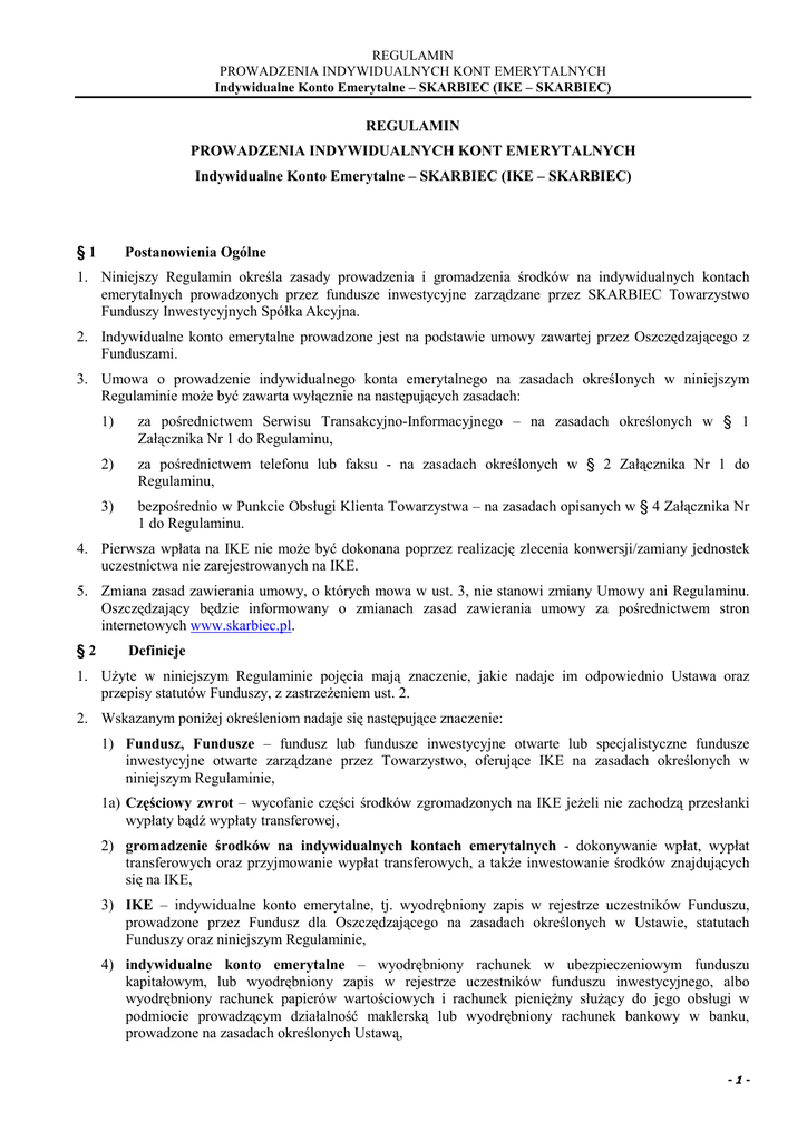 REGULAMIN PROWADZENIA INDYWIDUALNYCH KONT EMERYTALNYCH Indywidualne Konto Emerytalne – SKARBIEC (IKE – SKARBIEC) REGULAMIN PROWADZENIA INDYWIDUALNYCH KONT EMERYTALNYCH Indywidualne Konto Emerytalne – SKARBIEC (IKE – SKARBIEC) §1 Postanowienia Ogólne 1. Niniejszy Regulamin określa zasady prowadzenia i gromadzenia środków na indywidualnych kontach emerytalnych prowadzonych przez fundusze inwestycyjne zarządzane przez SKARBIEC Towarzystwo Funduszy Inwestycyjnych Spółka Akcyjna. 2. Indywidualne konto emerytalne prowadzone jest na podstawie umowy zawartej przez Oszczędzającego z Funduszami. 3. Umowa o prowadzenie indywidualnego konta emerytalnego na zasadach określonych w niniejszym Regulaminie moŜe być zawarta wyłącznie na następujących zasadach: 1) za pośrednictwem Serwisu Transakcyjno-Informacyjnego – na zasadach określonych w § 1 Załącznika Nr 1 do Regulaminu, 2) za pośrednictwem telefonu lub faksu - na zasadach określonych w § 2 Załącznika Nr 1 do Regulaminu, 3) bezpośrednio w Punkcie Obsługi Klienta Towarzystwa – na zasadach opisanych w § 4 Załącznika Nr 1 do Regulaminu. 4. Pierwsza wpłata na IKE nie moŜe być dokonana poprzez realizację zlecenia konwersji/zamiany jednostek uczestnictwa nie zarejestrowanych na IKE. 5. Zmiana zasad zawierania umowy, o których mowa w ust. 3, nie stanowi zmiany Umowy ani Regulaminu. Oszczędzający będzie informowany o zmianach zasad zawierania umowy za pośrednictwem stron internetowych www.skarbiec.pl. §2 Definicje 1. UŜyte w niniejszym Regulaminie pojęcia mają znaczenie, jakie nadaje im odpowiednio Ustawa oraz przepisy statutów Funduszy, z zastrzeŜeniem ust. 2. 2. Wskazanym poniŜej określeniom nadaje się następujące znaczenie: 1) Fundusz, Fundusze – fundusz lub fundusze inwestycyjne otwarte lub specjalistyczne fundusze inwestycyjne otwarte zarządzane przez Towarzystwo, oferujące IKE na zasadach określonych w niniejszym Regulaminie, 1a) Częściowy zwrot – wycofanie części środków zgromadzonych na IKE jeŜeli nie zachodzą przesłanki wypłaty bądź wypłaty transferowej, 2) gromadzenie środków na indywidualnych kontach emerytalnych - dokonywanie wpłat, wypłat transferowych oraz przyjmowanie wypłat transferowych, a takŜe inwestowanie środków znajdujących się na IKE, 3) IKE – indywidualne konto emerytalne, tj. wyodrębniony zapis w rejestrze uczestników Funduszu, prowadzone przez Fundusz dla Oszczędzającego na zasadach określonych w Ustawie, statutach Funduszy oraz niniejszym Regulaminie, 4) indywidualne konto emerytalne – wyodrębniony rachunek w ubezpieczeniowym funduszu kapitałowym, lub wyodrębniony zapis w rejestrze uczestników funduszu inwestycyjnego, albo wyodrębniony rachunek papierów wartościowych i rachunek pienięŜny słuŜący do jego obsługi w podmiocie prowadzącym działalność maklerską lub wyodrębniony rachunek bankowy w banku, prowadzone na zasadach określonych Ustawą, -1- REGULAMIN PROWADZENIA INDYWIDUALNYCH KONT EMERYTALNYCH Indywidualne Konto Emerytalne – SKARBIEC (IKE – SKARBIEC) 5) instytucja finansowa - fundusz inwestycyjny, podmiot prowadzący działalność maklerską, zakład ubezpieczeń, bank, prowadzące indywidualne konta emerytalne zgodnie z Ustawą, 6) konwersja/zamiana – jednoczesne odkupienie jednostek uczestnictwa w jednym Funduszu/Subfunduszu i nabycie jednostek uczestnictwa w innym Funduszu/Subfunduszu za środki pienięŜne uzyskane z odkupienia jednostek uczestnictwa, pod warunkiem Ŝe jednostki odkupywane jak i nabywane są rejestrowane na IKE Oszczędzającego (konwersja stanowi wypłatę transferową w rozumieniu Ustawy), 7) osoby uprawnione - osoby wskazane przez Oszczędzającego, które otrzymają środki z IKE w przypadku jego śmierci, a w przypadku braku wskazania – spadkobiercy Oszczędzającego, 8) Oszczędzający – osoba fizyczna, która gromadzi środki na IKE, 9) Portal – portal internetowy SKARBIEC Asset Management Holding S.A. dostępny pod adresem www.skarbiec.pl, 10) program emerytalny – pracowniczy program emerytalny w rozumieniu ustawy z dnia 20 kwietnia 2004 r. o pracowniczych programach emerytalnych (Dz.U. nr 116 poz. 1207), 11) Punkt Obsługi Klienta Towarzystwa – Punkt Obsługi Klienta prowadzony przez ProService Agent Transferowy Sp. z o.o. w Warszawie przy ul. Puławska 436, 12) Regulamin – niniejszy regulamin prowadzenia indywidualnych kont emerytalnych, 13) STI, Serwis Transakcyjno-Informacyjny - Serwis Transakcyjno-Informacyjny dostępny w ramach portalu internetowego SKARBIEC Asset Management Holding S.A., pod adresem www.skarbiec.pl, 13a) Subfundusz, Subfundusze – kaŜdy z subfunduszy wydzielony w ramach Funduszu z wydzielonymi subfunduszami, którego jednostki uczestnictwa mogą być nabywane w ramach IKE, 14) Towarzystwo - SKARBIEC Towarzystwo Funduszy Inwestycyjnych Spółka Akcyjna, 15) Umowa – umowa o prowadzenie IKE zawierana pomiędzy osobą zamierzającą gromadzić oszczędności na IKE (Oszczędzającym) a Funduszami, 16) Umowa STI - umowa o korzystanie z usług Systemu Transakcyjno-Informacyjnego, na mocy której osoba, która zawarła umowę, otrzymuje dostęp do informacji o stanie inwestycji w Funduszach oraz moŜliwość składania określonych w umowie zleceń i dyspozycji związanych z uczestnictwem w Funduszach za pośrednictwem Portalu, 17) Umowa TeleSkarbiec– umowa o składanie zleceń za pośrednictwem telefonu i telefaksu, na mocy której osoba, która zawarła umowę, otrzymuje dostęp do informacji o stanie inwestycji w Funduszach oraz moŜliwość składania określonych w umowie zleceń i dyspozycji związanych z uczestnictwem w Funduszach za pośrednictwem telefonu i telefaksu, 18) Ustawa – ustawa z dnia 20 kwietnia 2004 r. o indywidualnych kontach emerytalnych (Dz.U. nr 116 poz. 1205, ze zm.), 19) wpłata - wpłata środków pienięŜnych dokonywana przez Oszczędzającego na IKE, 20) wypłata - wypłata jednorazowa albo wypłata w 