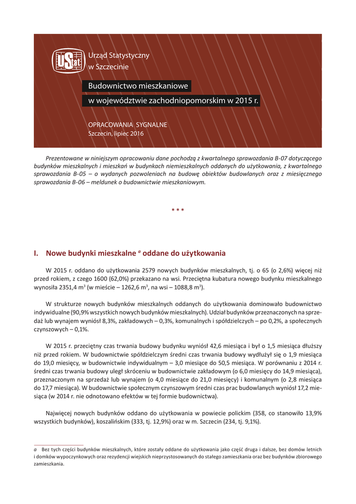 Urząd Statystyczny w Szczecinie Budownictwo mieszkaniowe w województwie zachodniopomorskim w 2015 r. OPRACOWANIA SYGNALNE Szczecin, lipiec 2016 Prezentowane w niniejszym opracowaniu dane pochodzą z kwartalnego sprawozdania B-07 dotyczącego budynków mieszkalnych i mieszkań w budynkach niemieszkalnych oddanych do użytkowania, z kwartalnego sprawozdania B-05 – o wydanych pozwoleniach na budowę obiektów budowlanych oraz z miesięcznego sprawozdania B-06 – meldunek o budownictwie mieszkaniowym. *** I. Nowe budynki mieszkalne a oddane do użytkowania W 2015 r. oddano do użytkowania 2579 nowych budynków mieszkalnych, tj. o 65 (o 2,6%) więcej niż przed rokiem, z czego 1600 (62,0%) przekazano na wsi. Przeciętna kubatura nowego budynku mieszkalnego wynosiła 2351,4 m3 (w mieście – 1262,6 m3, na wsi – 1088,8 m3). W strukturze nowych budynków mieszkalnych oddanych do użytkowania dominowało budownictwo indywidualne (90,9% wszystkich nowych budynków mieszkalnych). Udział budynków przeznaczonych na sprzedaż lub wynajem wyniósł 8,3%, zakładowych – 0,3%, komunalnych i spółdzielczych – po 0,2%, a społecznych czynszowych – 0,1%. W 2015 r. przeciętny czas trwania budowy budynku wyniósł 42,6 miesiąca i był o 1,5 miesiąca dłuższy niż przed rokiem. W budownictwie spółdzielczym średni czas trwania budowy wydłużył się o 1,9 miesiąca do 19,0 miesięcy, w budownictwie indywidualnym – 3,0 miesiące do 50,5 miesiąca. W porównaniu z 2014 r. średni czas trwania budowy uległ skróceniu w budownictwie zakładowym (o 6,0 miesięcy do 14,9 miesiąca), przeznaczonym na sprzedaż lub wynajem (o 4,0 miesiące do 21,0 miesięcy) i komunalnym (o 2,8 miesiąca do 17,7 miesiąca). W budownictwie społecznym czynszowym średni czas prac budowlanych wyniósł 17,2 miesiąca (w 2014 r. nie odnotowano efektów w tej formie budownictwa). Najwięcej nowych budynków oddano do użytkowania w powiecie polickim (358, co stanowiło 13,9% wszystkich budynków), koszalińskim (333, tj. 12,9%) oraz w m. Szczecin (234, tj. 9,1%). a Bez tych części budynków mieszkalnych, które zostały oddane do użytkowania jako część druga i dalsze, bez domów letnich i domków wypoczynkowych oraz rezydencji wiejskich nieprzystosowanych do stałego zamieszkania oraz bez budynków zbiorowego zamieszkania. 2 Budownictwo mieszkaniowe w województwie zachodniopomorskim w 2015 r. Urząd Statystyczny w Szczecinie | opracowanie sygnalne Wykres 1. Nowe budynki mieszkalne oddane do użytkowania 3000 2500 2000 1500 1000 500 0 2010 2011 Ogółem 2013 2012 2014 2015 w tym budownictwo indywidualne II. Mieszkania oddane do użytkowania W 2015 r. oddano do użytkowania 5277 mieszkań, tj. o 139 (o 2,6%) mniej niż w 2014 r. (w kraju odnotowano wzrost o 3,2%). Gorsze efekty mieszkaniowe niż w 2014 r. odnotowano w budownictwie przeznaczonym na sprzedaż lub wynajem, gdzie zrealizowano 1768 (o 240 mniej), komunalnym – 149 (o 138 mniej). Zwiększyła się liczba mieszkań przekazanych do użytkowania w budownictwie zakładowym – do 108 (o 104), społecznym czynszowym – do 60 wobec braku efektów w 2014 r., spółdzielczym – do 118 (o 43) i indywidualnym do 3074 (o 32). Wykres 2. Mieszkania oddane do użytkowania według form budownictwa 2010 43,7 2011 48,6 40,5 4,0 2,9 8,9 3,8 41,4 4,1 2,1 3,5 45,4 1,2 1,3 3,5 35,5 2,4 0,1 48,6 2012 2013 58,5 2014 56,1 37,1 2015 58,3 33,5 0 10 20 Indywidualne Spółdzielcze 30 40 50 60 70 1,4 5,3 0,1 2,2 2,8 3,2 80 90 Przeznaczone na sprzedaż lub wynajem Pozostałe Komunalne 100% Budownictwo mieszkaniowe w województwie zachodniopomorskim w 2015 r. 3 Urząd Statystyczny w Szczecinie | opracowanie sygnalne Wykres 3. Mieszkania oddane do użytkowania według miesięcy 1000 900 800 700 600 500 400 300 200 III VI IX XII 2010 III VI IX XII 2011 III VI IX XII 2012 III VI IX XII 2013 III VI IX XII 2014 III VI IX XII 2015 W strukturze mieszkań oddanych do użytkowania w porównaniu z 2014 r. wzrósł udział mieszkań indywidualnych (o 2,1 p. proc. do 58,3%), zakładowych (o 1,9 p. proc. do 2,0%), spółdzielczych (o 0,8 p. proc. do 2,2%) oraz społecznych czynszowych do 1,1% wobec braku efektów przed rokiem. Zmniejszył się odsetek mieszkań przekazanych do użytkowania w budownictwie przeznaczonym na sprzedaż lub wynajem (o 3,6 p. proc. do 33,5%) i komunalnym (o 2,5 p. proc. do 2,8%). W 2015 r. średnio na 1000 mieszkańców województwa zachodniopomorskiego przypadało 3,1 mieszkania nowo przekazanego do użytkowania (w kraju odpowiednio 3,8) oraz 12,4 izb (w kraju – 15,9). Przeciętnie na 1000 zawartych małżeństw oddano do użytkowania 633 mieszkania (w kraju – 782), tj. o 68 mniej niż w poprzednim roku. Spośród ogółu mieszkań przekazanych do użytkowania 64,3% stanowiły mieszkania w miastach, a 34,9 w miastach na prawach powiatu – Szczecinie, Koszalinie i Świnoujściu (przed rokiem odpowiednio 66,4% i 41,0%). Najwięcej mieszkań oddano do użytkowania w m. Szczecin (1132, z czego 61,9% było przeznaczonych na sprzedaż lub wynajem), w m. Koszalin (602), w powiecie polickim (499), kołobrzeskim (479), koszalińskim (356) i kamieńskim (343), a najmniej – w pyrzyckim (51), łobeskim (56), świdwińskim (73) i wałeckim (86). W porównaniu z 2014 r. więcej mieszkań przekazano w powiatach: kamieńskim (o 221), kołobrzeskim (o 126), myśliborskim (o 72), świdwińskim (o 33), łobeskim (o 24) i wałeckim (o 17). Mniej mieszkań niż przed rokiem przekazano w m. Szczecin (o 272), powiecie koszalińskim (o 147), polickim (o 96), stargardzkim (o 74), goleniowskim (o 70), miastach na prawach powiatu – Koszalinie (o 61) i Świnoujściu (o 43), powiecie białogardzkim (o 30), pyrzyckim (o 18), sławieńskim (o 17), gryfińskim (o 12), drawskim (o 4), szczecineckim i gryfickim (po 1). 4 Budownictwo mieszkaniowe w województwie zachodniopomorskim w 2015 r. Urząd Statystyczny w Szczecinie | opracowanie sygnalne Wykres 4. Struktura mieszkań oddanych 