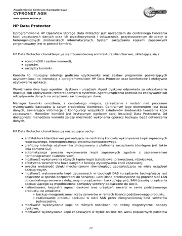 HP Data Protector Oprogramowanie HP OpenView Storage Data Protector jest narzędziem do centralnego tworzenia kopii zapasowych danych oraz ich przechowywania i odtwarzania, przystosowanym do pracy w heterogenicznych środowiskach informatycznych. System zarządzania kopiami zapasowymi zorganizowany jest w postaci komórki. HP Data Protector charakteryzuje się trójwarstwową architekturą klient/serwer, składającą się z: konsoli (GUI i zestaw komend), agentów, zarządcy komórki. Konsola to intuicyjny interfejs graficzny użytkownika oraz zestaw programów pozwalających użytkownikowi na interakcję z oprogramowaniem HP Data Protector oraz komfortowe i efektywne użytkowanie aplikacji. Wyróżniamy dwa typy agentów: dyskowy i urządzeń. Agent dyskowy odpowiada za odczytywanie (backup) lub zapisywanie (restore) danych w systemie. Agent urządzenia pozwala na zapisywanie lub odczytywanie danych na urządzeniu zachowującym dane. Manager komórki umożliwia, z centralnego miejsca, zarządzanie i nadzór nad procesem wykonywania backupów w całym środowisku (komórce). Centralnym jego elementem jest baza danych, zawierająca informacje o konfiguracji wszystkich składników środowiska tworzenia kopii zapasowych. Menedżer komórki jest krytycznym ogniwem całej instalacji Data Protector'a. Od dostępności menedżera komórki zależy możliwość wykonania operacji backupu bądź odtworzenia danych. HP Data Protector charakteryzują następujące cechy: architektura klient/serwer pozwalająca na centralną kontrolę wykonywania kopii zapasowych rozproszonego, heterogenicznego systemu komputerowego, graficzny interfejs użytkownika zintegrowany z platformą zarządzania (dostępna jest także linia komend CLI), automatyzacja procesu wykonywania kopii zapasowych zgodnie z zaplanowanym harmonogramem (kalendarzem), możliwość wykonywania różnych typów kopii (całościowa, przyrostowa, różnicowa), efektywna wewnętrzna baza danych z funkcją wykonywania kopii zapasowej, wysoka wydajność dzięki mechanizmom równoległego zapisu/odczytu na wiele urządzeń backup'owych, możliwość wykonywania kopii zapasowych w topologii DAS (urządzenie backup'ujące jest dołączone w sposób bezpośredni do serwera), LAN (dane przekazywane są poprzez sieć LAN do centralnego serwera z dołączonym urządzeniem backup'ującym), SAN (zasoby urządzenia backup'ującego są współdzielone pomiędzy serwery podłączone do sieci), nielimitowani, bezpłatni agenci dyskowi oraz urządzeń zawarci w cenie podstawowego produktu, co umożliwia: backup nieograniczonej liczby serwerów w ramach licencji podstawowego produktu, realizowanie procesu backupu w sieci SAN przez nieograniczoną ilość serwerów jednocześnie, możliwość wykonywania kopii na różnych nośnikach, np. taśmy magnetyczne, napędy dyskowe, możliwość wykonywania kopii zapasowych w trybie on–line dla wielu popularnych pakietów [1] oprogramowania (np. SAP R/3, Oracle, Sybase, Informix, MS SQL, DB2), backup otwartych plików poprzez mechanizm Open File Manager, możliwość rozbudowy o moduł zintegrowanego backupu macierzy HP (XP, EVA, VA), EMC Symmetrix z wykorzystaniem mechanizmów Business Copy i Split Mirror, obsługa największych i najszybszych bibliotek – bezobsługowy, niezawodny backup, możliwość współdzielenia bibliotek – wysoka szybkość backupu przy jednoczesnym niskim obciążeniu sieci i gwarancji niezawodności (brak pojedynczego punktu awarii), możliwość pracy w klastrze – niezawodny backup dla krytycznych środowisk, efektywne przeszukiwanie nośników z kopiami zapasowymi, mechanizmy kompresji i szyfrowania składowanych danych, możliwość równoczesnego backup'u wielu systemów pracujących w sieci, możliwość backup'u i odzyskiwania danych zainstalowanych na dyskach skonfigurowanych jako znakowe (raw-devices), wsparcie dla technologii NDMP – backup tzw. filerów, wsparcie dla technologii server-less backup – bezpośrednio z inteligentnej macierzy dyskowej na urządzenie backupujące, mechanizm natychmiastowego odtwarzania (ang. Instant Recovery) gwarantujący dostępność danych w ciągu sekund, wsparcie dla różnych metod odtwarzania systemu i danych w przypadku uszkodzenia całej maszyny np. OBDR, Disk Delivery, równoległy zapis tych samych danych na wiele napędów taśmowych (lub innych mediów), funkcja równoległego zapisu strumieni danych z kilku klientów/serwerów na pojedynczy napęd (multipleksowanie), operacje na obiektach, umożliwiające migrację kopii danych pomiędzy różnymi typami nośników, optymalizację wykorzystania przestrzeni nośników poprzez usunięcie nieaktualnych kopii danych, możliwość wygenerowania nośnika z kopiami dla konkretnego systemu (w przypadku wykorzystywania multipleksowanego zapisu na pojedyncze urządzenie, strumieni danych z wielu systemów), możliwość rozbudowy o zaawansowany backup wielostopniowy typu disk-to-disk-to-tape (D2D2T), automatyzacja procesu realizacji klonowania danych, moduł zarządzania i kontroli składowania nośników usuwanych z biblioteki (z funkcją automatycznego transportu do portów wymiany, drukowaniem listy wyjmowanych nośników, monitorowaniem czasu retencji), wielostopniowa definicja i kontrola praw dostępu, np. administrator, użytkownik. Istotnym atutem oprogramowania HP OpenView Storage Data Protector jest wbudowany przejrzysty system raportowania. Administrator, z poziomu graficznego interfejsu, ma w każdej chwili dostęp do informacji o aktualnie wykonywanych backupach, sesjach zakończonych i czekających w kolejce. Natychmiast dostępna jest informacja o stanie dowolnego backupu wykonywanego w przeszłości. Dodatkowo, dane te mogą być automatycznie wysyłane do administratorów poprzez e-mail lub publikowane na stronach WWW. Integracja z platformą HP OpenView zapewnia administratorom centralne monitorowanie wszelkich zdarzeń dotyczących procesu wykonywania backupów. Admini