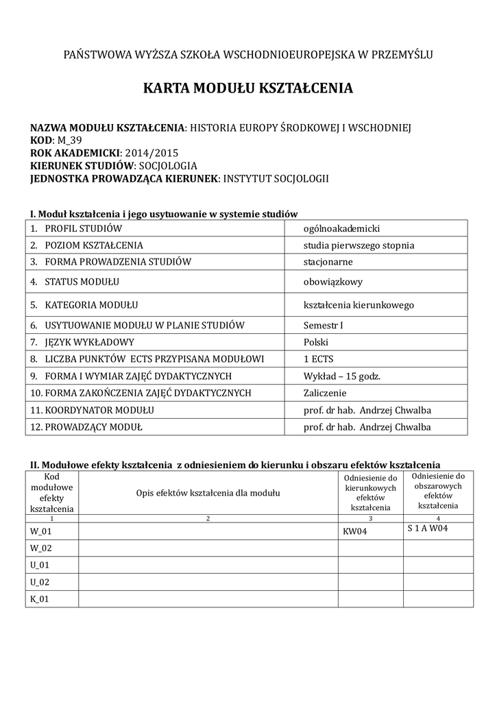 PAŃSTWOWA WYŻSZA SZKOŁA WSCHODNIOEUROPEJSKA W PRZEMYŚLU KARTA MODUŁU KSZTAŁCENIA NAZWA MODUŁU KSZTAŁCENIA: HISTORIA EUROPY ŚRODKOWEJ I WSCHODNIEJ KOD: M_39 ROK AKADEMICKI: 2014/2015 KIERUNEK STUDIÓW: SOCJOLOGIA JEDNOSTKA PROWADZĄCA KIERUNEK: INSTYTUT SOCJOLOGII I. Moduł kształcenia i jego usytuowanie w systemie studiów 1. PROFIL STUDIÓW ogólnoakademicki 2. POZIOM KSZTAŁCENIA studia pierwszego stopnia 3. FORMA PROWADZENIA STUDIÓW stacjonarne 4. STATUS MODUŁU obowiązkowy 5. KATEGORIA MODUŁU kształcenia kierunkowego 6. USYTUOWANIE MODUŁU W PLANIE STUDIÓW Semestr I 7. JĘZYK WYKŁADOWY Polski 8. LICZBA PUNKTÓW ECTS PRZYPISANA MODUŁOWI 1 ECTS 9. FORMA I WYMIAR ZAJĘĆ DYDAKTYCZNYCH Wykład – 15 godz. 10. FORMA ZAKOŃCZENIA ZAJĘĆ DYDAKTYCZNYCH Zaliczenie 11. KOORDYNATOR MODUŁU prof. dr hab. Andrzej Chwalba 12. PROWADZĄCY MODUŁ prof. dr hab. Andrzej Chwalba II. Modułowe efekty kształcenia z odniesieniem do kierunku i obszaru efektów kształcenia Kod modułowe efekty kształcenia Opis efektów kształcenia dla modułu Odniesienie do kierunkowych efektów kształcenia 1 2 3 W_01 W_02 U_01 U_02 K_01 KW04 Odniesienie do obszarowych efektów kształcenia 4 S 1 A W04 III. Treści kształcenia – oddzielnie dla każdej formy zajęć dydaktycznych (W – wykład; C - ćwiczenia; K – konwersatorium; L - laboratorium; PR – projekt, PKZ - praktyka zawodowa; WT – Warsztat) Kod Form Kształc. Szczegółowy opis treści realizowanych w ramach zajęć wg form zajęć dydaktycznych Liczba godzin 1 2 3 W1 W2 W3 W4 W5 W6 W7 W8 Wykład Historia pojęcia Europy środkowo-wschodniej Historyczne i geograficzne uwarunkowania dziejów regionu Kultury etniczne Kultury religijne: rzymski katolicyzm, grecki katolicyzm, prawosławie, islam, judaizm Historia w XIX wieku Okres między I a II wojną światową Między komunizmem, autokratyzmem a demokracją Po roku 1989 Razem IV. Literatura obowiązująca do zaliczenia modułu Literatura podstawowa: 1. Chwalba, Historia powszechna wiek XIX 2. E. Czapiewski, Tyszkiewicz, Historia powszechna wiek XX 3. Chwalba, Historia powszechna 1989-2011 Literatura uzupełniająca: 1. D.S. Landes, Bogactwo i nędza narodów 2. Łotman J., Rosja i znaki 3. H. Batowski, Państwa bałkańskie 1800-1923 4. L. Bazylow, Historia Rosji 5. Demel J, Historia Rumunii 6. W. Felczak, Historia Węgier 7. M. Heller, Dzieje imperium rosyjskiego 8. J. Hrycak, Historia Ukrainy 9. J. Kłoczowski, red. , Historia Europy Środkowo – Wschodniej 10. H. Wereszycki, Historia Austrii 2 2 2 2 2 2 2 1 15