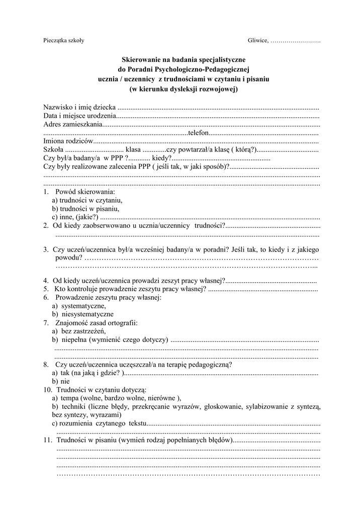 Pieczątka szkoły Gliwice, ……………………. Skierowanie na badania specjalistyczne do Poradni Psychologiczno-Pedagogicznej ucznia / uczennicy z trudnościami w czytaniu i pisaniu (w kierunku dysleksji rozwojowej) Nazwisko i imię dziecka .............................................................................................................. Data i miejsce urodzenia............................................................................................................... Adres zamieszkania....................................................................................................................... ...............................................................................telefon............................................................ Imiona rodziców........................................................................................................................... Szkoła ................................ klasa .............czy powtarzał/a klasę ( którą?).................................. Czy był/a badany/a w PPP ?............ kiedy?...................................................... Czy były realizowane zalecenia PPP ( jeśli tak, w jaki sposób)?................................................. ....................................................................................................................................................... ....................................................................................................................................................... 1. Powód skierowania: a) trudności w czytaniu, b) trudności w pisaniu, c) inne, (jakie?) ........................................................................................................................ 2. Od kiedy zaobserwowano u ucznia/uczennicy trudności?.................................................... ................................................................................................................................................ 3. Czy uczeń/uczennica był/a wcześniej badany/a w poradni? Jeśli tak, to kiedy i z jakiego powodu? …………………………………………………………………………………… ……………………………………………………………………………………………... 4. Od kiedy uczeń/uczennica prowadzi zeszyt pracy własnej?.................................................. 5. Kto kontroluje prowadzenie zeszytu pracy własnej? ............................................................ 6. Prowadzenie zeszytu pracy własnej: a) systematyczne, b) niesystematyczne 7. Znajomość zasad ortografii: a) bez zastrzeŜeń, b) niepełna (wymienić czego dotyczy) ................................................................................. ................................................................................................................................................ ................................................................................................................................................ 8. Czy uczeń/uczennica uczęszczał/a na terapię pedagogiczną? a) tak (na jaką i gdzie? ).......................................................................................................... b) nie 10. Trudności w czytaniu dotyczą: a) tempa (wolne, bardzo wolne, nierówne ), b) techniki (liczne błędy, przekręcanie wyrazów, głoskowanie, sylabizowanie z syntezą, bez syntezy, wyrazami) c) rozumienia czytanego tekstu............................................................................................... ................................................................................................................................................ 11. Trudności w pisaniu (wymień rodzaj popełnianych błędów)................................................ ................................................................................................................................................ ................................................................................................................................................ ................................................................................................................................................ ……………………………………………………………………………………………… 12. Poziom graficzny pisma: a) poprawny b) zaburzony (wymienić cechy pisma).................................................................................... ................................................................................................................................................. ................................................................................................................................................. ................................................................................................................................................. 13. Poziom wypowiedzi pisemnych (treść, styl, forma).............................................................. ................................................................................................................................................ ................................................................................................................................................ ................................................................................................................................................ 14. Poziom wypowiedzi ustnych.................................................................................................. ................................................................................................................................................ .................................................................................................................................