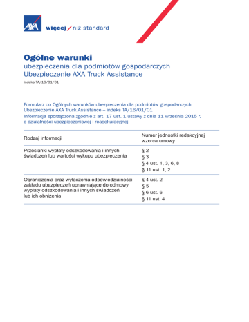 Ogólne warunki ubezpieczenia dla podmiotów gospodarczych Ubezpieczenie AXA Truck Assistance Indeks TA/16/01/01 Formularz do Ogólnych warunków ubezpieczenia dla podmiotów gospodarczych Ubezpieczenie AXA Truck Assistance – indeks TA/16/01/01 Informacja sporządzona zgodnie z art. 17 ust. 1 ustawy z dnia 11 września 2015 r. o działalności ubezpieczeniowej i reasekuracyjnej Rodzaj informacji Numer jednostki redakcyjnej wzorca umowy Przesłanki wypłaty odszkodowania i innych świadczeń lub wartości wykupu ubezpieczenia §2 §3 § 4 ust. 1, 3, 6, 8 § 11 ust. 1, 2 Ograniczenia oraz wyłączenia odpowiedzialności zakładu ubezpieczeń uprawniające do odmowy wypłaty odszkodowania i innych świadczeń lub ich obniżenia § 4 ust. 2 §5 § 6 ust. 6 § 11 ust. 4 Ogólne warunki ubezpieczenia dla podmiotów gospodarczych. Ubezpieczenie AXA Truck Assistance Ogólne warunki ubezpieczenia dla podmiotów gospodarczych Ubezpieczenie AXA Truck Assistance Indeks TA/16/01/01 § 1. Postanowienia ogólne Niniejsze „Ogólne warunki ubezpieczenia AXA Truck Assistance”, zwane dalej „warunkami ubezpieczenia”, mają zastosowanie w umowach ubezpieczenia zawieranych przez AXA Towarzystwo Ubezpieczeń i Reasekuracji S.A. („AXA TUiR S.A.”) z podmiotami gospodarczymi, zwanymi dalej „Ubezpieczającymi”. § 2. Tabela świadczeń Zakres świadczeń przysługujących, w zależności od wariantu ubezpieczenia, w związku z zaistnieniem zdarzeń assistance, limity kwotowe i ilościowe dla poszczególnych świadczeń oraz zakres terytorialny określone zostały w poniższych tabelach: a) Tabela limitów i świadczeń w wariancie TRUCK ASSISTANCE Świadczenia Zdarzenie assistance, po którym przysługuje świadczenie Zakres terytorialny Limit na jedno zdarzenie wypadek Europa 400 € wypadek, kradzież Europa 5 000 € Pomoc techniczna Naprawa pojazdu na miejscu zdarzenia Holowanie pojazdu Postój pojazdu na parkingu strzeżonym wypadek Europa 150 € – maks. 3 dni Dostarczenie części zamiennych wypadek Europa z wyłączeniem Polski koszt przesyłki Dozór ładunku na miejscu zdarzenia wypadek Polska 240 € – maks. 24 h Organizacja przeładunku na zastępczy środek transportu wypadek Europa bez limitu Organizacja zastępczego środka transportu wypadek Europa bez limitu wypadek, kradzież Europa bez limitu Pomoc dla Ubezpieczonych Powrót pod adres zamieszkania Zakwaterowanie w oczekiwaniu na naprawę wypadek, kradzież Europa 250 €/dobę – maks. 3 doby Odbiór naprawionego pojazdu wypadek, kradzież Europa bez limitu Dostarczenie brakujących dokumentów na każdy wniosek Ubezpieczonego Europa koszt przesyłki – maks. 2/rok Pomoc tłumacza przez telefon wypadek, kradzież Europa z wyłączeniem Polski bez limitu Wizyta lekarza nieszczęśliwy wypadek Europa z wyłączeniem Polski 200 € Transport medyczny nieszczęśliwy wypadek Europa z wyłączeniem Polski bez limitu Pokrycie kosztów hospitalizacji nieszczęśliwy wypadek Europa z wyłączeniem Polski 1 000 € Transport zwłok nieszczęśliwy wypadek Europa z wyłączeniem Polski bez limitu Europa bez limitu Europa bez limitu Pomoc medyczna Informacje Przekazanie wiadomości Pomoc informacyjna na każdy wniosek Ubezpieczonego na każdy wniosek Ubezpieczonego „Bez limitu” – oznacza, iż świadczenie realizowane jest do wysokości kosztów ponoszonych przez Centrum Alarmowe Assistance. 2 Ogólne warunki ubezpieczenia dla podmiotów gospodarczych. Ubezpieczenie AXA Truck Assistance b) Tabela limitów i świadczeń w wariancie TRUCK ASSISTANCE EXTRA Zdarzenie assistance, po którym przysługuje świadczenie Zakres terytorialny Limit na jedno zdarzenie Naprawa pojazdu na miejscu zdarzenia awaria, wypadek Europa 600 € Holowanie pojazdu awaria, wypadek, kradzież Europa 5 000 € Postój pojazdu na parkingu strzeżonym awaria, wypadek Europa 150 € – maks. 3 dni Dostarczenie części zamiennych awaria, wypadek Europa z wyłączeniem Polski koszt przesyłki Dozór ładunku na miejscu zdarzenia awaria, wypadek Polska 240 € – maks. 24 h Organizacja przeładunku na zastępczy środek transportu awaria, wypadek Europa bez limitu Organizacja zastępczego środka transportu awaria, wypadek Europa bez limitu wypadek, kradzież Europa 500 € Powrót pod adres zamieszkania awaria, wypadek, kradzież Europa bez limitu Zakwaterowanie w oczekiwaniu na naprawę awaria, wypadek, kradzież Europa 250 €/dobę – maks. 3 doby Odbiór naprawionego pojazdu awaria, wypadek, kradzież Europa bez limitu Pomoc tłumacza przez telefon awaria, wypadek, kradzież, nieszczęśliwy wypadek Europa z wyłączeniem Polski bez limitu Pomoc w tłumaczeniu formularzy awaria, wypadek, kradzież, nieszczęśliwy wypadek Europa z wyłączeniem Polski bez limitu Organizacja tłumacza wypadek, kradzież Europa z wyłączeniem Polski bez limitu Dostarczenie brakujących dokumentów na każdy wniosek Ubezpieczonego Europa koszt przesyłki – maks. 2/rok Organizacja udziału prawnika reprezentującego Ubezpieczonego wypadek Europa z wyłączeniem Polski bez limitu Wpłata kaucji wypadek Europa z wyłączeniem Polski 2 000 € Pierwsza informacja medyczna nieszczęśliwy wypadek Europa z wyłączeniem Polski bez limitu Wizyta lekarza nieszczęśliwy wypadek Europa z wyłączeniem Polski 200 € Transport medyczny nieszczęśliwy wypadek Europa z wyłączeniem Polski bez limitu Pokrycie kosztów hospitalizacji nieszczęśliwy wypadek Europa z wyłączeniem Polski 1 000 € Transport zwłok nieszczęśliwy wypadek Europa z wyłączeniem Polski bez limitu na każdy wniosek Ubezpieczonego Europa z wyłączeniem Polski koszt przesyłki nieszczęśliwy wypadek Europa z wyłączeniem Polski bez limitu Przekazanie wiadomości na każdy wniosek Ubezpieczonego Europa bez limitu Pomoc informacyjna na każdy wniosek Ubezpieczonego Europa bez limitu Świadczenia Pomoc techniczna Złomowanie pojazdu Pomoc dla Ubezpieczonych Pomoc prawna Pomoc medyczna Dostarczenie niezb