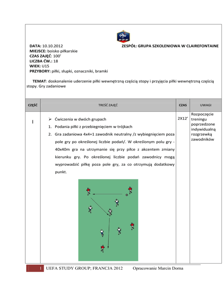 DATA: 10.10.2012 MIEJSCE: boisko piłkarskie CZAS ZAJĘĆ: 100’ LICZBA ĆW.: 18 WIEK: U15 PRZYBORY: piłki, słupki, oznaczniki, bramki ZESPÓŁ: GRUPA SZKOLENIOWA W CLAIREFONTAINE TEMAT: doskonalenie uderzenie piłki wewnętrzną częścią stopy i przyjęcia piłki wewnętrzną częścią stopy. Gry zadaniowe TREŚĆ ZAJĘĆ CZĘŚĆ I CZAS UWAGI Rozpoczęcie 2X12’ treningu poprzedzone 1. Podania piłki z przebiegnięciem w trójkach indywidualną rozgrzewką 2. Gra zadaniowa 4x4+1 zawodnik neutralny /z wybiegnięciem poza zawodników pole gry po określonej liczbie podań/. W określonym polu gry Ćwiczenia w dwóch grupach 40x40m gra na utrzymanie się przy piłce z akcentem zmiany kierunku gry. Po określonej liczbie podań zawodnicy mogą wyprowadzić piłkę poza pole gry, za co otrzymują dodatkowy punkt. 1 UEFA STUDY GROUP; FRANCJA 2012 Opracowanie Marcin Dorna Gry zadaniowe w dwóch 2x25’ grupach 1. Gra 3x3+2 zawodników neutralnych ustawionych na zewnątrz pola gry. Zadaniem zespołu utrzymującego się przy piłce jest zmiana kierunku gry – po podaniu do jednego z neutralnych przeniesienie gry do drugiego neutralnego. Zespół w defensywie zna również „kierunek ataku” zespołu utrzymującego się przy piłce, musi więc prawidłowo ustawić się w defensywie 2. Fragment gry 4x3 /z przewagą zawodników atakujących/. Zespół atakujący ustawiony jak na rysunku – wysunięty napastnik, dwóch skrzydłowych, środkowy pomocnik. Trzech obrońców doskonali grę w strefie wybiegnięcie w odpowiednim momencie i miejsce do zawodnika z piłką, grę 1x1. Po odbiorze piłki zadaniem obrońców jest podanie do partnera ustawionego w strefie środkowej w myśl zasady „pierwsze podanie po odbiorze do przodu”. 2 UEFA STUDY GROUP; FRANCJA 2012 Opracowanie Marcin Dorna 20’ Gra 8x8 na zmniejszonym boisku z akcentem zmiany kierunku gry i doskonaleniem gry w defensywie. 5’ Rozbieganie, ćwiczenia rozciągające 3 UEFA STUDY GROUP; FRANCJA 2012 Opracowanie Marcin Dorna 4 UEFA STUDY GROUP; FRANCJA 2012 Opracowanie Marcin Dorna