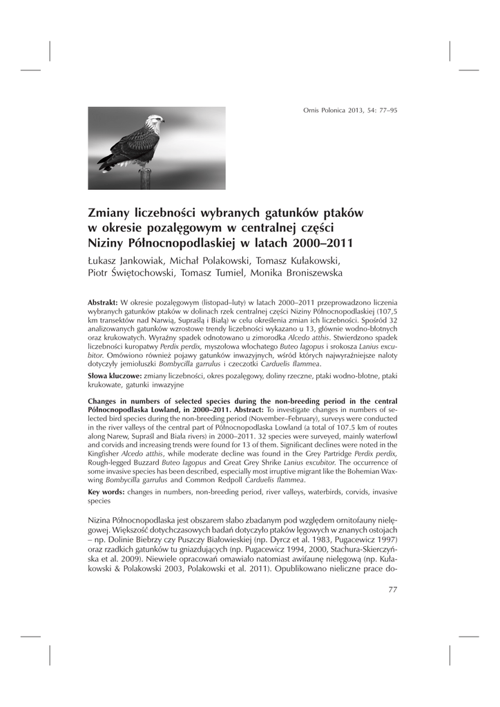 Ornis Polonica 2013, 54: 77–95 Zmiany liczebności wybranych gatunków ptaków w okresie pozalęgowym w centralnej części Niziny Północnopodlaskiej w latach 2000–2011 Łukasz Jankowiak, Michał Polakowski, Tomasz Kułakowski, Piotr Świętochowski, Tomasz Tumiel, Monika Broniszewska Abstrakt: W okresie pozalęgowym (listopad–luty) w latach 2000–2011 przeprowadzono liczenia wybranych gatunków ptaków w dolinach rzek centralnej części Niziny Północnopodlaskiej (107,5 km transektów nad Narwią, Supraślą i Białą) w celu określenia zmian ich liczebności. Spośród 32 analizowanych gatunków wzrostowe trendy liczebności wykazano u 13, głównie wodno-błotnych oraz krukowatych. Wyraźny spadek odnotowano u zimorodka Alcedo atthis. Stwierdzono spadek liczebności kuropatwy Perdix perdix, myszołowa włochatego Buteo lagopus i srokosza Lanius excubitor. Omówiono również pojawy gatunków inwazyjnych, wśród których najwyraźniejsze naloty dotyczyły jemiołuszki Bombycilla garrulus i czeczotki Carduelis flammea. Słowa kluczowe: zmiany liczebności, okres pozalęgowy, doliny rzeczne, ptaki wodno-błotne, ptaki krukowate, gatunki inwazyjne Changes in numbers of selected species during the non-breeding period in the central Północnopodlaska Lowland, in 2000–2011. Abstract: To investigate changes in numbers of selected bird species during the non-breeding period (November–February), surveys were conducted in the river valleys of the central part of Północnopodlaska Lowland (a total of 107.5 km of routes along Narew, Supraśl and Biała rivers) in 2000–2011. 32 species were surveyed, mainly waterfowl and corvids and increasing trends were found for 13 of them. Significant declines were noted in the Kingfisher Alcedo atthis, while moderate decline was found in the Grey Partridge Perdix perdix, Rough-legged Buzzard Buteo lagopus and Great Grey Shrike Lanius excubitor. The occurrence of some invasive species has been described, especially most irruptive migrant like the Bohemian Waxwing Bombycilla garrulus and Common Redpoll Carduelis flammea. Key words: changes in numbers, non-breeding period, river valleys, waterbirds, corvids, invasive species Nizina Północnopodlaska jest obszarem słabo zbadanym pod względem ornitofauny nielęgowej. Większość dotychczasowych badań dotyczyło ptaków lęgowych w znanych ostojach – np. Dolinie Biebrzy czy Puszczy Białowieskiej (np. Dyrcz et al. 1983, Pugacewicz 1997) oraz rzadkich gatunków tu gniazdujących (np. Pugacewicz 1994, 2000, Stachura-Skierczyńska et al. 2009). Niewiele opracowań omawiało natomiast awifaunę nielęgową (np. Kułakowski & Polakowski 2003, Polakowski et al. 2011). Opublikowano nieliczne prace do77 tyczące zmian liczebności ptaków w skali makroregionu i całego kraju (np. Mazgajski et al. 2008, Pugacewicz 2009), a także wieloletnie trendy liczebności gatunków inwazyjnych (Jędrzejewski 2000). Z punktu widzenia ochrony przyrody ważną rolę pełni monitoring populacji ptaków w okresie pozalęgowym, szczególnie tych, których liczebność populacji lęgowych maleje, np. kuropatwy Perdix perdix czy zimorodka Alcedo atthis (Kucharski 2004, Panek 2005). Celem niniejszej pracy jest analiza trendów i zmian liczebności wybranych gatunków ptaków w okresie nielęgowym w dolinach rzek centralnej części Niziny Północnopodlaskiej w latach 2000–2011. Materiał i metody Badania prowadzono w okresie listopad–luty w latach 2000–2011. Kontrole terenowe miały miejsce w połowie każdego miesiąca (w dniach 11.–19.). Podczas przemarszu wzdłuż poszczególnych odcinków liczono ptaki znajdujące się na rzece oraz w zasięgu wzroku obserwatora (maksymalnie do 1000 m w przypadku ptaków drapieżnych) po obu jej stronach. Każdorazowo kontrole obejmowały łącznie 107,5 km rzek centralnej części Niziny Północnopodlaskiej (rys. 1): Narwi (w jej środkowym biegu między Złotorią a Wizną), Supraśli (w jej środkowym i dolnym biegu między Supraślem a Złotorią) oraz Białej (na całej swej długości). Badane doliny rzeczne podzielono na 8 odcinków o długości 8–18 km. Spośród monitorowanych rzek, Narew charakteryzowała się największą szerokością koryta (35–92 m), węższa była Supraśl (10–30 m), a najwęższa – Biała (1–8 m). Rys. 1. Kontrolowane odcinki rzek w dorzeczu Narwi na Nizinie Północnopodlaskiej w latach 2000–2011 Fig. 1. Controlled river sections in the Narew river valley in the Północnopodlaska Lowland in 2000–2011. (1) – section point, (2) – river, (3) – controlled sections, (4) – city/town 78 W trakcie liczeń panowały zróżnicowane warunki pogodowe (dane ze stacji meterologicznej w Białymstoku, za Russia’s Weather 2012). Uwzględniając średnią temperaturę czterech kontrolowanych miesięcy i liczbę dni z ujemną temperaturą, najzimniejsze były sezony 2002/2003, 2005/2006, 2009/2010 i 2010/2011. Umiarkowanie chłodne były 2001/2002, 2003/2004, 2004/2005 i 2008/2009, a najcieplejsze – 2000/2001, 2006/2007 oraz 2007/2008 (rys. 2). Do analiz trendów (zmian liczebności) wybrano te gatunki, które corocznie notowano na badanym terenie w całkowitej liczbie co najmniej 50 osobników we wszystkich latach badań. Zmiany liczebności oszacowano przy użyciu modeli log-liniowych, będących standardowym narzędziem do analiz danych pochodzących z liczeń ptaków (w polskiej literaturze: Chylarecki et al. 2009). Obliczenia wykonano w programie Trim 3.54 (Pannekoek & Strien 2001). Przyjęto standardową klasyfikację trendów (por. Neubauer et al. 2011). Zmiany liczebności zobrazowano na wykresach w stosunku do sezonu wyjściowego 2000/2001. Uzyskane wyniki porównano ze zmianami liczebności polskich oraz europejskich populacji lęgowych analizowanych gatunków (MP 2012, EBCC 2013). Metodyka gromadzenia danych umożliwia przedstawienie jedynie liczebności względnej, którą wyrażono jako średnią miesięczną liczb