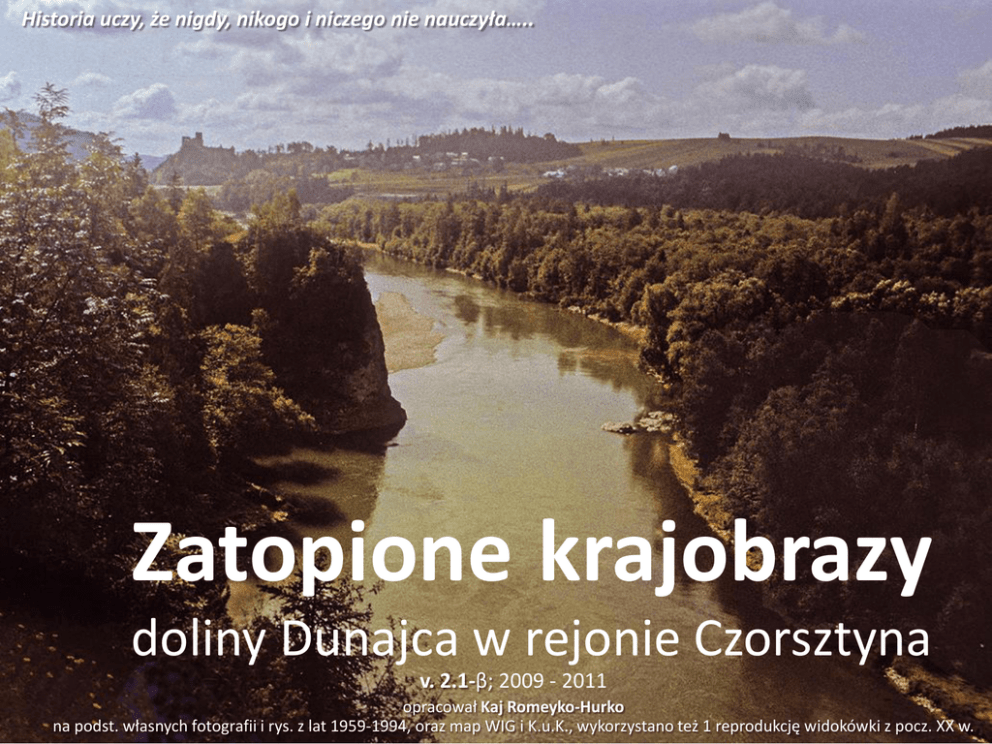 Historia uczy, że nigdy, nikogo i niczego nie nauczyła….. Zatopione krajobrazy doliny Dunajca w rejonie Czorsztyna v. 2.1-β; 2009 - 2011 opracował Kaj Romeyko-Hurko na podst. własnych fotografii i rys. z lat 1959-1994, oraz map WIG i K.u.K., wykorzystano też 1 reprodukcję widokówki z pocz. XX w. Tworzenie niniejszej prezentacji rozpocząłem na pocz. 2009 r., gdy zdałem sobie sprawę, że pamięd tamtych miejsc i zdarzeo zaczyna się zacierad… Potem pojawił się pomysł pokazania tych materiałów na kolejnej konferencji w Pienioskim Parku Narodowym, która w 2010 r. miała byd poświęcona wpływowi zbiornikowej inwestycji na szeroko rozumiane środowisko – przyrodę, zabytki i krajobraz. Niestety, z różnych względów osobistych nie udało się tego opracowania skooczyd, toteż nie pojechało ono na pienioską konferencję. W koocu października 2010 r. Komisja Krajoznawcza PTTK poprosiła mnie o przedstawienie problemu strat krajobrazowych związanych z powstaniem zbiorników pod Czorsztynem na seminarium krajoznawczym „Mijające Krajobrazy Małopolski” (5.11.2010). Pokazany tam materiał (v. 1.0) miał obecny tytuł i był wyciągiem z materiału do nieskooczonej prezentacji, którą przygotowywałem na konferencję pienioską. Był on obarczony błędami i uproszczeniami, wynikającymi głównie z faktu, że z tą problematyką rozstałem się w I połowie lat 90. i pamięd szczegółów uleciała. Poza tym 20-minutowa prezentacja pozwalała tylko zarysowad problematykę. Pierwotna koncepcja zakładała, iż będzie to opracowanie z dużą liczbą zdjęd oraz sporą porcją tekstu, zbyt duże do pokazów i przeznaczone do samodzielnego oglądania, jak książka. Tak zaplanowany materiał wymagał przypomnienia sobie różnych szczegółów, a zwłaszcza dokładnego zidentyfikowania obiektów na zdjęciach i ich lokalizacji. Dopasowywanie tej układanki okazało się nader trudne, a ponieważ pamięd zawodziła, zrozumiałem, że trzeba wykonad szczegółowe plany problemowych miejscowości i dopasowad do nich pokazywane obiekty, gdyż tylko odtwarzając ich „adresy fizyczne”, przywrócimy im tożsamośd. Bez tego są tylko mniej lub bardziej anonimowymi fotografiami z danej miejscowości. To jest jednak praca na dłużej. Klocki bardzo powoli i opornie układają się na swoich miejscach. I chod większośd zdjęd została już wkomponowana w prezentację, to w przypadku Maniów i Czorsztyna są to często zdjęcia jeszcze bez dokładnych „adresów”. Dlatego niniejsze opracowanie (v. 2.1-β) nosi oznaczenie „beta”; oznacza to, że materiał wymaga jeszcze dopracowania. Kiedy się z tym uporam, trudno powiedzied, dlatego udostępniam tę „betę” z prośbą o wyrozumiałośd. Bo same miejsca i obiekty budzą zachwyt i warto je poznad lub przypomnied sobie. Kraków, marzec 2011 r. Kaj Romeyko-Hurko Tę opowieśd czuję się w obowiązku dedykowad „zielonym” młodszego pokolenia, niż moje uczestnikom blokad z lat 1992-4, których „medialne” protesty, kooczące się nierzadko aresztami, mandatami , a nawet kalectwem, pozwoliły najwięcej wywalczyd dla ochrony przyrody i walorów kulturowych tych ziem - dla Polski, dla mieszkaoców tych terenów, dla nas wszystkich… Dramatyczne wydarzenia i dramatyczny paradoks – gdyż mieszkaocy bronili już wtedy tej inwestycji i betonowej nowoczesności… Ale były też inne, przyjazne mi osoby, które odegrały w tej historii ważną rolę: dr Stanisław Michalczuk - wtedy kurator zamku w Niedzicy, śp. dr inż. Jerzy Sawicki - szef Sekcji Parków Narodowych Polskiego Klubu Ekologicznego, inż. Andrzej Szczocarz – wtedy dyrektor Pienioskiego Parku Narodowego, red. Aleksander Rowioski, wtedy naczelny „Przeglądu Tygodniowego”,……… Początek… Najstarsze, zachowane, zdjęcie z mojego „dorobku” to niedzicki zamek z 1959 r. (?) Wtedy, jako 12-latek, byłem tu po raz pierwszy… Wróciłem w te strony z aparatem w koocu lat 60-tych. Zgromadzone tu zdjęcia powstały między schyłkiem lat 50-tych (XX. w., oczywiście :), a 1994 r., kiedy byłem w dolinie między zamkami po raz ostatni, patrząc bezsilnie jak dogorywa najcudowniejszy niegdyś – przynajmniej dla mnie - krajobraz. Jakośd zdjęd jest marna (głównie filmy ORWO), ale te skany są i tak lepsze od oryginałów, które wyświetlałem z rzutnika na prelekcjach w latach 1978-1995. Częśd zdjęd jest czarno-biała; kolor pojawił się później i był kosztowny oraz zawodny. Ostatni raz pokazywałem te obrazki chyba około 1995 r., w czasach slajdów i zwykłego rzutnika „DiaPol”; dziś uzbrojony w nowoczesną technikę wydobywam znacznie więcej z marnych slajdów ORWO. Ale to marna pociecha po krajobrazie, którego już nie ma... „Wieczne odpoczywanie i wieczna pamięd w kasecie magnetofonowej” jak napisał w wierszu „Ostatni liśd” Jalu Kurek, piewca tych ziem, który ten wiersz przyniósł na jedno ze spotkao: „Przeczytajcie tam może…” Ale i on też już odszedł… A ja pamiętam tamte miejsca jak żywe i ... ciężko z tą pamięcią... Konstrukcja tej opowieści nie jest doskonała, ale chciałem pokazad możliwie dużą liczbę fotografii miejsc i obiektów dziś nieistniejących lub drastycznie zmienionych przez zmianę ich otoczenia. Ta opowieść ma dziś sens tylko w celu przypomnienia starszym i pokazania młodym, jak ten krajobraz wyglądał niegdyś i co straciliśmy. Gdyby nie było powstało „czorsztyńskie morze”, krajobraz ten i tak zostałby całkowicie zniszczony. „Drogami skalnej ziemi” (1960), T. Staicha i H. Pieńkowskiej jest ostatnim zapisem świata, w którym wszystko biegło jak przez setki lat, niespiesznie, wg niezmiennych reguł, zwyczajów... Nie ma sensu wracanie do sporu z hydrotechnikami – zaprojektowali i zbudowali ten zbiornik najlepiej, jak potrafili – zgodnie z obowiązującą wiedzą. Szkoda tylko, że ta wiedza nawet do dziś, nie wchłonęła jeszcze tego,