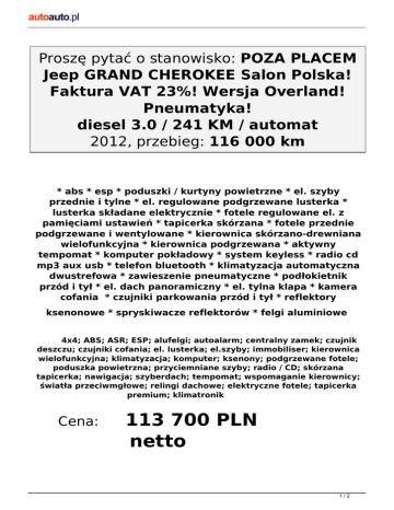Proszę pytać o stanowisko: POZA PLACEM Jeep GRAND CHEROKEE Salon Polska! Faktura VAT 23%! Wersja Overland! Pneumatyka! diesel 3.0 / 241 KM / automat 2012, przebieg: 116 000 km * abs * esp * poduszki / kurtyny powietrzne * el. szyby przednie i tylne * el. regulowane podgrzewane lusterka * lusterka składane elektrycznie * fotele regulowane el. z pamięciami ustawień * tapicerka skórzana * fotele przednie podgrzewane i wentylowane * kierownica skórzano-drewniana wielofunkcyjna * kierownica podgrzewana * aktywny tempomat * komputer pokładowy * system keyless * radio cd mp3 aux usb * telefon bluetooth * klimatyzacja automatyczna dwustrefowa * zawieszenie pneumatyczne * podłokietnik przód i tył * el. dach panoramiczny * el. tylna klapa * kamera cofania * czujniki parkowania przód i tył * reflektory ksenonowe * spryskiwacze reflektorów * felgi aluminiowe 4x4; ABS; ASR; ESP; alufelgi; autoalarm; centralny zamek; czujnik deszczu; czujniki cofania; el. lusterka; el.szyby; immobiliser; kierownica wielofunkcyjna; klimatyzacja; komputer; ksenony; podgrzewane fotele; poduszka powietrzna; przyciemniane szyby; radio / CD; skórzana tapicerka; nawigacja; szyberdach; tempomat; wspomaganie kierownicy; światła przeciwmgłowe; relingi dachowe; elektryczne fotele; tapicerka premium; klimatronik Cena: 113 700 PLN netto 1/2 Opiekun: Szymon Więckowski +48 519 022 900 Al. Krakowska 178, Punkt A 2/2