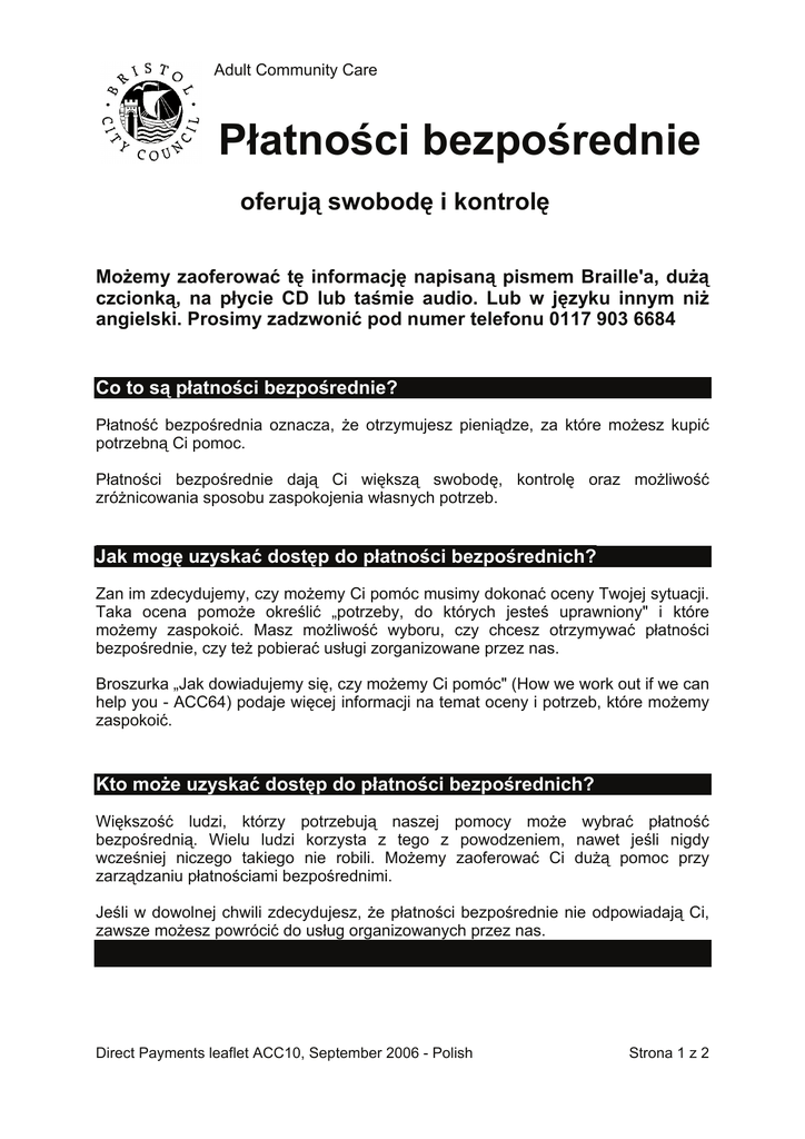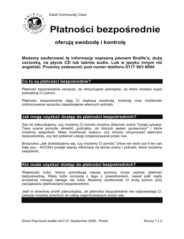 Adult Community Care Płatności bezpośrednie oferują swobodę i kontrolę Możemy zaoferować tę informację napisaną pismem Braille'a, dużą czcionką, na płycie CD lub taśmie audio. Lub w języku innym niż angielski. Prosimy zadzwonić pod numer telefonu 0117 903 6684 Co to są płatności bezpośrednie? Płatność bezpośrednia oznacza, że otrzymujesz pieniądze, za które możesz kupić potrzebną Ci pomoc. Płatności bezpośrednie dają Ci większą swobodę, kontrolę oraz możliwość zróżnicowania sposobu zaspokojenia własnych potrzeb. Jak mogę uzyskać dostęp do płatności bezpośrednich? Zan im zdecydujemy, czy możemy Ci pomóc musimy dokonać oceny Twojej sytuacji. Taka ocena pomoże określić „potrzeby, do których jesteś uprawniony" i które możemy zaspokoić. Masz możliwość wyboru, czy chcesz otrzymywać płatności bezpośrednie, czy też pobierać usługi zorganizowane przez nas. Broszurka „Jak dowiadujemy się, czy możemy Ci pomóc" (How we work out if we can help you - ACC64) podaje więcej informacji na temat oceny i potrzeb, które możemy zaspokoić. Kto może uzyskać dostęp do płatności bezpośrednich? Większość ludzi, którzy potrzebują naszej pomocy może wybrać płatność bezpośrednią. Wielu ludzi korzysta z tego z powodzeniem, nawet jeśli nigdy wcześniej niczego takiego nie robili. Możemy zaoferować Ci dużą pomoc przy zarządzaniu płatnościami bezpośrednimi. Jeśli w dowolnej chwili zdecydujesz, że płatności bezpośrednie nie odpowiadają Ci, zawsze możesz powrócić do usług organizowanych przez nas. Direct Payments leaflet ACC10, September 2006 - Polish Strona 1 z 2 Ile dostanę pieniędzy? Ta kwota będzie zależała od wielkości Twoich potrzeb. Płatności bezpośrednie wystarczą na zaspokojenie potrzeb wyszczególnionych w Twojej ocenie. Jak mogę wykorzystać te pieniądze? Płatności bezpośrednie wystarczą na zaspokojenie potrzeb, do którego masz prawo i wyszczególnionych w Twojej ocenie. Na przykład, możesz użyć tych pieniędzy na zatrudnienie kogoś do pomocy, na zakup sprzętu lub na opłacenie za krótką przerwę w celu zaspokojenia takich potrzeb. Płatności bezpośrednich nie wolno używać na inne opłaty, takie jak opłata za opiekę lekarską, czynsze lub rachunki gospodarstwa domowego. Płatności bezpośrednich nie wolno używać na długoterminową opiekę w domu lub pielęgniarską. Będziesz musiał: • podpisać umowę, w której wyrazisz zgodę na sposób wykorzystania pieniędzy • zachować pokwitowania i rachunki za wykorzystanie pieniędzy • pokazać nam pokwitowania i rachunki, gdy będziemy dokonywać przeglądu Twoich potrzeb. Czy będę ponosić jakieś opłaty? Opłaty będą takie same, jak w przypadku korzystania z usług zorganizowanych przez nas. Broszurka „Opłaty za usługi opiekuńcze dla osób dorosłych" (Charges for Adult Care Services - ACC42) podaje więcej informacji na ten temat. Gdzie mogę dowiedzieć się więecj? Jeśli już korzystasz z naszej pomocy, skontaktuj się z osobą, która dokonała oceny w naszym imieniu. Takie informacje można również uzyskać na stronie internetowej www.bristol-city.gov.uk/directpayments Jeśli nie korzystasz z naszej pomocy, ale sądzisz, że możesz jej potrzebować, skontaktuj się z Bristol Care Direct pod numerem telefonu 0117 903 6684, faksu 0117 903 6688 lub pocztą elektroniczną pod [email protected] Direct Payments leaflet ACC10, September 2006 - Polish Strona 2 z 2