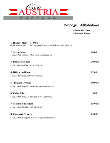 Napoje Alkoholowe Alkohol Getränke Alkocholic drinks 1. Bloody Mary 11,00 zł (Lód,50ml wódka, 125ml sok pomidorowy, sos Tabasco, sól, pieprz ) 2. Screwdriver 10,00 zł ( Lód, 50ml wódka, 100ml sok pomarańczowy ) 3. Bailey's Comet 20,00 zł ( Lód, 50 ml wódka, 50 ml Bailey's ) 4. Dżin z tonikiem 12,00 zł ( Lód, 50 ml dżinu, 100 ml toniku ) 5. Tequila Orange 19,00 zł ( Lód, 50ml tequila, 100ml sok pomarańczowy ) 6. Cuba Libre 9,00 zł ( Lód, 50ml rum, 125ml Coca Cola , cytryna ) 7. Malibu z mlekiem 15,00 zł ( Lód, 50 ml Malibu, 100 ml mleka ) 8. Campari Orange ( Lód, 50 ml Campari, 100 ml sok pomarańczowy ) 15,00 zł