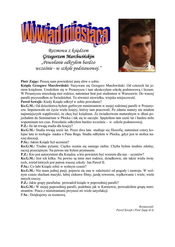 Rozmowa z księdzem Grzegorzem Marchwińskim „Powołanie odkryłem bardzo wcześnie - w szkole podstawowej.” Piotr Zając: Proszę nam powiedzieć parę słów o sobie. Ksiądz Grzegorz Marchwiński: Nazywam się Grzegorz Marchwiński. Od czterech lat jestem księdzem. Urodziłem się w Przasnyszu i tam ukończyłem szkołę podstawową i liceum. W Przasnyszu mieszkają moi rodzice, natomiast brat jest studentem w Warszawie. Do waszej parafii przyszedłem ze Świedziebni. To również niewielka, wiejska miejscowość. Paweł Szwejk: Kiedy Ksiądz odkrył w sobie powołanie? Ks.G.M.: Od dzieciństwa byłem gorliwym ministrantem w mojej rodzimej parafii w Przasnyszu. Imponowało mi życie wielu księży, którzy tam pracowali. Po zdaniu matury nie miałem najmniejszych wątpliwości, że chcę być księdzem. Ze świadectwem maturalnym w dłoni pojechałem do Seminarium w Płocku i tak się to zaczęło. Spędziłem tam sześć lat i bardzo miło wspominam ten czas. Powołanie odkryłem bardzo wcześnie - w szkole podstawowej. P.Z.: Ile lat trwają studia dla księży? Ks.G.M.: Studia trwają sześć lat. Przez dwa lata studiuje się filozofię, natomiast cztery kolejne lata to teologia- nauka o Panu Bogu. Studia odbyłem w Płocku, gdyż jest to stolica naszej diecezji. P.Sz.: Jakim Ksiądz był uczniem? Ks.G.M.: Trudne pytanie. Ciężko ocenia się samego siebie. Chyba byłem średnio zdolny, raczej przeciętnym. Na pewno nie byłem prymusem. P.Z.: Kto jest autorytetem dla Księdza, a kto powinien być wzorem dla nas – uczniów? Ks.G.M.: Jest ich kilku. Na pewno są nimi moi rodzice, dziadkowie, ale także wielu świętych, wśród których jest patron waszej szkoły Jan Paweł II. P.Sz.: Co lubi Ksiądz robić w wolnym czasie? Ks.G.M.: Nie mam jednej pasji; pojawia się ona w zależności od pogody i nastroju. W wolnym czasie słucham muzyki, lubię ciekawe filmy, jazdę rowerem, wędkowanie i wiele, wiele innych rzeczy. P.Z.: Jakie grupy parafialne prowadził ksiądz w poprzedniej parafii? Ks.G.M.: W mojej poprzedniej parafii, podobnie jak w Karniewie, prowadziłem grupę ministrantów. Praca z ministrantami przynosi mi wiele satysfakcji. P.Sz.: Dziękujemy za rozmowę. Rozmawiali: Paweł Szwejk i Piotr Zając kl Ic Dzień Edukacji Narodowej 13 października Samorząd Uczniowski przygotował apel poświęcony Dniu Edukacji Narodowej. Z tej okazji wszystkim nauczycielom życzymy dużo szczęścia i radości z wykonywanej pracy, sukcesów zawodowych i samych wzorowych uczniów. Niech wam sprzyja los w niełatwej pracy! Życzymy również: abyście byli pogodni i pełni radości ducha, abyście nie martwili się wszystkim, co się dzieje w szkole, w domu, w okolicy, na świecie, ale raczej szukali tam optymizmu, radości i nadziei, abyście bywali najczęściej z takimi uczniami, którzy Was lubią, szanują, wspierają w pracy i życiu osobistym, z takimi wymarzonymi uczniami i ludźmi, na których niewątpliwie zasługujecie, abyście mieli w sobie dość siły, wiary i nadziei na każdy szkolny dzień, abyście nie zrażali się naszymi złymi humorami, brakami wiedzy i nie umiejętnościami, słabymi efektami nauczania, bo nie musi to byś Wasza wina abyście swoje obowiązki traktowali jako coś oczywistego, nie będącego ani przymusem, ani presją, a dającego prawa, z których można korzystać w imię sprawiedliwych i uczciwych stosunków między nami, abyście pracując z zapałem, osiągali złożone cele i najlepsze efekty, ale także potrafili świętować w pracy i po pracy, sami i z innymi, oczywiście z nami także, abyście zasługiwali na naszą miłość, chęć współpracy i współodpowiedzialności, nie zabijając naszych uczuć, nie niszcząc nas, nie dyrygując, tylko kochając nas takimi jakimi jesteśmy. Przedstawiciele SU wręczyli nauczycielom drobne niespodzianki. Życzenia dla nauczycieli i wszystkich pracowników szkoły złożyła także przewodnicząca Rady Rodziców pani Mariola Przychodzka. Wystąpiła również pani Małgorzata Żychowska – wicedyrektor szkoły, dołączając się do życzeń. SU Kierunek Siedlce 20 września 2011 r. o godz. 800 uczniowie klas II i III biorący udział w projekcie edukacyjnym „Odkrywać nieznane, tworzyć nowe” wyjechali do Siedlec. Opiekunkami były pani Wanda Zaradkiewicz i pani Irena Zdunek. Na początku wszyscy byli jeszcze trochę śpiący, ale później się rozkręcili. Oczywiście droga minęła nam na rozmowach, żartach, grach i wygłupach, którym nie było końOd lewej: K. Bąk, E. Góralewska, M. Pyra, ca. S. Rojewska i A. Rzewnicka Nareszcie.. po trzech godzinach jazdy stanęliśmy przed Uniwersytetem Humanistyczno - Przyrodniczym w Siedlcach. Po dotarciu do sali, w której miał być wykład, mieliśmy jeszcze trochę wolnego do zajęć. W tym czasie mogliśmy przejść się po budynku, odpocząć po podróży i pożywić się. O 1200 weszliśmy do sali wykładowczej. Zajęcia prowadził bardzo zabawny dr Marek Siłuszyk. Plan półtoragodzinnego wykładu na temat: „Fizyka eksperymentalna” został zrealizowany przy pomocy prezentacji multimedialnej. Obejrzeliśmy doświadczenie i eksperyment, który dzielimy na: rzeczywisty, wspomagany komputerowo oraz wirtualne ćwiczenia. Później wykładowca powiedział nam, czym się różni się fizyka teoretyczna od eksperymentu. Dowiedzieliśmy się, że można ją dzielić na: Dr Marek Siłuszyk doświadczenie (eksperymentalna), i część teoretyczną. Na koniec została niespodzianka, czyli dwa doświadczenia wykonane przez uczniów. W czasie wykładu, poznaliśmy mnóstwo BAAAARDZO długich wzorów, których niestety nie rozumieliśmy. Na koniec pan Marek zachęcił nas do studiowania fizyki i jej dziedzin. Po wykładzie zostaliśmy podzieleni na dwie grupy. Jedna poszła na ćwiczenia dotyczące mechaniki i ciepła, Nasi w auli: (od lewej) M.Pyra, S. Rojewska, A. Rzewnicka i E. Góralewska a druga na elektryczność. W tym czasie wykonywaliś