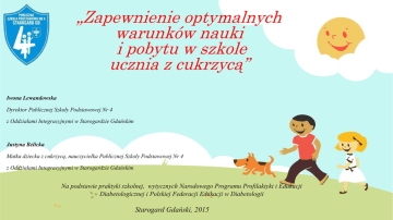 „Zapewnienie optymalnych warunków nauki i pobytu w szkole ucznia z cukrzycą” Iwona Lewandowska Dyrektor Publicznej Szkoły Podstawowej Nr 4 z Oddziałami Integracyjnymi w Starogardzie Gdańskim Justyna Belicka Matka dziecka z cukrzycą, nauczycielka Publicznej Szkoły Podstawowej Nr 4 z Oddziałami Integracyjnymi w Starogardzie Gdańskim Na podstawie praktyki szkolnej, wytycznych Narodowego Programu Profilaktyki i Edukacji Diabetologicznej i Polskiej Federacji Edukacji w Diabetologii Starogard Gdański, 2015 „Strach ma wielkie oczy. Wystarczy wiedzieć co robić, aby się nie bać.” Uczniowie z cukrzycą w naszej szkole: na przestrzeni 12 lat uczęszczali/uczęszczają do klas ogólnodostępnych i integracyjnych, posiadamy doświadczenia w pracy z dziećmi posiadającymi zestaw infuzyjny, wcześniej były to w większości dzieci znajdujące się na początku drogi z chorobą, we wstępnej fazie diagnozy i te zaopatrzone w pen z insuliną. To co ważne dla bezpieczeństwa naszych uczniów i dobrej pracy placówki: wdrażanie pomocy dla wszystkich pracowników szkoły, aby mogli dobrze, skutecznie i bez obaw uczyć dzieci z cukrzycą oraz zapewnić im właściwy pobyt w ich drugim domu. Co robimy? 1. Łączymy działania szkoły, rodziny dziecka i różnych instytucji: przeprowadzamy szczegółowy wywiad z rodzicem na temat aktualnego stanu zdrowia dziecka, przebiegu choroby, postępowania w sytuacjach trudnych, wskazań lekarskich, aktualnej kondycji psychofizycznej, ustalenie bieżącego poziomu radzenia sobie dziecka z chorobą, analizy sprawdzonych metod wychowawczych, motywowania do samodzielności, rozwoju zainteresowań i zdolności ucznia, nauczyciele uczący dziecko, pedagog i psycholog szkolny tworzą, w momencie pojawienia się diagnozy cukrzycy, wspólny plan oddziaływań i wsparcia dla dziecka w oparciu o rozmowę z rodzicami, diagnozę poziomu sprawności wyniesionych z edukacji przedszkolnej oraz dokumentację z poradni specjalistycznych, ustalamy z rodzicami ucznia zakres obopólnej współpracy, wychowawca uczący dziecko w klasie III spotyka się z zespołem nauczycieli podejmujących nauczanie dziecka w klasie IV, w razie potrzeby modyfikujemy wcześniej ustalone oddziaływania. Co robimy? 2. Informujemy cały personel szkolny o dzieciach leczonych na cukrzycę, uwrażliwiamy na konieczność wzmożonej czujności i opieki w odniesieniu do tych dzieci. 3. Odbywają się szkolenia dla grona pedagogicznego – w ramach doskonalenia zawodowego nauczycieli– szczególnie w zakresie wsparcia ucznia o specjalnych potrzebach edukacyjnych, także dla dzieci z chorobą przewlekłą, 4. Szkoła posiada dobrze wykształcone grono pedagogiczne w zakresie pracy z dzieckiem przewlekle chorym. 5. W każdej klasie, do której uczęszcza dziecko z cukrzycą odbywają się zajęcia wprowadzające dzieci w tematykę związaną z tą chorobą. W NASZEJ SZKOLE DZIECI Z CUKRZYCĄ DOBRZE RADZĄ SOBIE Z CHOROBĄ W ASPEKCIE POSTĘPOWANIA BIOMEDYCZNEGO, WIĘKSZĄ TRUDNOŚĆ STANOWIĄ PROBLEMY NATURY PSYCHOLOGICZNEJ- SZCZEGÓLNIE W POCZĄTKOWEJ FAZIE CHOROBY. TO NIE CUKRZYCA POWODUJE PROBLEMY PSYCHOLOGICZNE W SZKOLE, ALE TO, JAK DZIECKO PRZEŻYWA SWOJĄ CHOROBĘ, CO MYŚLĄ JEGO RODZICE, NAUCZYCIELE I KOLEDZY. Zdecydowana większość naszych uczniów z cukrzycą dostarczała i nadal dostarcza nam pozytywnych sygnałów funkcjonowania w chorobie poprzez: traktowanie codziennej aktywności związanej z chorobą jako nawyku i nieodłącznej części życia, nie przeżywają frustracji z powodu ograniczeń, o cukrzycy rozmawiają bez zakłopotania i wstydu, są samodzielne, mają dobrą samoocenę i utrzymują poprawne relacje społeczne. Na przestrzeni ostatnich lat zauważamy także: braki w wiadomościach i umiejętnościach powstałe w wyniku hospitalizacji, zaburzenia koncentracji i uwagi, krótkotrwałe obniżenie możliwości nabywczych, zaniżoną samoocenę, nadpobudliwość psychoruchową, zachowania wskazujące na konieczność zwrócenia na siebie uwagi- gniew, apatia, złość, wykorzystywanie choroby jako karty przetargowej w uzyskiwaniu korzyści własnych. Jesteśmy świadomi, że szkoła do której uczęszcza dziecko z cukrzycą jest miejscem gdzie odbywa się rehabilitacja ku przyszłości. Nauczyciel jest osobą ułatwiającą przystosowanie się dziecka do warunków szkoły i towarzyszy mu na drodze indywidualnego rozwoju. Wsparcie nauczyciela jest bezcenną pomocą w wyrównywaniu szans dziecka. Dlatego też...... SPOSOBY WSPOMAGANIA : Organizowanie szeroko pojętej pomocy psychologiczno-pedagogicznej /zajęcia wyrównawcze, korekcyjno-kompensacyjne, socjoterapeutyczne, integracji sensorycznej, indywidualne spotkania z psychologiem i pedagogiem szkolnym, konsultacje dla rodziców/. Bazowanie na mocnych stronach dzieci poprzez proponowanie szerokiej oferty zajęć pozalekcyjnych, także ruchowych. Umożliwienie konsultacji i spotkań dla dzieci bądź rodziców z pełnomocnikami dyrektora szkoły ds. równego traktowania. Prowadzenie warsztatów integrujących klasę, zajęć psychoedukacyjnych uczących dzieci radzenia sobie z emocjami, z różnorodnością, z okazywaniem szacunku drugiemu człowiekowi, wdrażanie do samodzielności, itp. SPOSOBY WSPOMAGANIA DZIECI PRZEJAWIAJĄCYCH PROBLEMY: Organizowanie lekcji dotyczących cukrzycy z udziałem pielęgniarki szkolnej i wykorzystaniem wiedzy dziecka chorego na cukrzycę. Kierowanie dzieci -we współpracy z rodzicami- do diagnozy i uzyskiwania wskazówek w poradniach specjalistycznych. Wzmocnienie potencjału personelu pracującego w szkole, poszukiwanie i realizacja wspólnie wypracowanych metod pracy z dzieckiem w trakcie posiedzeń zespołów wychowawczych, zespołów przedmiotowych, zespołu ds. integracji oraz organizowanych szkoleń. Prowadzenie, przez wychowawców i pedagogów szkolnych, cyklu zajęć warsztatowych lekcyjnych odnośnie szkolnego kodeksu norm i zachowań uczniów, także zasad traktowania uczni