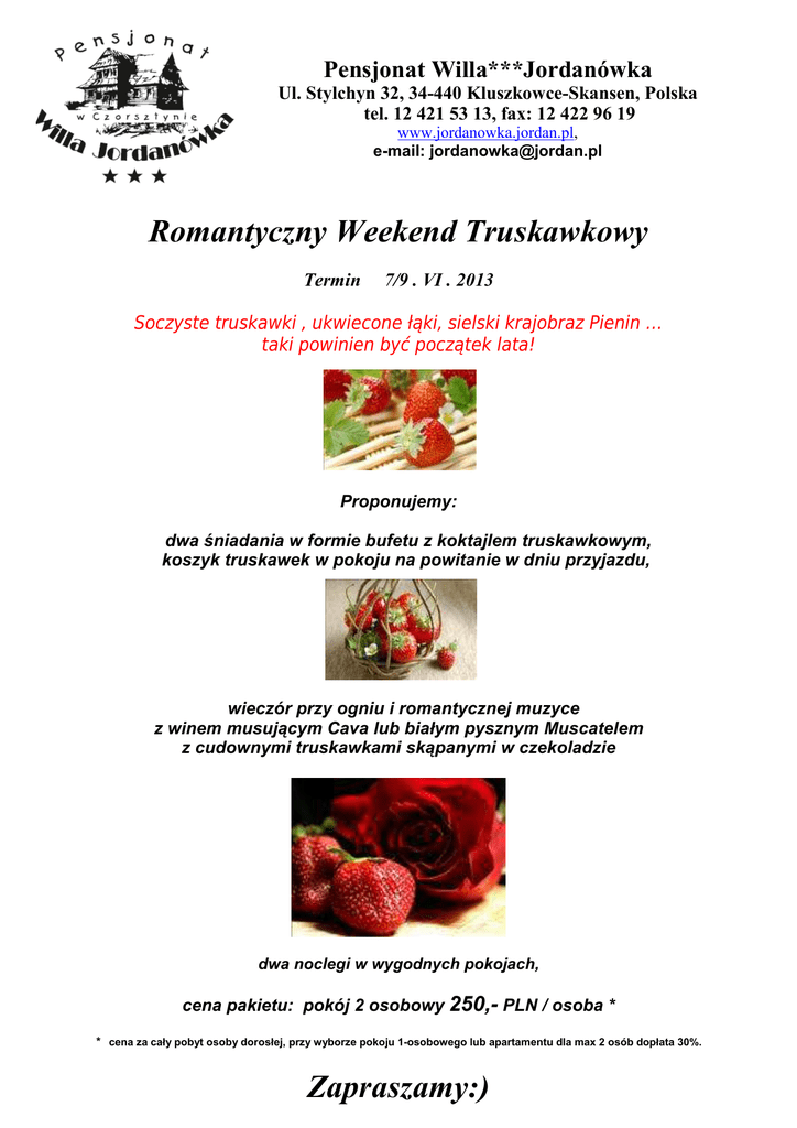 Pensjonat Willa***Jordanówka Ul. Stylchyn 32, 34-440 Kluszkowce-Skansen, Polska tel. 12 421 53 13, fax: 12 422 96 19 www.jordanowka.jordan.pl, e-mail: [email protected] Romantyczny Weekend Truskawkowy Termin 7/9 . VI . 2013 Soczyste truskawki , ukwiecone łąki, sielski krajobraz Pienin … taki powinien być początek lata! Proponujemy: dwa śniadania w formie bufetu z koktajlem truskawkowym, koszyk truskawek w pokoju na powitanie w dniu przyjazdu, wieczór przy ogniu i romantycznej muzyce z winem musującym Cava lub białym pysznym Muscatelem z cudownymi truskawkami skąpanymi w czekoladzie dwa noclegi w wygodnych pokojach, cena pakietu: pokój 2 osobowy 250,- PLN / osoba * * cena za cały pobyt osoby dorosłej, przy wyborze pokoju 1-osobowego lub apartamentu dla max 2 osób dopłata 30%. Zapraszamy:)