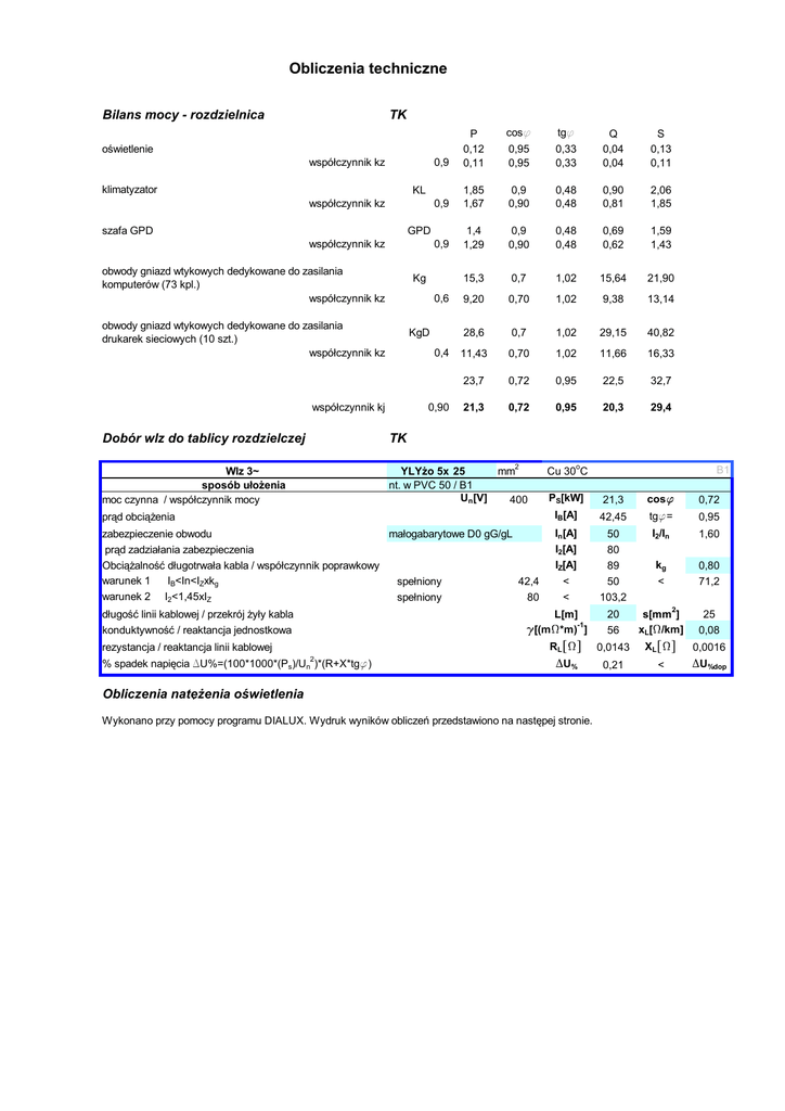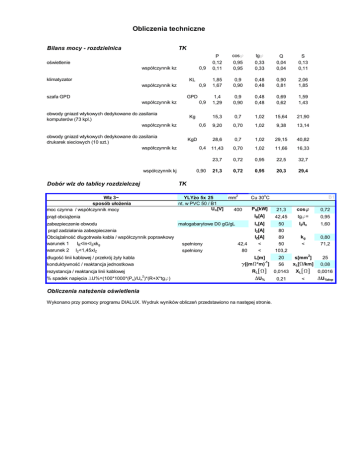 Obliczenia techniczne Bilans mocy - rozdzielnica TK cosf tgf 0,9 P 0,12 0,11 0,95 0,95 0,33 0,33 Q 0,04 0,04 S 0,13 0,11 0,9 1,85 1,67 0,9 0,90 0,48 0,48 0,90 0,81 2,06 1,85 0,9 1,4 1,29 0,9 0,90 0,48 0,48 0,69 0,62 1,59 1,43 15,3 0,7 1,02 15,64 21,90 9,20 0,70 1,02 9,38 13,14 28,6 0,7 1,02 29,15 40,82 11,43 0,70 1,02 11,66 16,33 23,7 0,72 0,95 22,5 32,7 21,3 0,72 0,95 20,3 29,4 oświetlenie współczynnik kz klimatyzator KL współczynnik kz szafa GPD GPD współczynnik kz obwody gniazd wtykowych dedykowane do zasilania komputerów (73 kpl.) współczynnik kz Kg 0,6 obwody gniazd wtykowych dedykowane do zasilania drukarek sieciowych (10 szt.) współczynnik kz KgD 0,4 współczynnik kj 0,90 Dobór wlz do tablicy rozdzielczej TK Wlz 3~ sposób ułoŜenia moc czynna / współczynnik mocy mm2 YLYŜo 5x 25 nt. w PVC 50 / B1 Un[V] 400 Cu 30oC B1 PS[kW] 21,3 cosf f prąd obciąŜenia IB[A] 42,45 tgf= 0,95 małogabarytowe D0 gG/gL zabezpieczenie obwodu prąd zadziałania zabezpieczenia D0 ObciąŜalność długotrwała kabla / współczynnik poprawkowy 19 warunek 1 IB<In<IZxkg spełniony 42,4 warunek 2 I2<1,45xIZ spełniony 80 In[A] I2[A] IZ[A] < < 50 80 89 50 103,2 I2/In 1,60 kg < 0,80 71,2 20 56 s[mm ] xL[W W /km] RL[W] 0,0143 XL[W] 0,0016 D U% 0,21 < DU%dop długość linii kablowej / przekrój Ŝyły kabla konduktywność / reaktancja jednostkowa L[m] g[(mW W *m)-1] rezystancja / reaktancja linii kablowej 2 % spadek napięcia DU%=(100*1000*(Ps)/Un )*(R+X*tgf) Obliczenia natęŜenia oświetlenia Wykonano przy pomocy programu DIALUX. Wydruk wyników obliczeń przedstawiono na następej stronie. 2 0,72 25 0,08