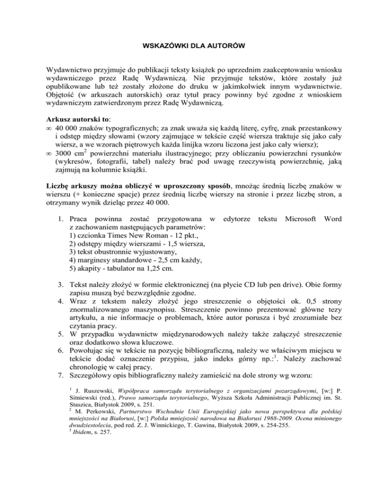 WSKAZÓWKI DLA AUTORÓW Wydawnictwo przyjmuje do publikacji teksty książek po uprzednim zaakceptowaniu wniosku wydawniczego przez Radę Wydawniczą. Nie przyjmuje tekstów, które zostały już opublikowane lub też zostały złożone do druku w jakimkolwiek innym wydawnictwie. Objętość (w arkuszach autorskich) oraz tytuł pracy powinny być zgodne z wnioskiem wydawniczym zatwierdzonym przez Radę Wydawniczą. Arkusz autorski to: • 40 000 znaków typograficznych; za znak uważa się każdą literę, cyfrę, znak przestankowy i odstęp między słowami (wzory zajmujące w tekście część wiersza traktuje się jako cały wiersz, a we wzorach piętrowych każda linijka wzoru liczona jest jako cały wiersz); • 3000 cm2 powierzchni materiału ilustracyjnego; przy obliczaniu powierzchni rysunków (wykresów, fotografii, tabel) należy brać pod uwagę rzeczywistą powierzchnię, jaką zajmują na kolumnie książki. Liczbę arkuszy można obliczyć w uproszczony sposób, mnożąc średnią liczbę znaków w wierszu (+ konieczne spacje) przez średnią liczbę wierszy na stronie i przez liczbę stron, a otrzymany wynik dzieląc przez 40 000. 1. Praca powinna zostać przygotowana w z zachowaniem następujących parametrów: 1) czcionka Times New Roman - 12 pkt., 2) odstępy między wierszami - 1,5 wiersza, 3) tekst obustronnie wyjustowany, 4) marginesy standardowe - 2,5 cm każdy, 5) akapity - tabulator na 1,25 cm. edytorze tekstu Microsoft Word 3. Tekst należy złożyć w formie elektronicznej (na płycie CD lub pen drive). Obie formy zapisu muszą być bezwzględnie zgodne. 4. Wraz z tekstem należy złożyć jego streszczenie o objętości ok. 0,5 strony znormalizowanego maszynopisu. Streszczenie powinno prezentować główne tezy artykułu, a nie informacje o problemach, które autor porusza i być zrozumiałe bez czytania pracy. 5. W przypadku wydawnictw międzynarodowych należy także załączyć streszczenie oraz dodatkowo słowa kluczowe. 6. Powołując się w tekście na pozycję bibliograficzną, należy we właściwym miejscu w tekście dodać oznaczenie przypisu, jako indeks górny np.:1. Należy zachować chronologię w całej pracy. 7. Szczegółowy opis bibliograficzny należy zamieścić na dole strony wg wzoru: 1 J. Ruszewski, Współpraca samorządu terytorialnego z organizacjami pozarządowymi, [w:] P. Sitniewski (red.), Prawo samorządu terytorialnego, Wyższa Szkoła Administracji Publicznej im. St. Staszica, Białystok 2009, s. 251. 2 M. Perkowski, Partnerstwo Wschodnie Unii Europejskiej jako nowa perspektywa dla polskiej mniejszości na Białorusi, [w:] Polska mniejszość narodowa na Białorusi 1988-2009. Ocena minionego dwudziestolecia, pod red. Z. J. Winnickiego, T. Gawina, Białystok 2009, s. 254-255. 3 Ibidem, s. 257. 8. W kolejnych następujących po sobie przypisach nie należy podawać, pełnego adresu bibliograficznego jednej i tej samej książki. Zamiast tego używa się łacińskiego "ibidem” – tamże, podając dodatkowo numer strony - jeśli różni się on od numeru strony podanego w poprzednim przypisie. Oznaczenie "ibidem” jest używane w odniesieniu do poprzedniego przypisu. 9. W szczególnych przypadkach istnieje możliwość zastosowania harwardzkiego systemu cytowań. 10. Bibliografię zamieszcza się na końcu tekstu, po streszczeniu; powinna zawierać wyłącznie publikacje, na które Autor (Autorzy) powołują się w tekście. Pozycje bibliografii należy umieścić w porządku alfabetycznym wg nazwisk autorów. Prace jednego autora należy umieszczać w porządku chronologicznym oznaczając publikowane w tym samym roku dodatkowo symbolami a, b, c itp. po roku ich publikacji. Na końcu każdej pozycji w bibliografii należy także zamieścić numery stron, których dotyczy dany cytat. 11. Autorzy ponoszą odpowiedzialność za poprawność językową tekstu. 12. Tabele oraz rysunki (wykresy, schematy oraz inne elementy graficzne) należy umieścić w tekście artykułu możliwie najbliżej miejsca, gdzie jest o nich wzmianka, wielkość tabel i rysunków nie może przekraczać formatu B5 (12,5 x 18,5 cm). Opisy tabel – czcionka TNR 12 pkt. nad tabelą, tekst w tabeli 10 pkt. pojedynczy odstęp. Pod tabelą lub rysunkiem należy podać informacje identyfikujące dokument, z którego zaczerpnięto dane, a w przypadku tabeli zawierającej wyniki badań autora pracy – sformułowanie: obliczenia własne autora. 13. Opisy osi, wykresów i tekstu na rysunkach należy czcionką TNR 10 pkt. Podpisy oraz numery rysunków czcionką TNR 12 pkt. należy umieścić pod rysunkiem a nie na rysunku. 14. Formuły matematyczne należy zapisywać czytelnie, zwracając uwagę na czytelność symboli, jak i na umieszczenie ich we właściwych miejscach i poziomach.