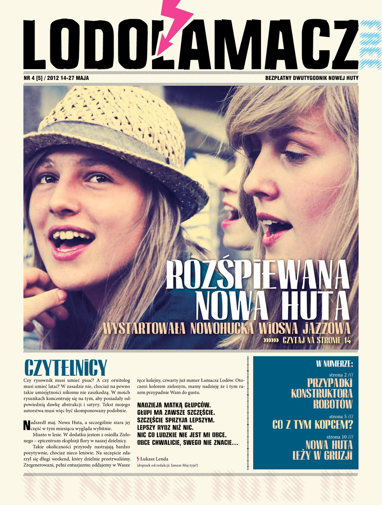 / / / / / / / / / ////////////////////////////////////////////////////////////////////////////////////////////////////////////////////////////////////////////////////////////////////////////////////////////////////// / / / / / / / / / / / / / / / / / / / / / / / / / / / / / / / / / / / / / / / / / / / / / / / / / / / / / / / / / / / / / nr 4 [5] / 2012 14-27 MAJa bezpłatny dwutygodnik nowej huty / / / / / / / / / ////////////////////////////////////////////////////////////////////////////////////////////////////////////////////////////////////////////////////////////////////////////////////////////////////// / / / / / / / / / / / / / / / / / / / / / / / / / / / / / / / / / / / / / / / / / / / / / / / / / / / / / / / / / / / / / rozśpiewana nowa huta wystartowała nowohucka wiosna jazzowa »»» czytaj na stronie 14 / / / / / / / / / ////////////////////////////////////////////////////////////////////////////////////////////////////////////////////////////////////////////////////////////////////////////////////////////////////// / / / / / / / / / / / / / / / / / / / / / / / / / / / / / / / / / / / / / / / / / / / / / / / / / / / / / / / / / / / / / czytelnicy Czy rysownik musi umieć pisać? A czy ornitolog musi umieć latać? W zasadzie nie, chociaż na pewno takie umiejętności nikomu nie zaszkodzą. W moich rysunkach koncentruję się na tym, aby posiadały odpowiednią dawkę abstrakcji i satyry. Tekst mojego autorstwa musi więc być skomponowany podobnie. N adszedł maj. Nowa Huta, a szczególnie stara jej część w tym miesiącu wygląda wybitnie. Miasto w lesie. W dodatku jestem z osiedla Zielonego – epicentrum eksplozji flory w naszej dzielnicy. Takie okoliczności przyrody nastrajają bardzo pozytywnie, chociaż nieco leniwie. Na szczęście zdarzył się długi weekend, który dzielnie przetrwaliśmy. Zregenerowani, pełni entuzjazmu oddajemy w Wasze w numerze: ręce kolejny, czwarty już numer Łamacza Lodów. Otoczeni kolorem zielonym, mamy nadzieję że i tym razem przypadnie Wam do gustu. NADZIEJA MATKĄ GŁUPCÓW. GŁUPI MA ZAWSZE SZCZĘŚCIE. SZCZĘŚCIE SPRZYJA LEPSZYM. LEPSZY RYDZ NIŻ NIC. NIC CO LUDZKIE NIE JEST MI OBCE. OBCE CHWALICIE, SWEGO NIE ZNACIE… Łukasz Lenda strona 2 /// przypadki konstruktora robotów strona 5 /// co z tym kopcem? strona 10 /// nowa huta leży w gruzji tu Nowa Huta !!! (dopisek od redakcji: Janusz Maj żyje!) / / / / / / / / / ////////////////////////////////////////////////////////////////////////////////////////////////////////////////////////////////////////////////////////////////////////////////////////////////////// / / / / / / / / / / / / / / / / / / / / / / / / / / / / / / / / / / / / / / / / / / / / / / / / / / / / / / / / / / / / / 2/// ///3 lodołamacz///nr 4 [5] / 2012 14-27 MAJa / / / / / / / / / /////////////////////////////////////////////////////////////////////////////////////////////////////////////////////////////////////////////////////////////////////////////////////////////////////// / / / / / / / / / / / / / / / / / / / / / / / / / / / / / / / / / / / / / / / / / / / / / / / / / / / / / / / / / / / / błogosławiony grzegorz od robotów / / / / / / / / / ////////////////////////////////////////////////////////////////////////////////////////////////////////////////////////////////////////////////////////////////////////////////////////////////////// / / / / / / / / / / / / / / / / / / / / / / / / / / / / / / / / / / / / / / / / / / / / / / / / / / / / / / / / / / / / / W literaturze science-fiction często pojawia się postać, która w zaciszu swego laboratorium konstruuje genialne, niezrozumiałe dla ogółu wynalazki. „Lodołamacz” dotarł do małego pomieszczenia lodołamacz///bezpłatny dwutygodnik nowej huty / / / / / / / / / / / / / / / / / / / / / / / / / / / / / / / / / / / / / / / / / / / / / / / / / / / / / / / / / / / / / / / / / / / / / / / / / / / / / / / / / / / / / / / / / / / / / / / / / / / / / / / / / / / / / / / / / / / / / / / / / / / / / / // / / / / / / / / / / / / / / / / / / / / / / / / / / / / / / / / / / / / / / / / / / / / / / / / / / / / / / / / / / / / / / / / / / / / / / / / / / / / / / / / / / / / / / / / / / / / / / / / / / / / / / / / / / / / / / / / / / / / / / / / / / / / / / / / / / / / / / / / / / / / Z apytany o inspiracje swoich pomysłów, Grzegorz odpowiada: — Ostatnio jest to technologia wojskowa. Hitem w inspiracjach była koparka - zabawka z Tesco, dzięki której zbudowałem pierwszą wersję robota TDM. Dużo rzeczy budowałem ze względu na potrzeby ich wykorzystania, chociażby sterownik wentylatorów do wyciągu w domu, czy Selektor MIDI do sprzężenia syntezatorów w moim domowym studiu. Obecnie w laboratorium Grzegorza powstaje robot antyterrorystyczny TDM II. Urządzenie potrafi jeździć z prędkością 60 km/h. W przypadku zagubienia zasięgu cofa się samodzielnie do uzyskania sygnału. Robot już teraz waży 15 kilogramów, a jego obudowa została wykonana z wagi laboratoryjnej. Kółka pochodzą ze szpitalnego łóżka. Wewnątrz znajduje się aparatura, która była stosowana do bezzałogowych samolotów w polskiej armii. Inną pasją Grzegorza jest film. Nowohucianin skonstruował już wiele kamer: podwodną, monitorującą Plac na Stawach, pancerną z funkcją ultra-makro i inne. Jest także operatorem kamery. Założył z kolegami Zespół Filmowy Tesla, który ma na swoim koncie kilka udanych realizacji. Jedna z nich pochodzi z wycieczki do Przeciszowa. W zamierzeniu miała być opowieścią o poranku wśród jezior, ale w pewnym momencie piękne pejzaże zmieniają się w niepokojącą historię z gatunku science-fiction. Dopełnieniem działań Grześka jest komponowanie muzyki elektronicznej. Utwory są lekkie, dynamiczne, miejscami niepokojące. Opowiadają dziwne, nastrojowe, ale niebezpieczne historie. Słychać w nich elektronikę z początków tego gatunku. Podczas rozmowy z Grzegorzem Makuchem nasuwa się myśl: dlaczego tak wszechs