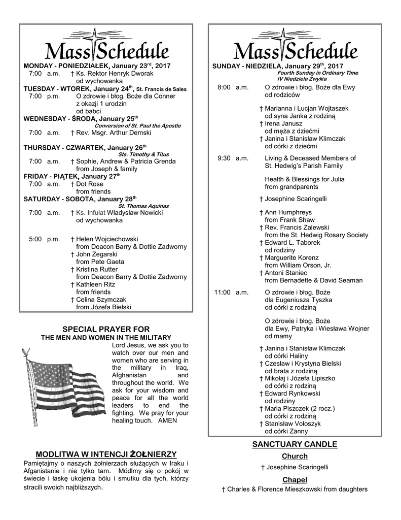 MONDAY - PONIEDZIAŁEK, January 23rd, 2017 7:00 a.m. † Ks. Rektor Henryk Dworak od wychowanka TUESDAY - WTOREK, January 24th, St. Francis de Sales 7:00 p.m. O zdrowie i błog. Boże dla Conner z okazji 1 urodzin od babci WEDNESDAY - ŚRODA, January 25th SUNDAY - NIEDZIELA, January 29th, 2017 Fourth Sunday in Ordinary Time IV Niedziela Zwykła 8:00 a.m. † Marianna i Lucjan Wojtaszek od syna Janka z rodziną † Irena Janusz od męża z dziećmi † Janina i Stanisław Klimczak od córki z dziećmi Conversion of St. Paul the Apostle 7:00 a.m. † Rev. Msgr. Arthur Demski THURSDAY - CZWARTEK, January 26th Sts. Timothy & Titus 7:00 a.m. † Sophie, Andrew & Patricia Grenda from Joseph & family FRIDAY - PIĄTEK, January 27th 7:00 a.m. † Dot Rose from friends SATURDAY - SOBOTA, January 28th 9:30 a.m. † Ks. Infułat Władysław Nowicki od wychowanka 5:00 p.m. † Helen Wojciechowski from Deacon Barry & Dottie Zadworny † John Zegarski from Pete Gaeta † Kristina Rutter from Deacon Barry & Dottie Zadworny † Kathleen Ritz from friends † Celina Szymczak from Józefa Bielski SPECIAL PRAYER FOR THE MEN AND WOMEN IN THE MILITARY Lord Jesus, we ask you to watch over our men and women who are serving in the military in Iraq, Afghanistan and throughout the world. We ask for your wisdom and peace for all the world leaders to end the fighting. We pray for your healing touch. AMEN MODLITWA W INTENCJI ŻOŁNIERZY Pamiętajmy o naszych żołnierzach służących w Iraku i Afganistanie i nie tylko tam. Módlmy się o pokój w świecie i łaskę ukojenia bólu i smutku dla tych, którzy stracili swoich najbliższych. Living & Deceased Members of St. Hedwig’s Parish Family Health & Blessings for Julia from grandparents † Josephine Scaringelli St. Thomas Aquinas 7:00 a.m. O zdrowie i błog. Boże dla Ewy od rodziców † Ann Humphreys from Frank Shaw † Rev. Francis Zalewski from the St. Hedwig Rosary Society † Edward L. Taborek od rodziny † Marguerite Korenz from William Orson, Jr. † Antoni Staniec from Bernadette & David Seaman 11:00 a.m. O zdrowie i błog. Boże dla Eugeniusza Tyszka od córki z rodziną O zdrowie i błog. Boże dla Ewy, Patryka i Wiesława Wojner od mamy † Janina i Stanisław Klimczak od córki Haliny † Czesław i Krystyna Bielski od brata z rodziną † Mikołaj i Józefa Lipiszko od córki z rodziną † Edward Rynkowski od rodziny † Maria Piszczek (2 rocz.) od córki z rodziną † Stanisław Voloszyk od córki Zanny SANCTUARY CANDLE Church † Josephine Scaringelli Chapel † Charles & Florence Mieszkowski from daughters III NIEDZIELA ZWYKŁA - Mt 4,12-23: Gdy Jezus posłyszał, że Jan został uwięziony, usunął się do Galilei. Opuścił jednak Nazaret, przyszedł i osiadł w Kafarnaum nad jeziorem, na pograniczu Zabulona i Neftalego. Tak miało się spełnić słowo proroka Izajasza: Ziemia Zabulona i ziemia Neftalego, Droga morska, Zajordanie, Galilea pogan! Lud, który siedział w ciemności, ujrzał światło wielkie, i mieszkańcom cienistej krainy śmierci światło wzeszło. Odtąd począł Jezus nauczać i mówić: Nawracajcie się, albowiem bliskie jest królestwo niebieskie. Gdy Jezus przechodził obok Jeziora Galilejskiego, ujrzał dwóch braci: Szymona, zwanego Piotrem, i brata jego, Andrzeja, jak zarzucali sieć w jezioro; byli bowiem rybakami. I rzekł do nich: Pójdźcie za Mną, a uczynię was rybakami ludzi. Oni natychmiast zostawili sieci i poszli za Nim. A gdy poszedł stamtąd dalej, ujrzał innych dwóch braci, Jakuba, syna Zebedeusza, i brata jego, Jana, jak z ojcem swym Zebedeuszem naprawiali w łodzi swe sieci. Ich też powołał. A oni natychmiast zostawili łódź i ojca i poszli za Nim. I obchodził Jezus całą Galileę, nauczając w tamtejszych synagogach, głosząc Ewangelię o królestwie i lecząc wszelkie choroby i wszelkie słabości wśród ludu. Św. Mateusz zawsze stara się porównywać wydarzenia z życia Jezusa z tym, co prorocy przepowiedzieli o Mesjaszu, więc rozpoczynając opowiadanie o Jego działalności apostolskiej, przytacza proroctwo Izajasza dotyczące „ziemi Zabulona i Neftalego”, gdzie Mistrz w owym czasie przebywał. „Lud, który siedział w ciemności, ujrzał światło wielkie i mieszkańcom cienistej krainy śmierci światło wzeszło”. Mateusz widział, jak to proroctwo spełniało się w jego oczach. Światłem, które oświeciło Galileję, a stamtąd rozlało się na cały świat, jest Chrystus. Mateusz poznał Go, poszedł za Nim i słuchał Go, a teraz chce przekazać całemu światu tę radosną nowinę. Jezus począł nauczać i mówić: „Nawracajcie się, albowiem bliskie jest królestwo niebieskie”. Orędzie nagli; trzeba je szybko rozgłaszać, bo Królestwo, które Chrystus przyszedł założyć, jest przeznaczone dla wszystkich ludzi i już się zbliża. Potwierdza to przepowiadanie Jezusa ukierunkowane całkowicie na nawracanie i zbawianie. Potwierdzają je cuda, jakich dokonuje „lecząc wszelkie choroby i wszelkie słabości wśród ludu”, uzdrowienie bowiem ciała jest „znakiem” tego głębszego, jakiego pragnie dokonać w duszach. Stwierdza to również wybór i powołanie pierwszych uczniów, których Jezus chciał mieć jako współpracowników swej posługi zbawienia. Mateusz wymienia czterech: Szymona i Andrzeja, Jakuba i Jana. Dwaj z nich poznali już Mistrza, kiedy wskazał im Go Chrzciciel na brzegach Jordanu, i natychmiast poszli za Nim. Teraz sam Jezus zaprasza ich, stojących nad jeziorem, by łowić ryby ze swoimi braćmi: „Pójdźcie za Mną, a uczynię was rybakami ludzi. Oni natychmiast zostawili sieci i poszli za Nim”, Bóg powołuje nie tylko raz w życiu; ponawia On swoje wezwania zobowiązująco i coraz natarczywiej. Teraz nie chodzi o to, by iść za Jezusem, lecz by stać się, naśladując Go, „rybakami ludzi”. Odpowiedź jest natychmiastowa jak pierwszy raz, lecz ubogacona wielkodusznym porzuceniem sieci, łodzi, a nawet ojca, któ