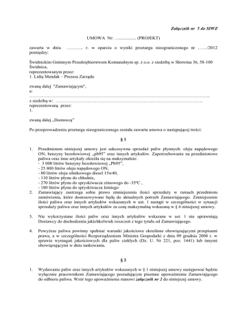 Załącznik nr 5 do SIWZ UMOWA Nr: …............... (PROJEKT) zawarta w dniu pomiędzy: ……….. r. w oparciu o wyniki przetargu nieograniczonego nr ……/2012 Świdnickim Gminnym Przedsiębiorstwem Komunalnym sp. z o.o. z siedzibą w Słotwina 36, 58-100 Świdnica, reprezentowanym przez: 1. Lidię Mendak – Prezesa Zarządu zwaną dalej "Zamawiającym", a: ……………………………………………………………………………………………………….. z siedzibą w: ……………………………………………………………………………………. reprezentowaną przez: 1. zwaną dalej „Dostawcą” Po przeprowadzeniu przetargu nieograniczonego została zawarta umowa o następującej treści: §1 1. 2. Przedmiotem niniejszej umowy jest sukcesywna sprzedaż paliw płynnych: oleju napędowego ON, benzyny bezołowiowej „pb95” oraz innych artykułów. Zapotrzebowanie na przedmiotowe paliwa oraz inne artykuły określa się na maksymalnie: - 3 000 litrów benzyny bezołowiowej „Pb95”, - 25 800 litrów oleju napędowego ON, - 80 litrów oleju silnikowego diesel 15w40, - 110 litrów płynu do chłodnic, - 270 litrów płynu do spryskiwacza zimowego do -35ºC , - 180 litrów płynu do spryskiwacza letniego Zamawiający zastrzega sobie prawo zmniejszenia ilości sprzedaży w ramach przedmiotu zamówienia, które dostosowywane będą do aktualnych potrzeb Zamawiającego. Zmniejszenie ilości paliwa oraz innych artykułów wskazanych w ust. 1 nastąpi w szczególności w sytuacji sprzedaży paliwa oraz innych artykułów za cenę maksymalną wskazaną w § 6 niniejszej umowy. 3. Nie wykorzystane ilości paliw oraz innych artykułów wskazane w ust. 1 nie uprawniają Dostawcy do dochodzenia jakichkolwiek roszczeń z tego tytułu od Zamawiającego. 4. Powyższe paliwa powinny spełniać warunki jakościowe określone obowiązującymi przepisami prawa, a w szczególności Rozporządzeniem Ministra Gospodarki z dnia 09 grudnia 2008 r. w sprawie wymagań jakościowych dla paliw ciekłych (Dz. U. Nr 221, poz. 1441) lub innymi obowiązującymi w dniu tankowania. §2 1. Wydawanie paliw oraz innych artykułów wskazanych w § 1 niniejszej umowy następować będzie wyłącznie pracownikom Zamawiającego posiadającym pisemne upoważnienie Zamawiającego do odbioru paliwa. Wzór tego upoważnienia stanowi załącznik nr 2 do niniejszej umowy. 2. Tankowanie pojazdów Zamawiającego odbywać się będzie na terenie stacji benzynowej Dostawcy i odbywać się będzie tylko do zbiorników pojazdów oraz wyjątkowo do kanistrów za okazaniem pisemnego upoważnienia Zamawiającego do odbioru paliw. Wykaz pojazdów Zamawiającego uprawnionych do tankowania paliw stanowi załącznik nr 1 do niniejszej umowy. Wzór upoważnienia stanowi załącznik nr 3 do niniejszej umowy. 3. Dowodami wydania paliw oraz innych artykułów będzie faktura VAT wystawiona przez Dostawcę określająca rodzaj paliwa, ilość paliwa, datę i godzinę pobrania paliwa, datę wystawienia dokumentu, numer rejestracyjny pojazdu tankowanego lub numer upoważnienia, kiedy pobrano paliwo do kanistrów, cenę detaliczną paliwa, podpis czytelny osoby uprawnionej do pobrania paliwa, podpis osoby wystawiającej dokument. §3 Sprzedaż realizowana będzie z należytą starannością, sukcesywnie zgodnie z potrzebami Zamawiającego do wyczerpania przedmiotu umowy. §4 Umowa zostaje zawarta na czas określony od dnia ………………2012r. do dnia wydania w całości paliwa oraz innych artykułów wskazanych w § 1 lecz nie później niż do dnia……………………..2015r. §5 1. Strony postanawiają, że osobą uprawnioną i zobowiązaną do nadzorowania prawidłowej realizacji niniejszej umowy są: - z ramienia Zamawiającego: …………………………………….., nr tel…………………… - z ramienia Dostawcy : ……………………………..………, nr tel……………………. 2. Zmiana osób, o których mowa w ust. 1 nie będzie powodowała konieczności zmiany umowy. Strony o takiej zmianie będą informowały odrębnym pismem. §6 1. Wartość zamówienia będącego przedmiotem umowy określonego w § 1 wynosi maksymalnie …………………………….. zł brutto, (słownie zł: ………………………………………………………………………………………………) i jest zgodna z ceną wskazaną w ofercie w tym podatek VAT…………………………………, zaś wartość netto wynosi …………………… zł (słownie zł: …………………………………………………………………………………..). 2. Płatnikiem należności za sprzedaż przedmiotu zamówienia będzie Świdnickie Gminne Przedsiębiorstwo Komunalne Sp. z o.o. w Słotwinie 36. 3. 1. Zamawiający dopuszcza możliwość zmiany wartości zamówienia wskazanego w ust. 1 przez Dostawcę o ile wystąpią czynniki zewnętrzne, niezależne od Wykonawcy i nie dające się przewidzieć w dniu złożenia oferty mające wpływ na zmianę ceny. §7 Faktury płatne będą w ciągu 14 dni od daty otrzymania faktury na konto Dostawcy podane na fakturze. Ceny za produkty pobrane przez Zamawiającego będą naliczane wg cen obowiązujących w dniu tankowania na stacji z uwzględnieniem stałego rabatu w wysokości …… % na każde zakupy Cena sprzedaży obliczona zgodnie ze zdaniem poprzednim będzie podstawą do wystawienia faktury VAT obciążającej Zamawiającego za zakupione (pobrane) produkty. 2. Upoważnia się Dostawcę do wystawienia faktur bez podpisu Zamawiającego. NIP Zamawiającego 8842663863, NIP Dostawcy ………………….. §8 1. Dostawca jest obowiązany wydać Zamawiającemu na jego żądanie certyfikat jakości paliwa. 2. W zakresie reklamacji związanej z niewłaściwą jakością paliw obowiązują następujące zasady: reklamacja powinna być złożona na piśmie i powinna zawierać uzasadnienie reklamacji oraz żądanie Zama