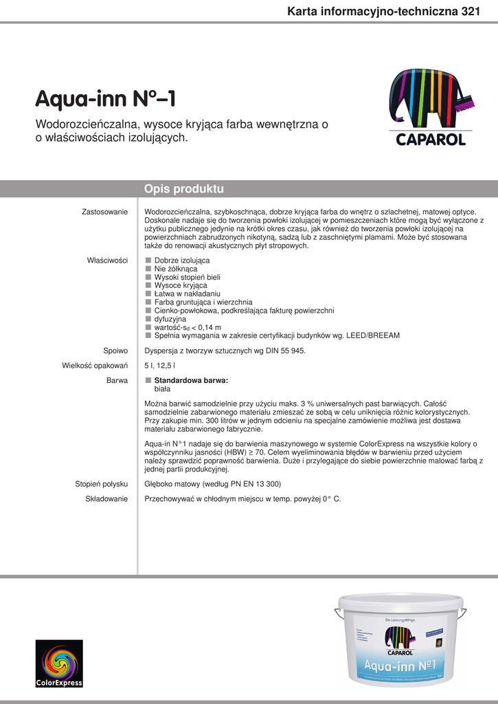 Karta informacyjno-techniczna 321 Aqua-inn Nº–1 Wodorozcieńczalna, wysoce kryjąca farba wewnętrzna o o właściwościach izolujących. Opis produktu Zastosowanie Właściwości Spoiwo Wielkość opakowań Barwa Wodorozcieńczalna, szybkoschnąca, dobrze kryjąca farba do wnętrz o szlachetnej, matowej optyce. Doskonale nadaje się do tworzenia powłoki izolującej w pomieszczeniach które mogą być wyłączone z użytku publicznego jedynie na krótki okres czasu, jak również do tworzenia powłoki izolującej na powierzchniach zabrudzonych nikotyną, sadzą lub z zaschniętymi plamami. Może być stosowana także do renowacji akustycznych płyt stropowych. ■ ■ ■ ■ ■ ■ ■ ■ ■ ■ Dobrze izolująca Nie żółknąca Wysoki stopień bieli Wysoce kryjąca Łatwa w nakładaniu Farba gruntująca i wierzchnia Cienko-powłokowa, podkreślająca fakturę powierzchni dyfuzyjna wartość-sd < 0,14 m Spełnia wymagania w zakresie certyfikacji budynków wg. LEED/BREEAM Dyspersja z tworzyw sztucznych wg DIN 55 945. 5 l, 12,5 l ■ Standardowa barwa: biała Można barwić samodzielnie przy użyciu maks. 3 % uniwersalnych past barwiących. Całość samodzielnie zabarwionego materiału zmieszać ze sobą w celu uniknięcia różnic kolorystycznych. Przy zakupie min. 300 litrów w jednym odcieniu na specjalne zamówienie możliwa jest dostawa materiału zabarwionego fabrycznie. Aqua-in N°1 nadaje się do barwienia maszynowego w systemie ColorExpress na wszystkie kolory o współczynniku jasności (HBW) ≥ 70. Celem wyeliminowania błędów w barwieniu przed użyciem należy sprawdzić poprawność barwienia. Duże i przylegające do siebie powierzchnie malować farbą z jednej partii produkcyjnej. Stopień połysku Składowanie Głęboko matowy (według PN EN 13 300) Przechowywać w chłodnym miejscu w temp. powyżej 0° C. Karta informacyjno-techniczna 321 Dane Techniczne Własności wg normy PN EN 13300: Barwienie może w nieznacznym stopniu zmieniać parametry techniczne farby. ■Klasa odporności na Klasa 1. szorowanie na mokro: ■Zdolność krycia: Zdolność krycia (wsp. kontrastu): Klasa 1 przy wydajności 6 m2 /l tj. ok. 150 ml/m2 ■Największy rozmiar drobna (< 100 µm) ziarna: ■Gęstość: ok. 1,37 g/cm³ Klasyfikacja według karty technicznej nr 606 Obszary zastosowania: wewnętrzne typ 1 wewnętrzne typ 2 wewnętrzne typ 3 zewnętrzne typ 1 zewnętrzne typ 2 + + ○ – – (–) nie nadaje się / (○) nadaje się warunkowo / (+) nadaje się Sposób użycia Odpowiednie podłoża Przygotowanie podłoża Podłoże musi być nośne, suche, czyste oraz pozbawione substancji zmniejszających przyczepność. Mocne, słabo chłonne podłoża jak również nośne matowe powłoki z farb dyspersyjnych malować bez wcześniejszego przygotowania. Podłoża piaszczące, silnie chłonne, miękkie miejsca szpachlowania gipsem, wzmocnić środkiem Caparol-Tiefgrund TB lub Amphisilan- Putzfestiger. Powierzchnie zaplamione nikotyną lub sadzą: Zmyć wodą z dodatkiem detergentów rozpuszczających tłuszcze. Malować po wyschnięciu. Zaschnięte plamy z wody: W szczególnych przypadkach działanie izolujące farby Aqua-inn No1 może okazać się niewystarczające. W takiej sytuacji wykonać malowanie próbne i w razie konieczności nanieść kolejną powłokę izolująca z materiału Caparol AquaSperrgrund, Disbon 481 EP-Uniprimer lub Capacryl HolzIsogrund (karty techniczne nr. 384, 481, 961). Zaschnięte plamy z wody wyczyścić szczotką na sucho. Przebarwienia na płytach gipsowych: Nanosić bezpośrednio bez dodatkowego przygotowania podłoża. Renowacja powierzchni malowanych Aqua-in Nr.1: Aqua-inn Nr.1 można stosować w ramach renowacji powtórnie. W wypadku tapetowania powierzchni malowanych farbą Aqua-inn Nr.1 zastosować jako warstwę pośrednią Caparol Haftgrund bądź Caparol AquaSperrgrund. Uzupełnianie drobnych ubytków: Po odpowiednim przygotowaniu uzupełniać szpachlówkami Caparol-Akkordspachtel lub AkkordLeichtspachtel, w razie potrzeby miejsca naprawione zagruntować. Sposób nakładania Nakładać pędzlem, wałkiem lub natryskiwać urządzeniami airless Natrysk airless: Kat natrysku: 40–50° Dysza: 0,019–0,021" Ciśnienie: ok. 200 bar Układ warstw Zużycie Warunki obróbki Czas schnięcia Obfite, równomierne malowanie nierozcieńczoną Aqua-in Nr.1. Na podłożach kontrastowych jak również powierzchniach silnie zabrudzonych, konieczne jest wykonanie warstwy podkładowej bądź pośredniej farbą Aqua-in No1 rozcieńczoną maks. 5% wody. Na powierzchniach nierównomiernie chłonnych zastosować warstwę gruntującą AquaSperrgrund lub Caparol-Haftgrund. Ok. 150 ml/m2 przy jednokrotnym malowaniu na gładkich powierzchniach. Na powierzchniach chropowatych odpowiednio więcej. Dokładne zużycie można ustalić wyłącznie w praktyce przez malowanie próbne. Minimalna temperatura stosowania i wysychania farby: +5° C (otoczenia, podłoża i materiału). Aby uzyskać optymalny efekt powłoki izolującej obowiązuje minimalna temperatura +16° C. W temp. +20°C i względnej wilgotności powietrza 65% warstwa jest powierzchniowo sucha po 4 - 6 godz., a do powtórnego malowania nadaje się po 12 godzinach. Powłoka jest całkowicie sucha i w pełni wytrzymała na obciążenia po ok. 3 dniach. W niższych temperaturach i przy wyższej wilgotności powietrza czasy te ulegają wydłużeniu. Karta informacyjno-techniczna 321 Wskazówka W celu uniknięcia różnic kolorystycznych na złączach pasm roboczych, większe powierzchnie należy malować w jednym cyklu roboczym metodą „mokre na mokre”. W przypadku malowania zanieczyszczonych powierzchni ze względu na różnorodność zanieczyszczeń występujących w podłożu zalecamy wykonanie próby na danej powierzchni. Farba Aqua-inn No1 nie nadaje się do zastosowania w pomieszczeniach wilgotnych i/lub narażonych na długotrwałe działanie pary wodnej. Przed natryskiwaniem Airless farbę należy dobrz