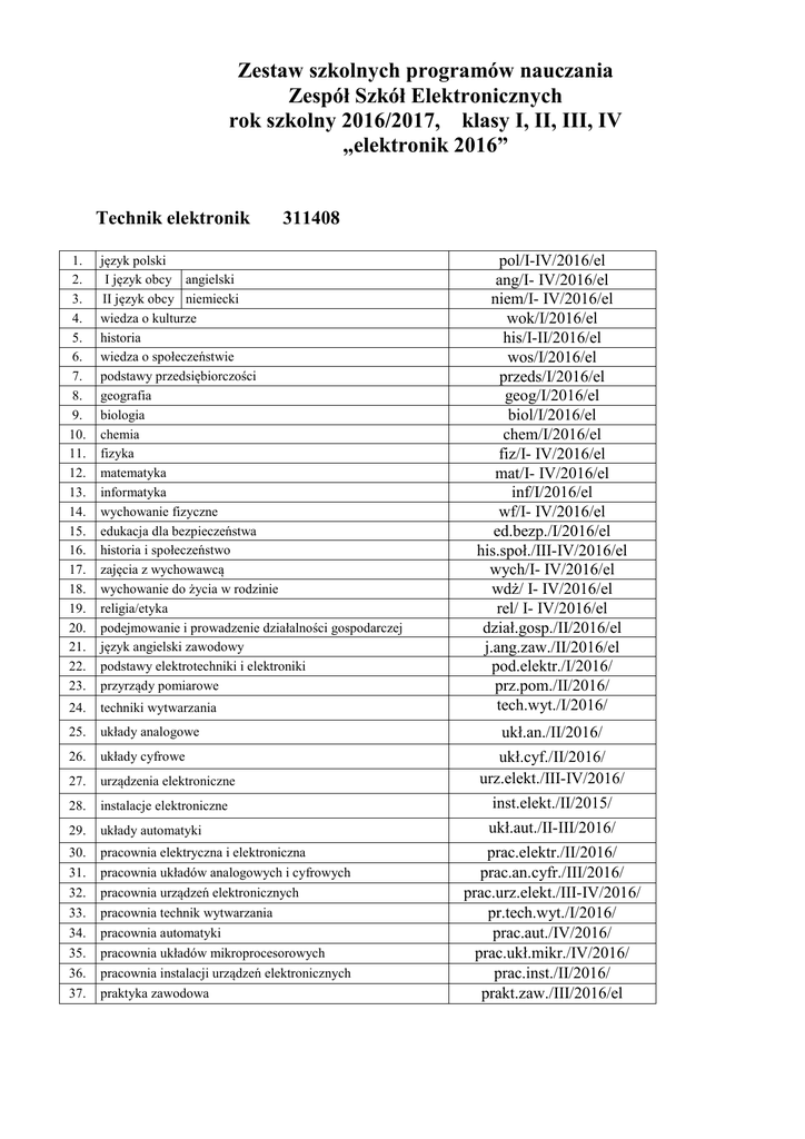 Zestaw szkolnych programów nauczania Zespół Szkół Elektronicznych rok szkolny 2016/2017, klasy I, II, III, IV „elektronik 2016” Technik elektronik 311408 pol/I-IV/2016/el ang/I- IV/2016/el niem/I- IV/2016/el wok/I/2016/el his/I-II/2016/el wos/I/2016/el przeds/I/2016/el geog/I/2016/el biol/I/2016/el chem/I/2016/el fiz/I- IV/2016/el mat/I- IV/2016/el inf/I/2016/el wf/I- IV/2016/el ed.bezp./I/2016/el his.społ./III-IV/2016/el wych/I- IV/2016/el wdż/ I- IV/2016/el rel/ I- IV/2016/el dział.gosp./II/2016/el j.ang.zaw./II/2016/el pod.elektr./I/2016/ prz.pom./II/2016/ tech.wyt./I/2016/ 1. 2. 3. 4. 5. 6. 7. 8. 9. 10. 11. 12. 13. 14. 15. 16. 17. 18. 19. 20. 21. 22. 23. język polski I język obcy angielski II język obcy niemiecki wiedza o kulturze historia wiedza o społeczeństwie podstawy przedsiębiorczości geografia biologia chemia fizyka matematyka informatyka wychowanie fizyczne edukacja dla bezpieczeństwa historia i społeczeństwo zajęcia z wychowawcą wychowanie do życia w rodzinie religia/etyka podejmowanie i prowadzenie działalności gospodarczej język angielski zawodowy podstawy elektrotechniki i elektroniki przyrządy pomiarowe 24. techniki wytwarzania 25. układy analogowe 26. układy cyfrowe 27. urządzenia elektroniczne ukł.cyf./II/2016/ urz.elekt./III-IV/2016/ 28. instalacje elektroniczne inst.elekt./II/2015/ 29. układy automatyki ukł.aut./II-III/2016/ 30. 31. pracownia elektryczna i elektroniczna pracownia układów analogowych i cyfrowych 32. 33. 34. 35. 36. 37. pracownia urządzeń elektronicznych pracownia technik wytwarzania pracownia automatyki pracownia układów mikroprocesorowych pracownia instalacji urządzeń elektronicznych praktyka zawodowa ukł.an./II/2016/ prac.elektr./II/2016/ prac.an.cyfr./III/2016/ prac.urz.elekt./III-IV/2016/ pr.tech.wyt./I/2016/ prac.aut./IV/2016/ prac.ukł.mikr./IV/2016/ prac.inst./II/2016/ prakt.zaw./III/2016/el Zestaw szkolnych programów nauczania Zespół Szkół Elektronicznych rok szkolny 2016/2017, klasy I, II, III, IV „informatyk 2016” Technik informatyk 351203 1. 2. 3. 4. 5. 6. 7. 8. 9. 10. 11. 12. 13. 14. 15. 16. 17. 18. 19. 20. 21. 22. 23. 24. 25. 26. 27. 28. 29. 30. 31. 32. 33. język polski I język obcy angielski II język obcy niemiecki wiedza o kulturze historia wiedza o społeczeństwie podstawy przedsiębiorczości geografia biologia chemia fizyka matematyka informatyka wychowanie fizyczne edukacja dla bezpieczeństwa historia i społeczeństwo zajęcia z wychowawcą wychowanie do życia w rodzinie religia/etyka podejmowanie i prowadzenie działalności gospodarczej język angielski zawodowy urządzenia techniki komputerowej sieci komputerowe systemy baz danych systemy operacyjne tworzenie stron internetowych pracownia urządzeń techniki komputerowej pracownia sieci komputerowych pracownia sieciowych systemów operacyjnych pracownia grafiki komputerowej pracownia baz danych pracownia aplikacji internetowych praktyka zawodowa pol/ I- IV/2016/inf ang/I- IV/2016/inf niem/I- IV/2016/inf wok/I/2016/inf his/I-II/2016/inf wos/I/2016/inf przeds/I/2016/inf geog/I/2016/inf biol/I/2016/inf chem/I/2016/inf fiz/I/2016/inf mat/I- IV/2016/inf inf/I-IV/2016/inf wf/I- IV/2016/inf ed.bezp./I/2016/inf his.społ./III-IV/2016/inf wych/I- IV/2016/inf wdż/I- IV/2016/inf rel/I- IV/2016/inf dział.gosp./II/2016/inf j.ang.zaw./II/2016/inf urz.tech./I-II/2016/ sieci/II-III/2016/ bazy/II-III/2016/ syst./I-II/2016/ str.int./II-IV/2016/ prac.urz.tech./I-II/2016/ prac.sieci/III/2016/ prac.syst./II/2016/ prac.graf./III-IV/2016/ prac.baz/III-IV/2016/ prac.ap.int./IV/2016/ prakt.zaw./III/2016/inf